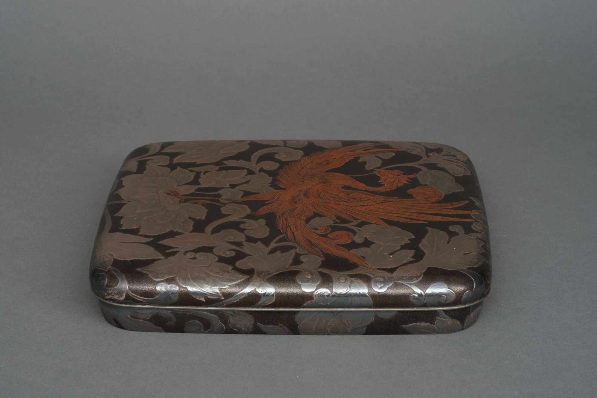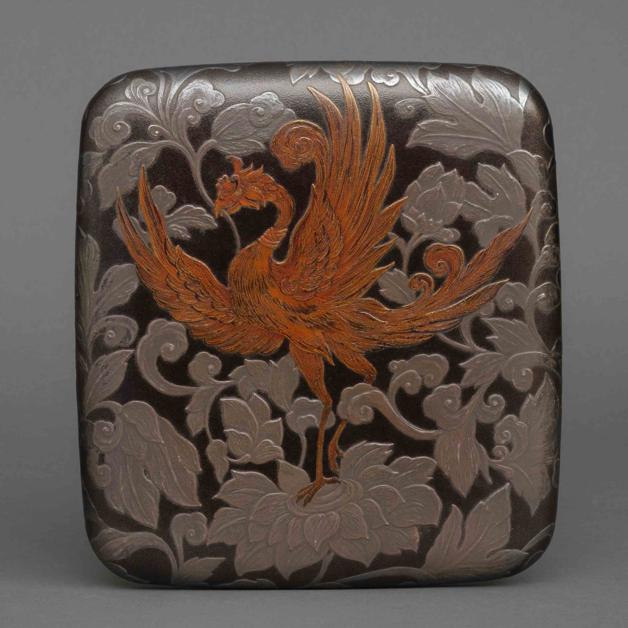 The lid is adorned with a majestic fiery orange phoenix 鳳凰 (hô’ô), standing tall with wings unfurled, positioned at the heart of a large flower surrounded by scrolling leaves and vines. The scrolling plant design continues onto the sides of the box.