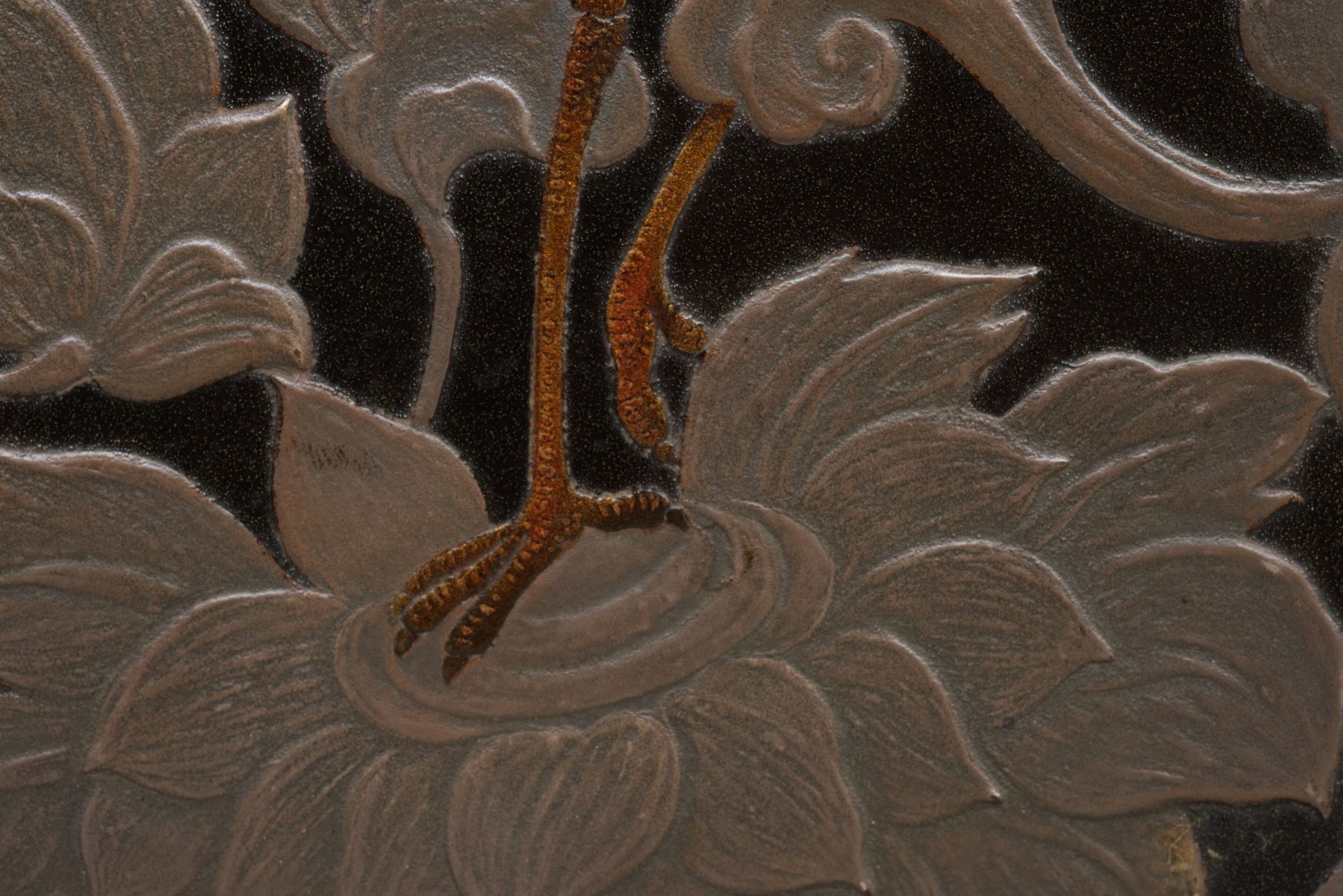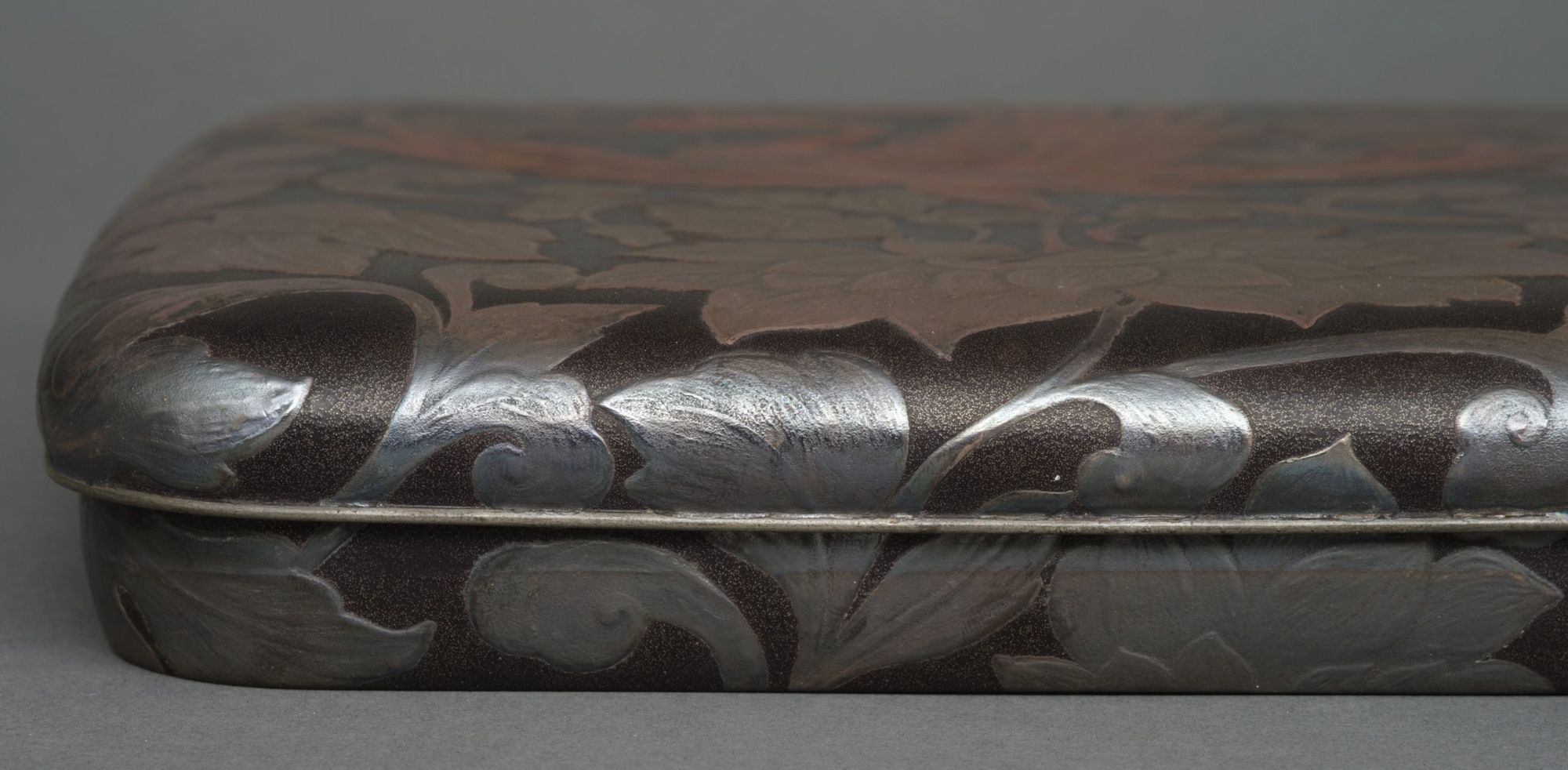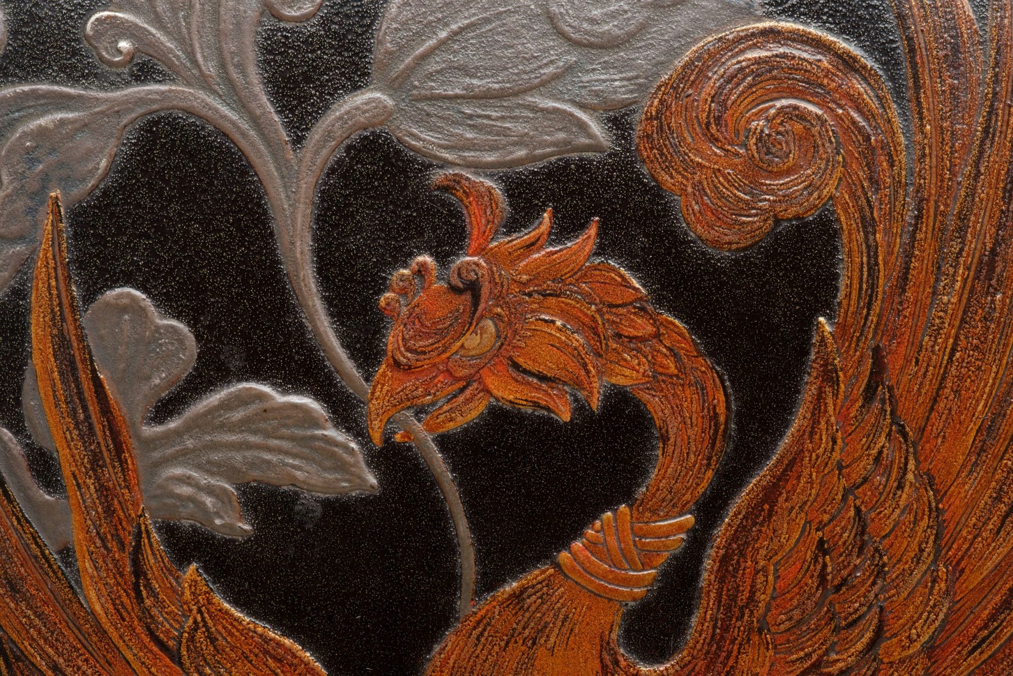 This exquisite artwork is rendered in polychrome and silver takamaki-e 高蒔絵 (high-relief lacquer design) on a textured black lacquer substrate reminiscent of leather.