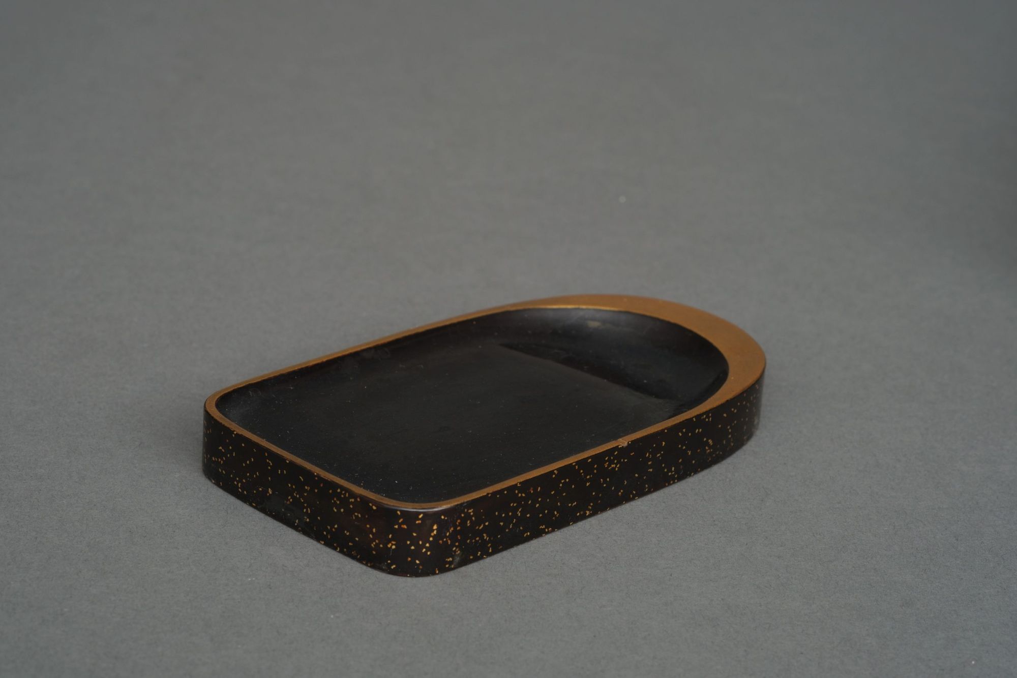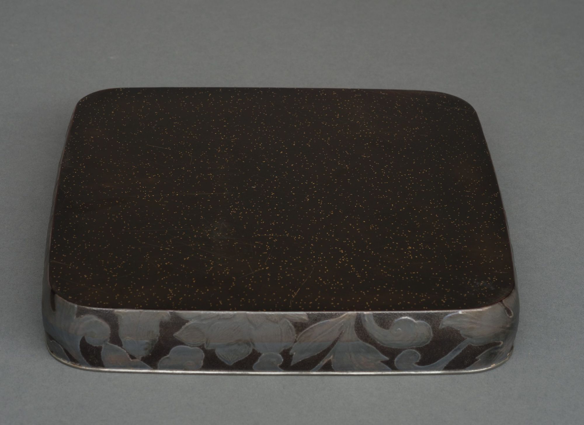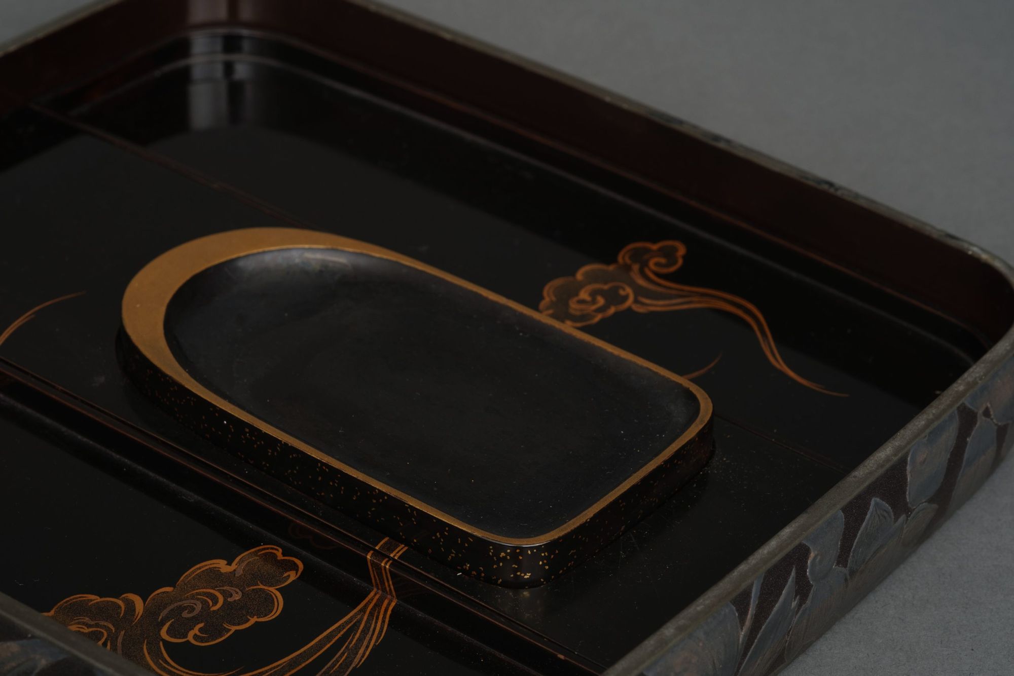 The box is fitted with three removable trays, one of which houses a lacquered inkstone 硯 (suzuri). The edges are lined with silver, and the underside is decorated with sparse golden nashiji 梨子地 (sprinkled gold lacquer).