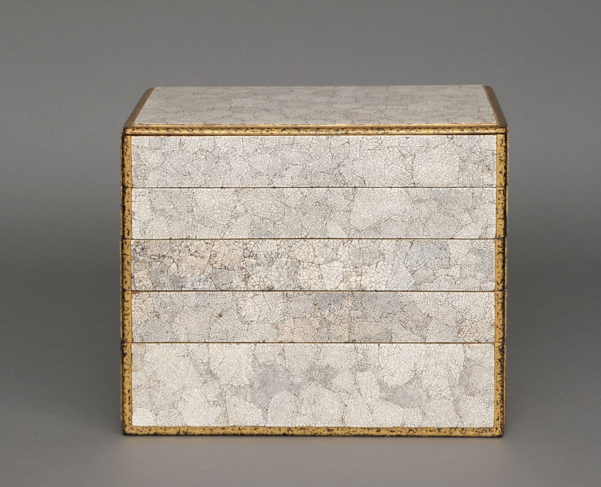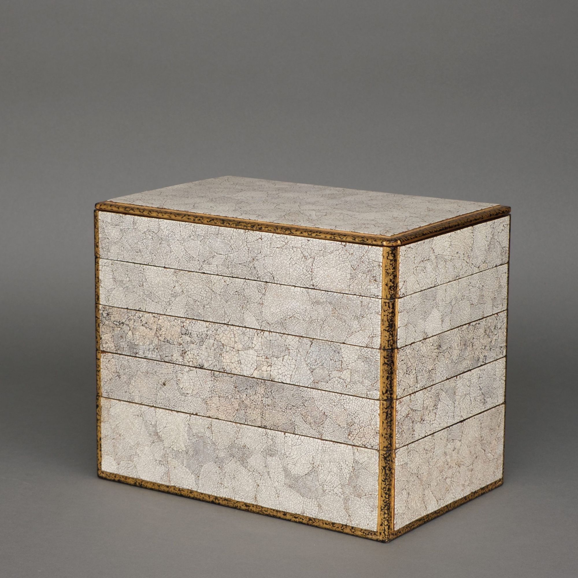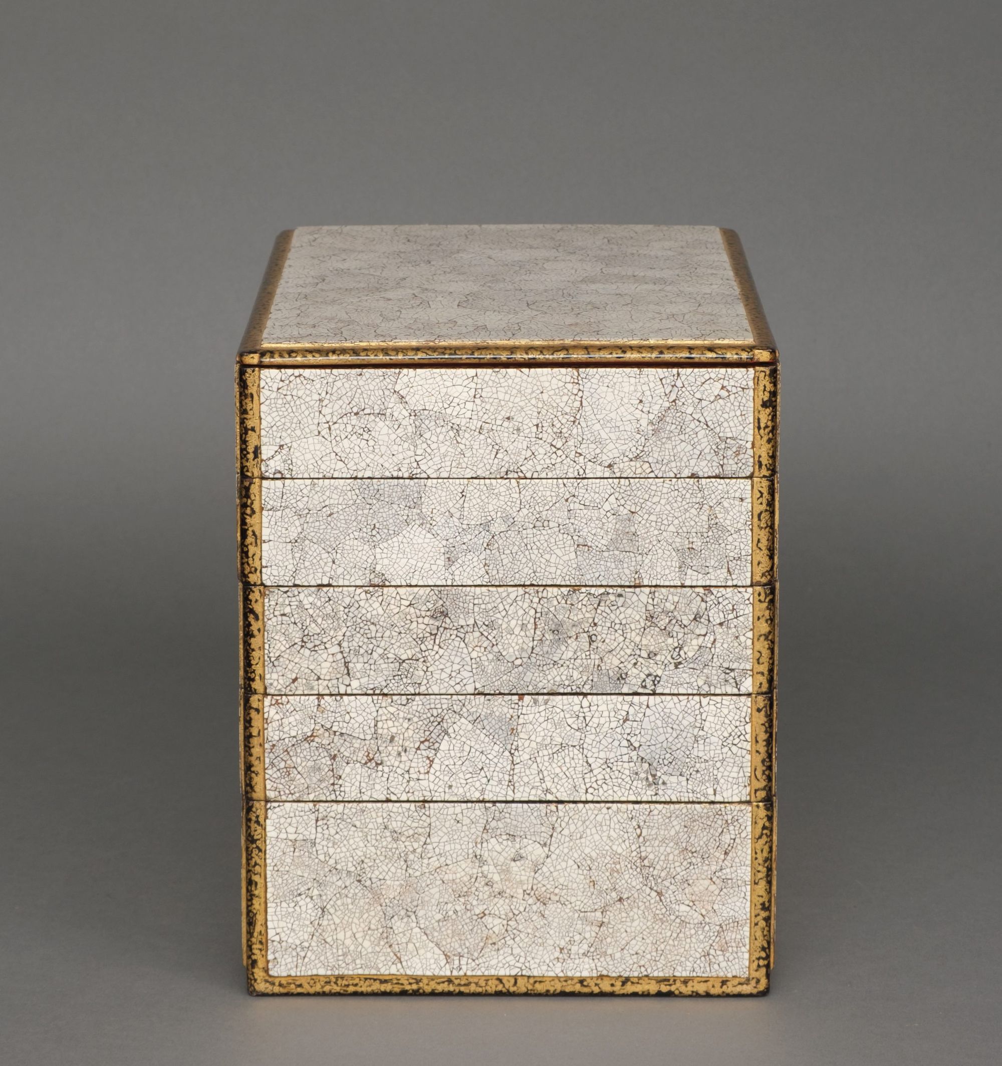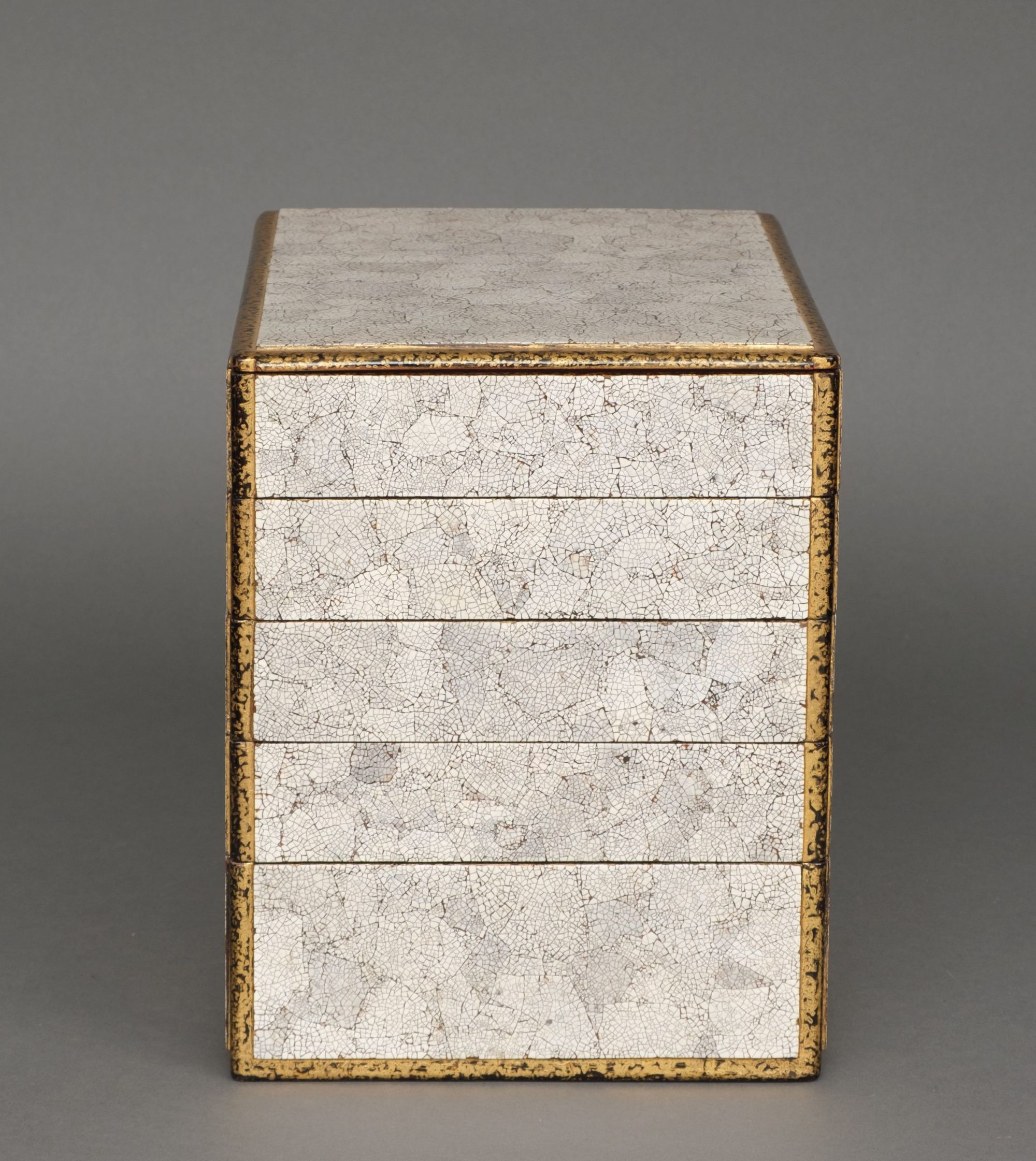 Amazing and rare 5-tiered jûbako 重箱 (food container/picnic box) of rectangular form richly inlaid to the exterior with bright white fine pieces of eggshell, also described as eggshell crackle lacquer 卵殻塗 (rankaku’nuri). The recessed edges lacquered with gilt over black ground. The interiors coated with red lacquer.