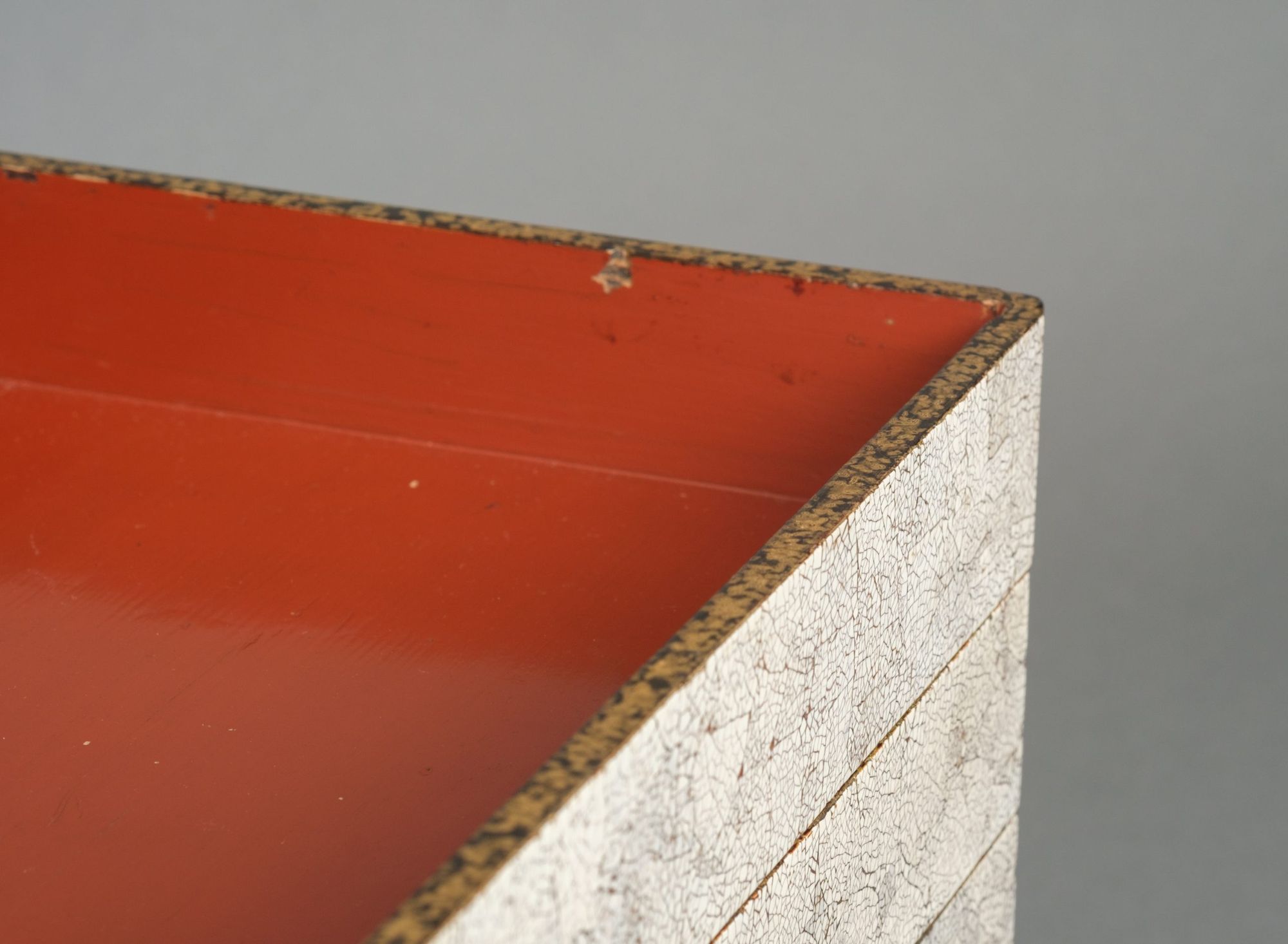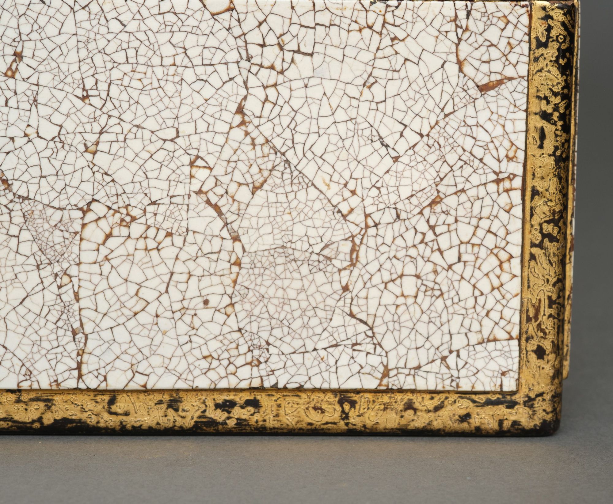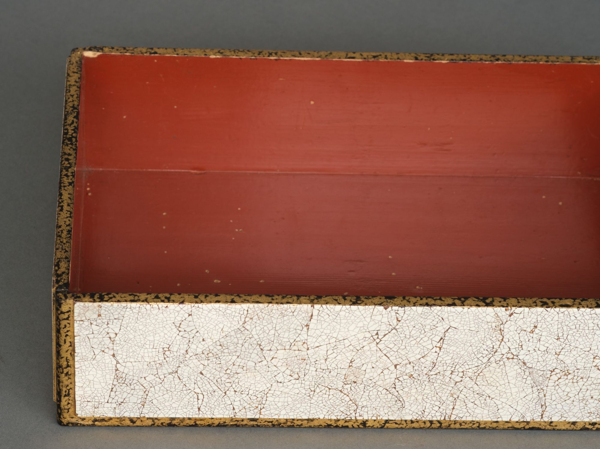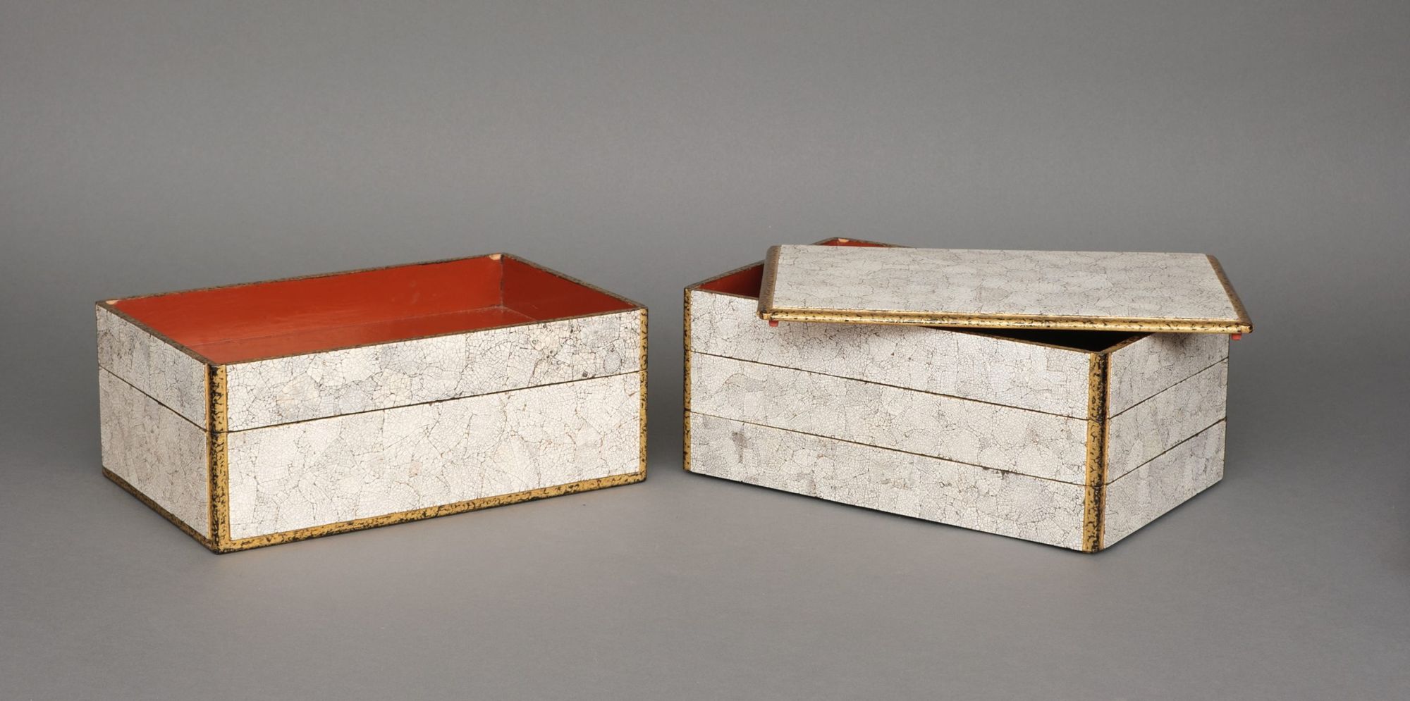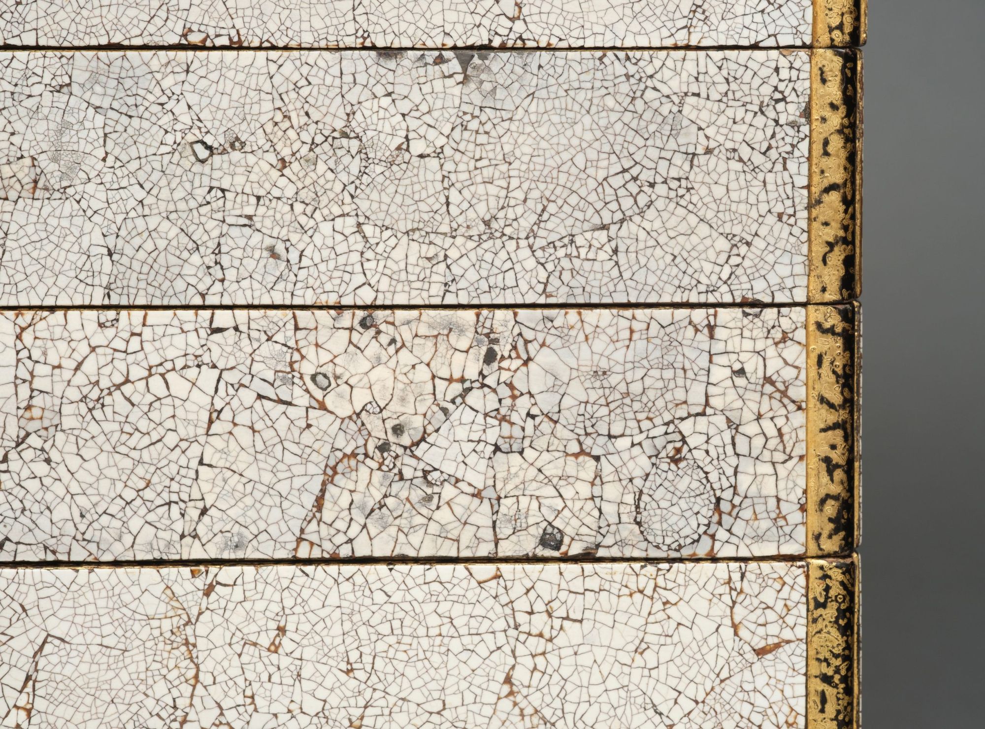 Amazing and rare 5-tiered jûbako 重箱 (food container/picnic box) of rectangular form richly inlaid to the exterior with bright white fine pieces of eggshell, also described as eggshell crackle lacquer 卵殻塗 (rankaku’nuri). The recessed edges lacquered with gilt over black ground. The interiors coated with red lacquer.