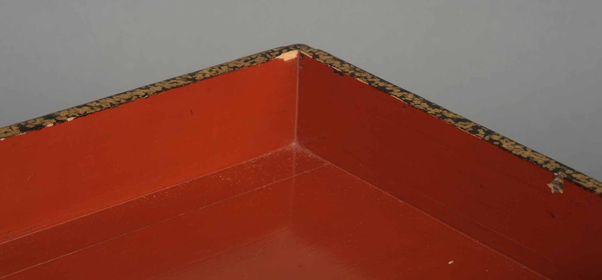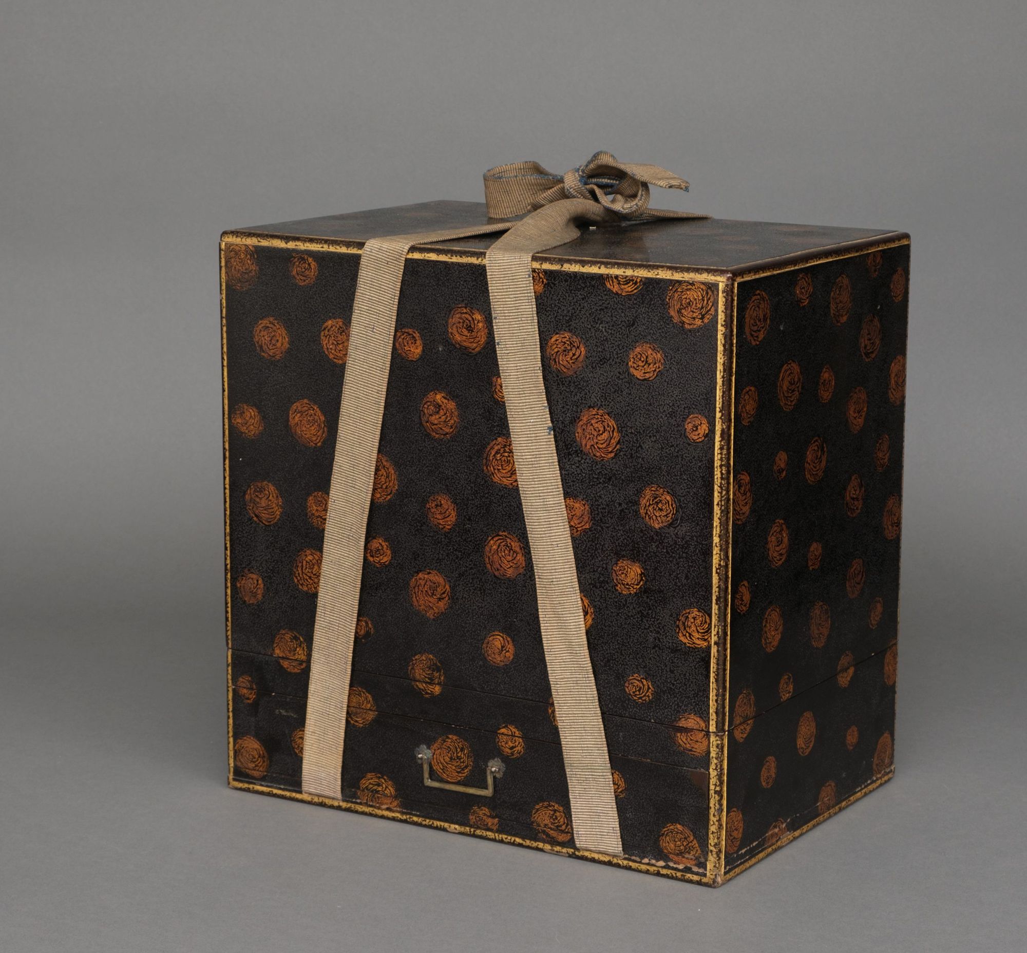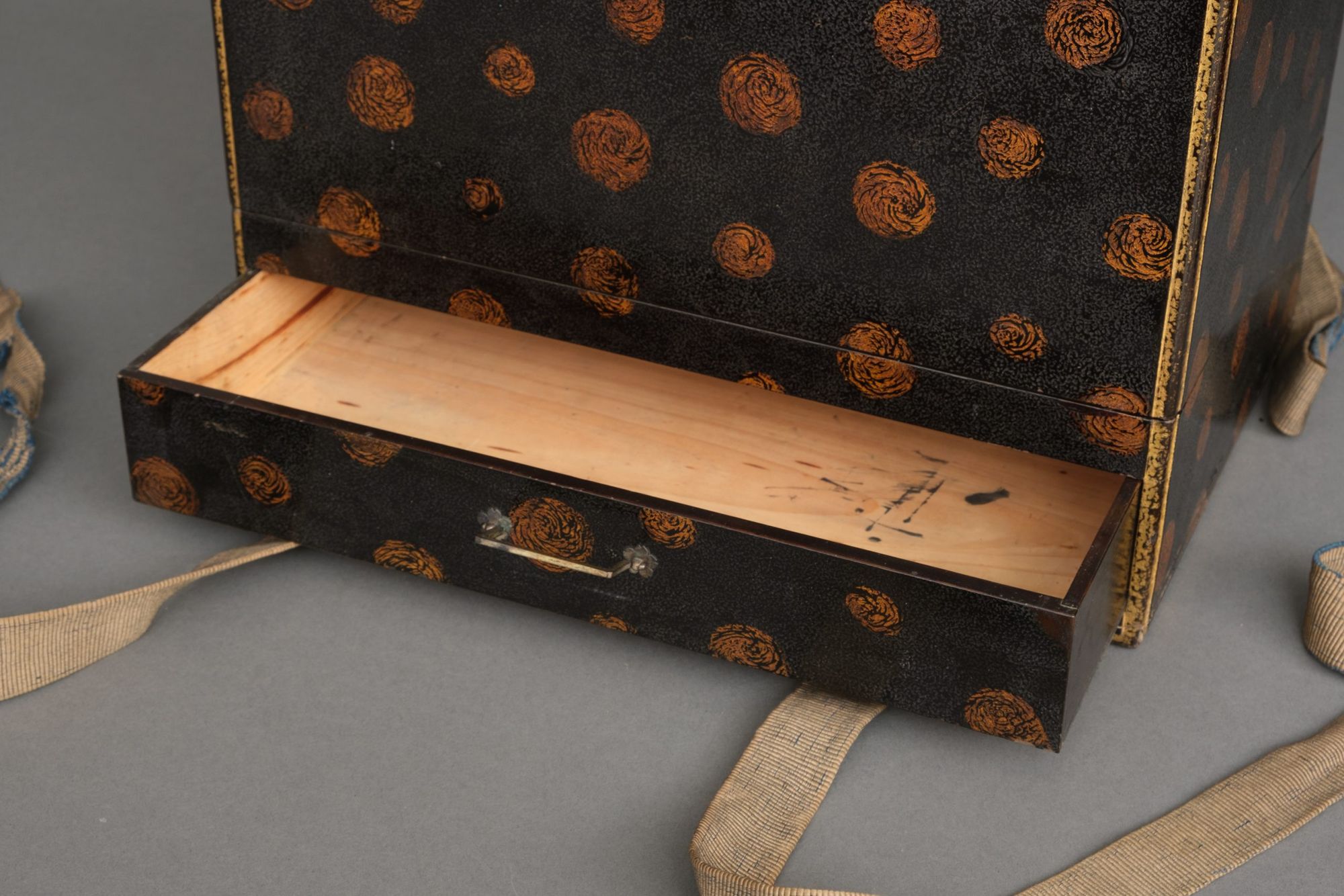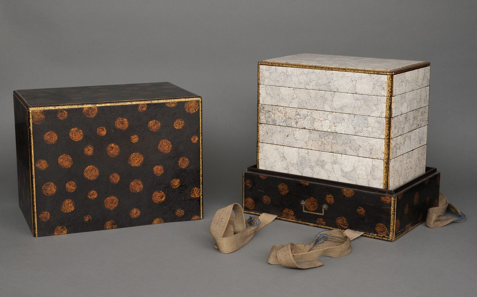 Accompanied by a high quality lacquered transportation box 供箱 (tomobako) bearing a textured black lacquer background with gilt dotted decoration, finished with matching recessed edges. The lower section with a drawer and set with a fabric belt for transportation.