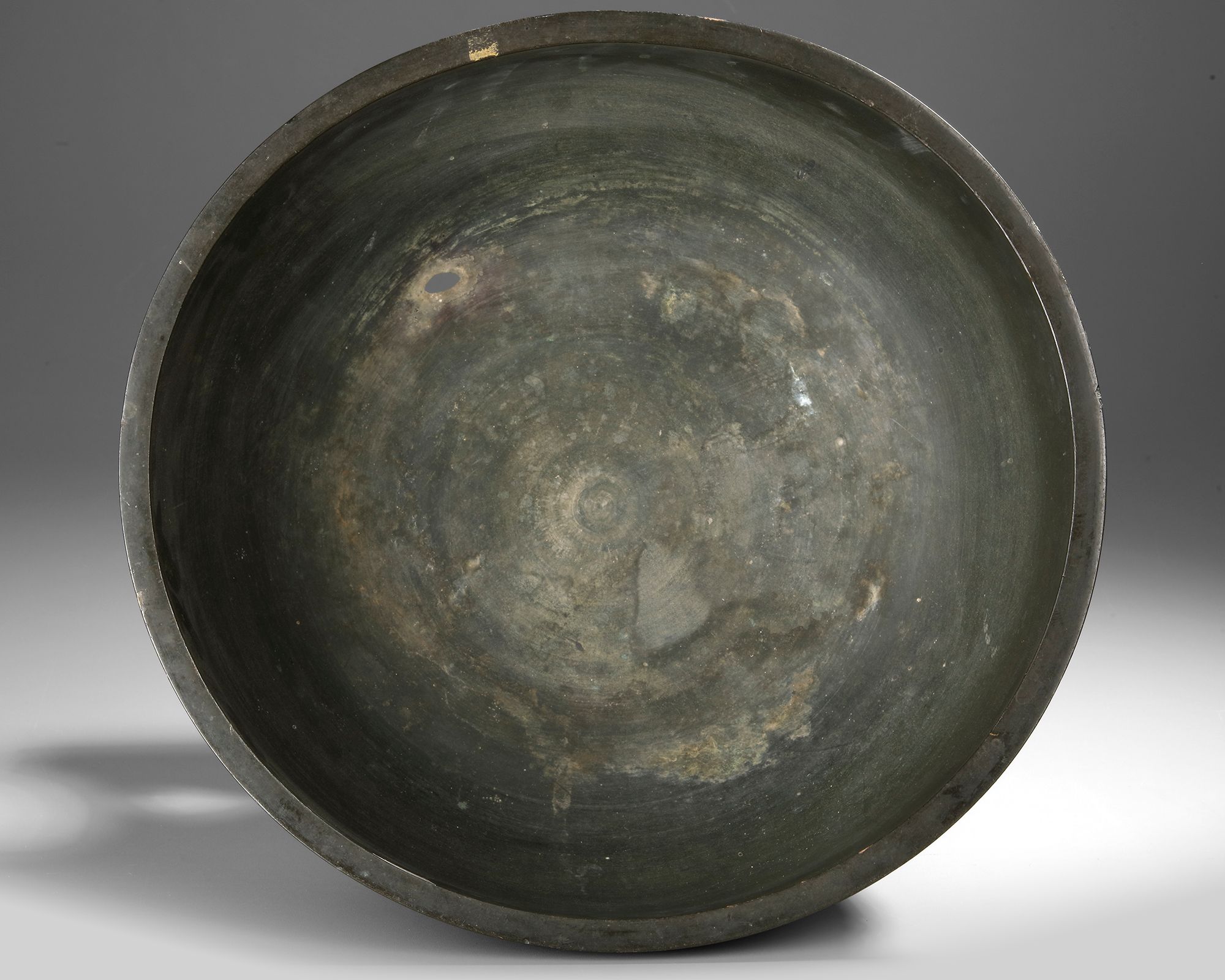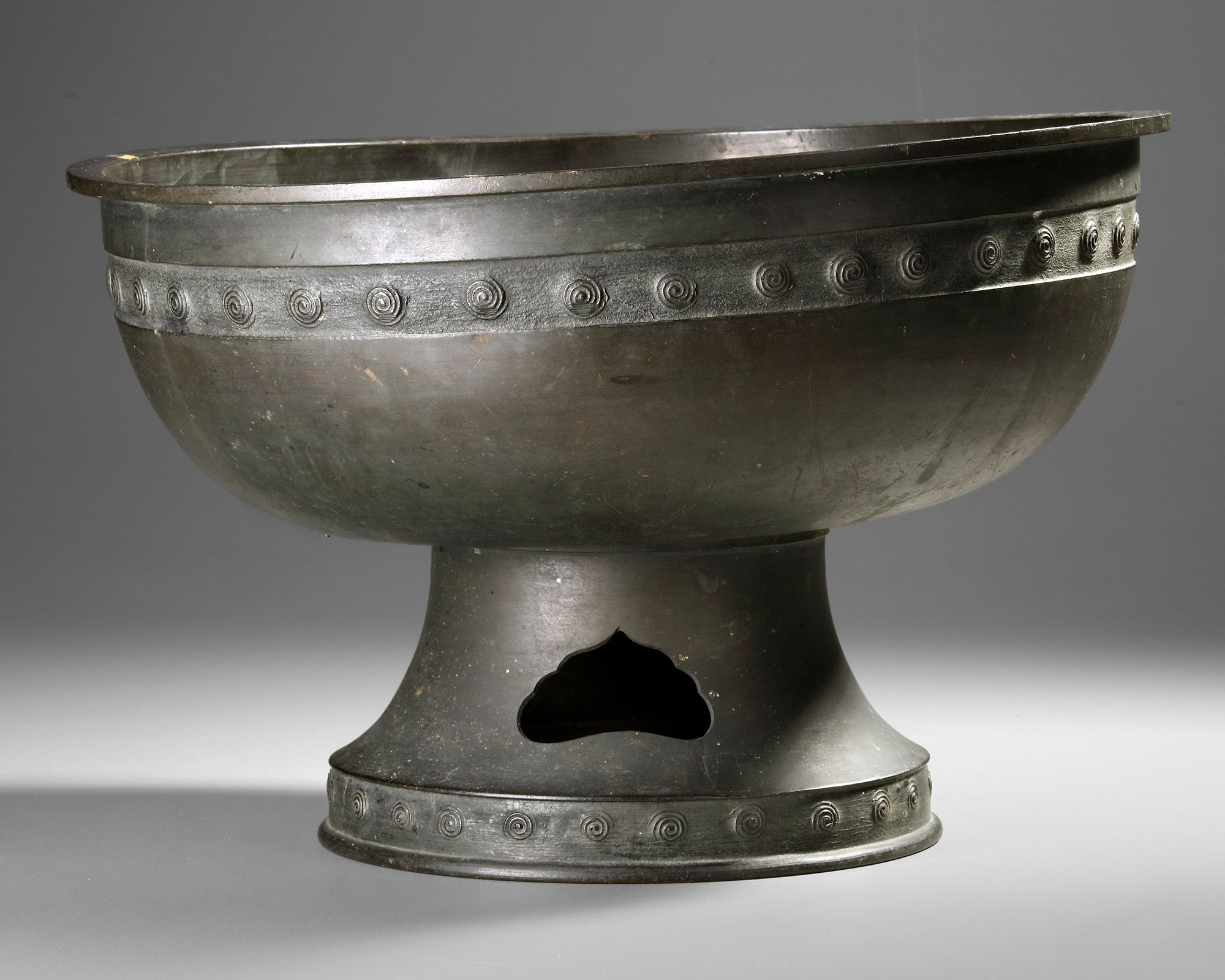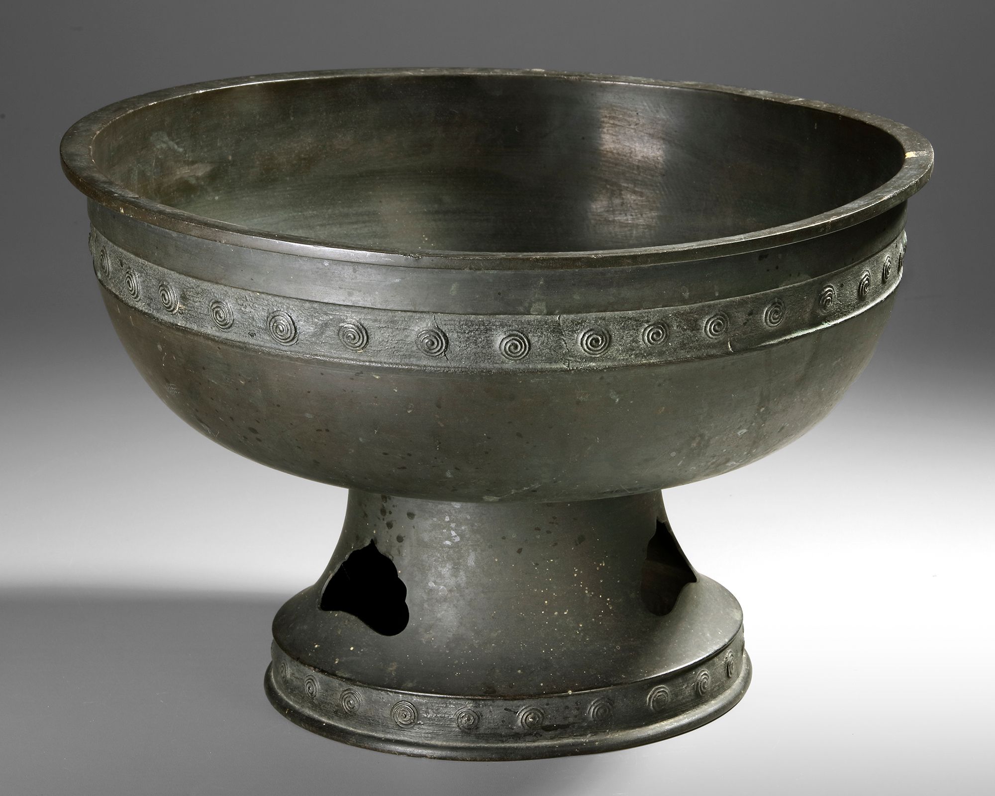 Bronze round water basin on a foot, at the outside decorated with spirals. 40 by 25.5 cm.