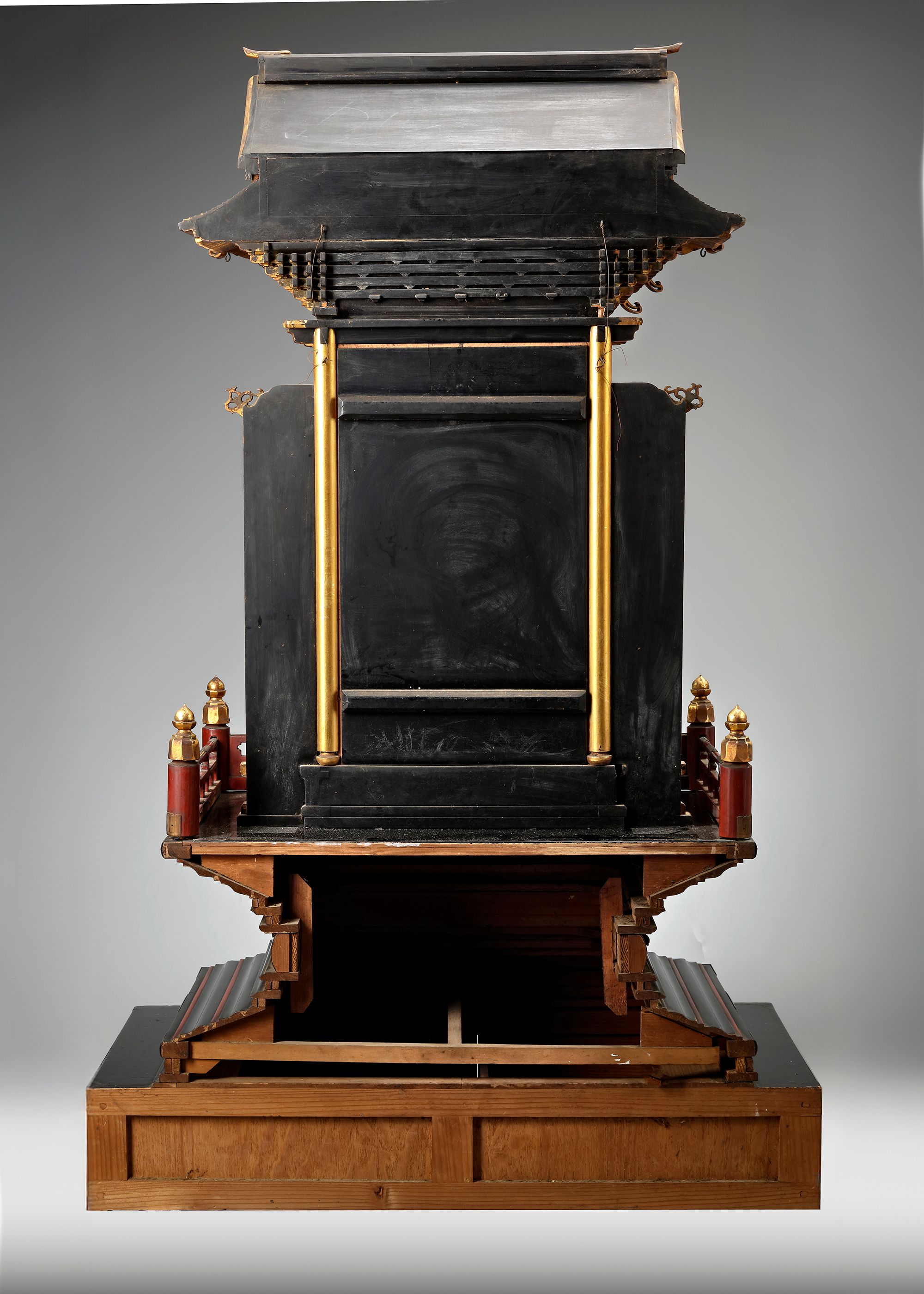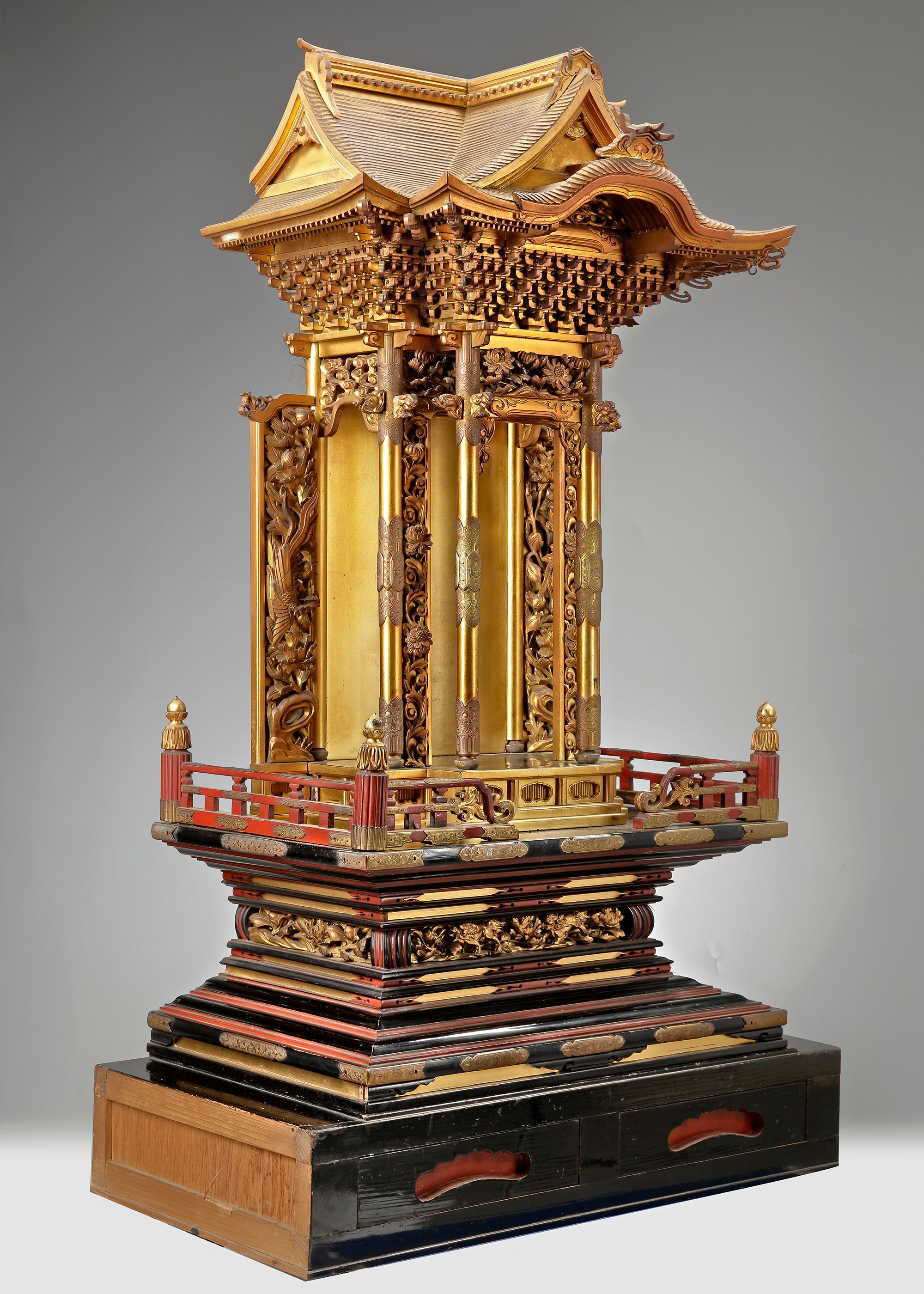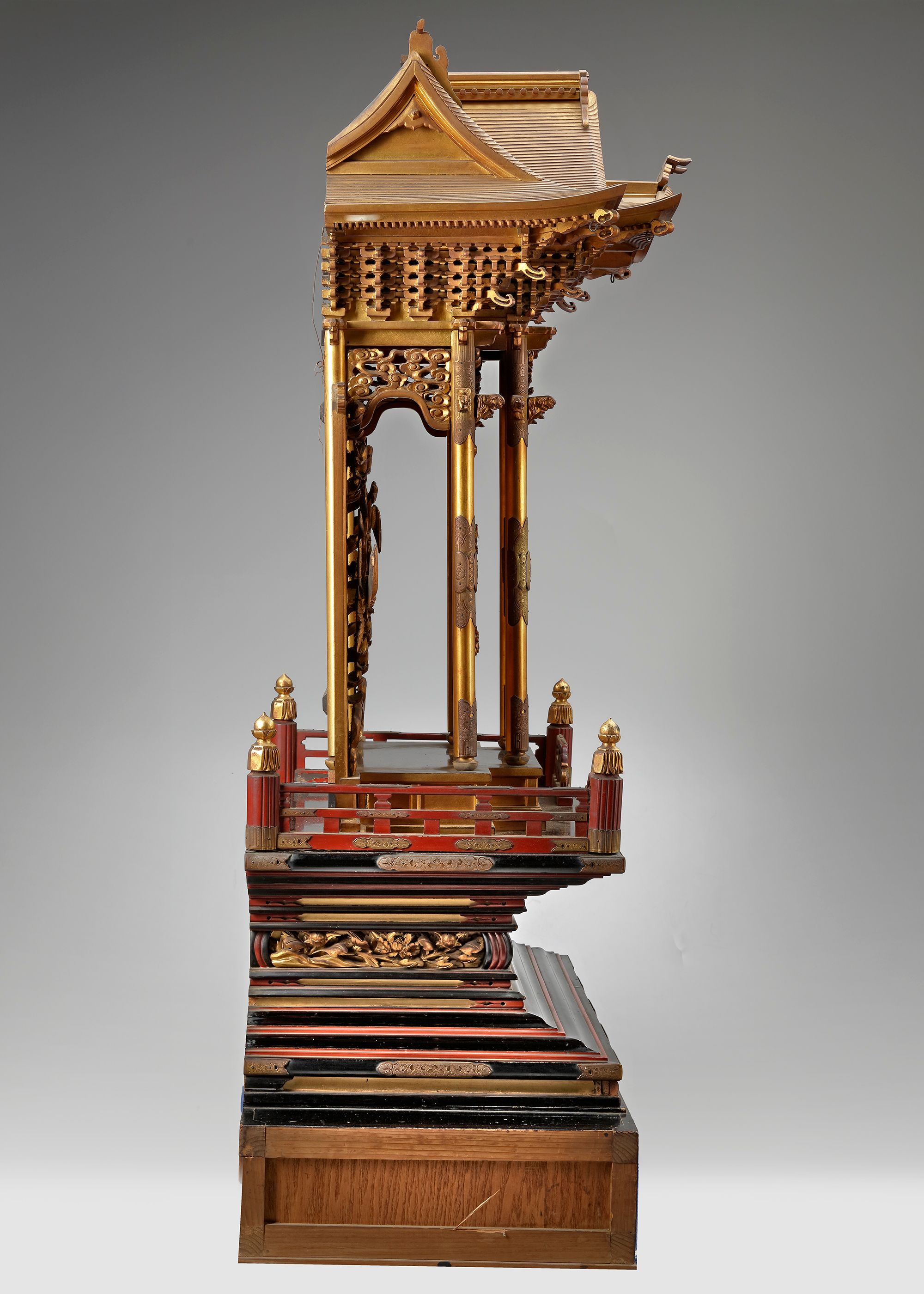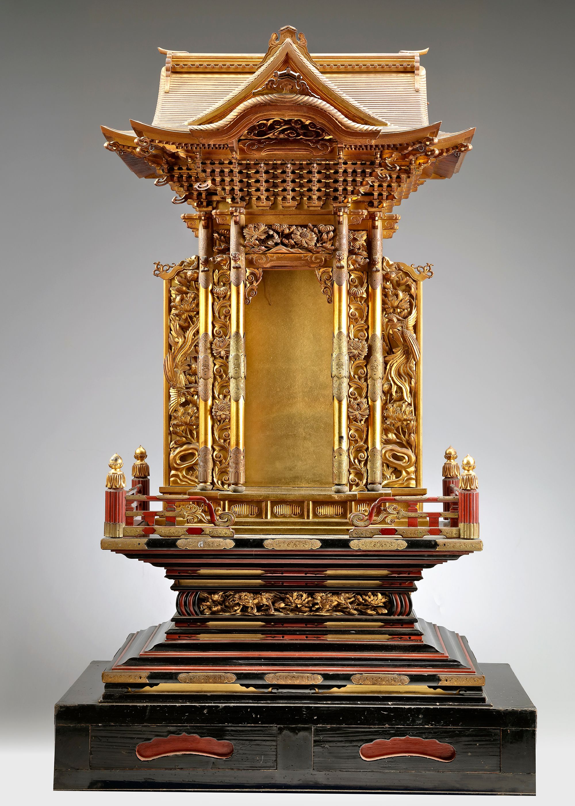 An all over gold lacquered buddhist shrine for a buddhist figure in the shape of a temple front, its roof resting on five layers of interlocking wooden brackets and its sides decorated with carved panels showing auspicious phoenix birds and peony flowers.
