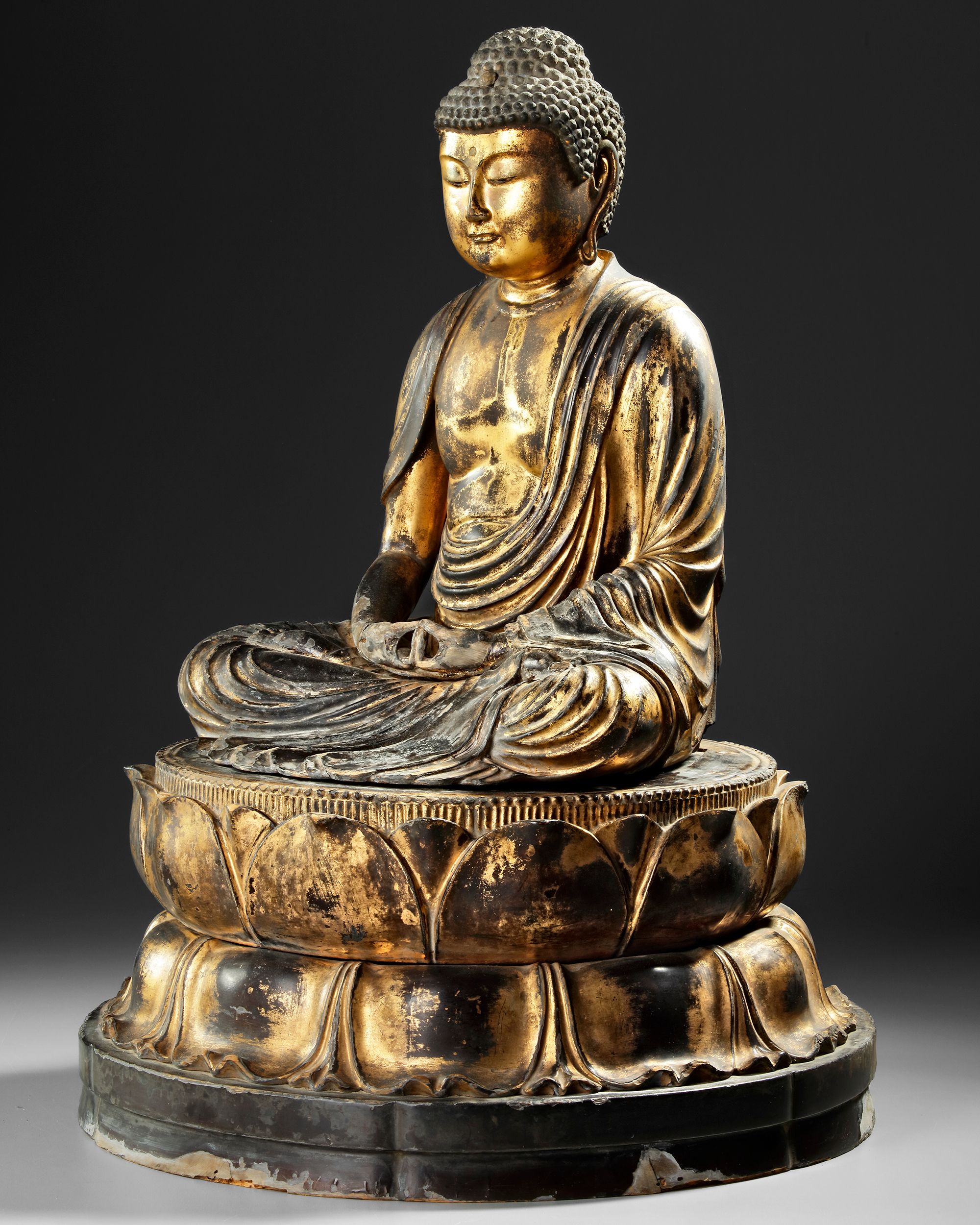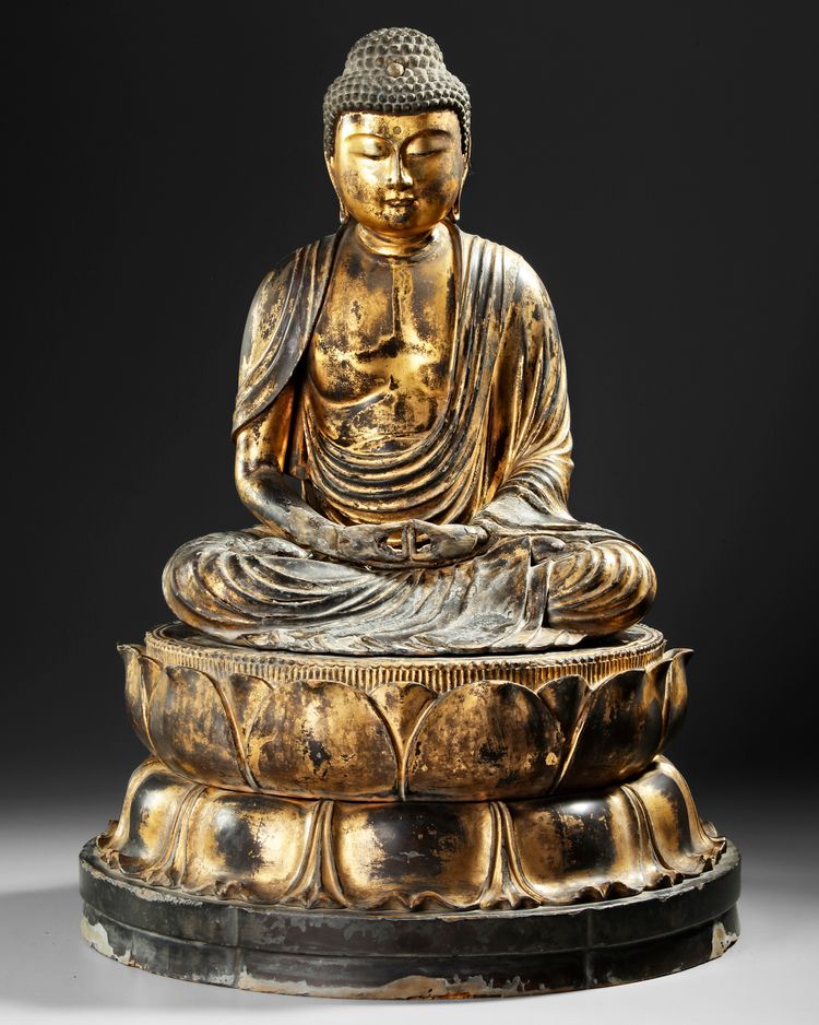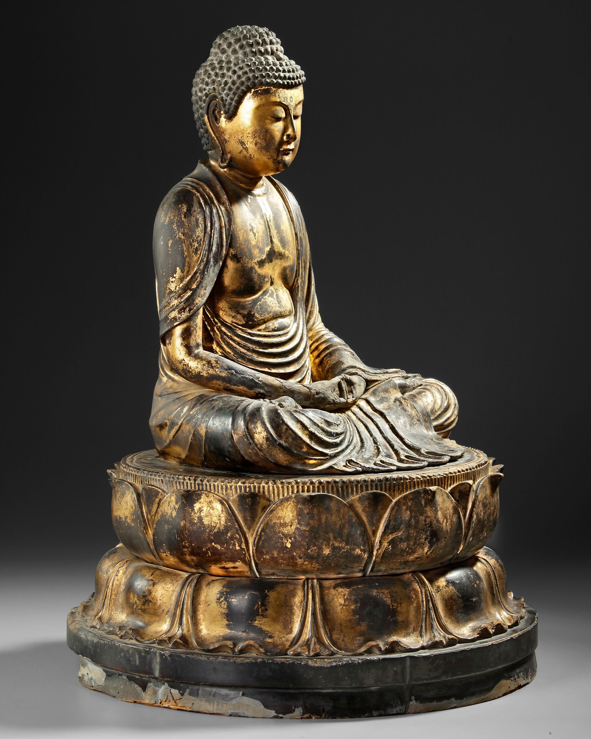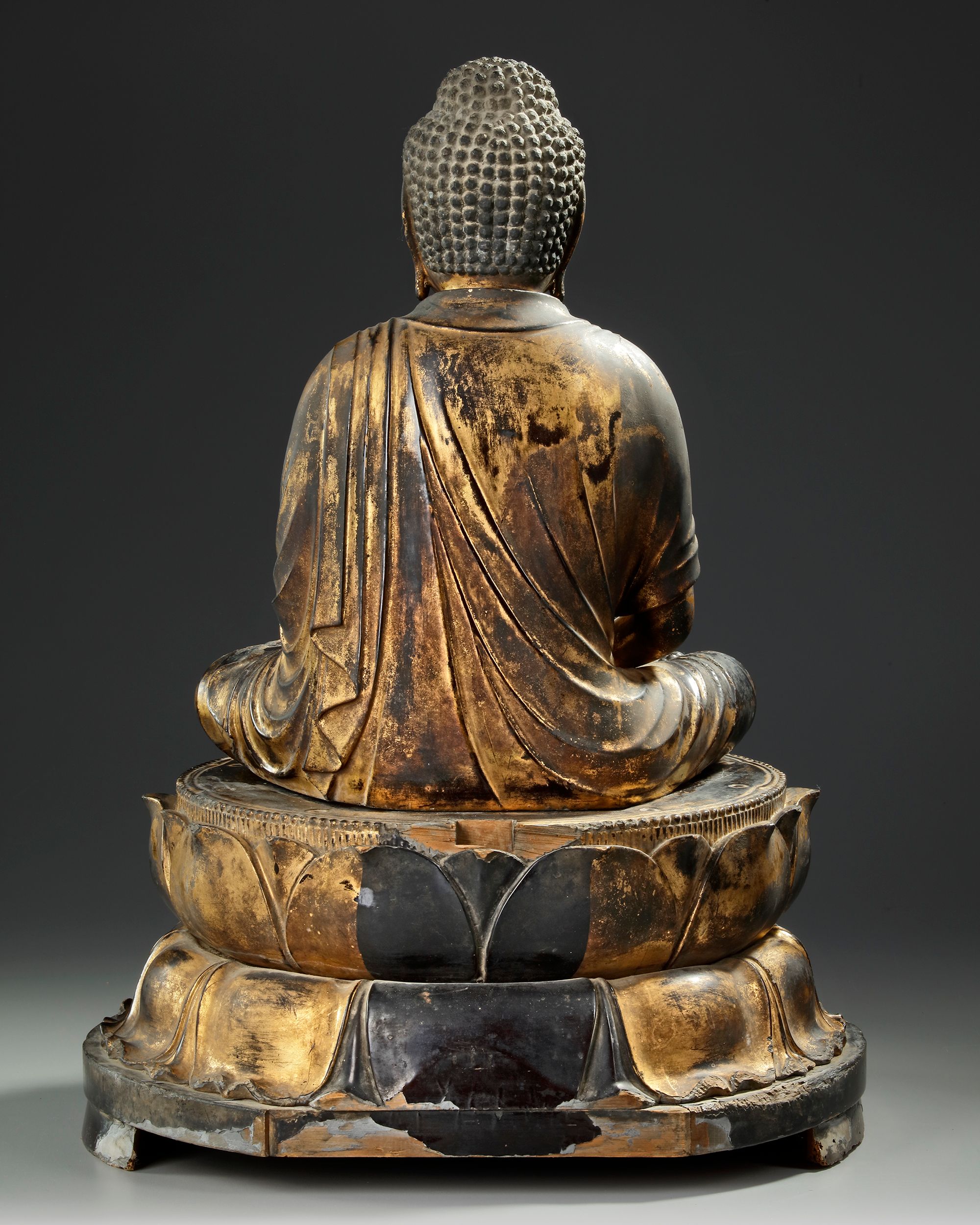 A gilded wooden Amida nyorai (Amitabha Tathagata, Buddha of Infinite Light and Life) sitting in meditation (dhyana mudra) on a gilded round double lotus throne.