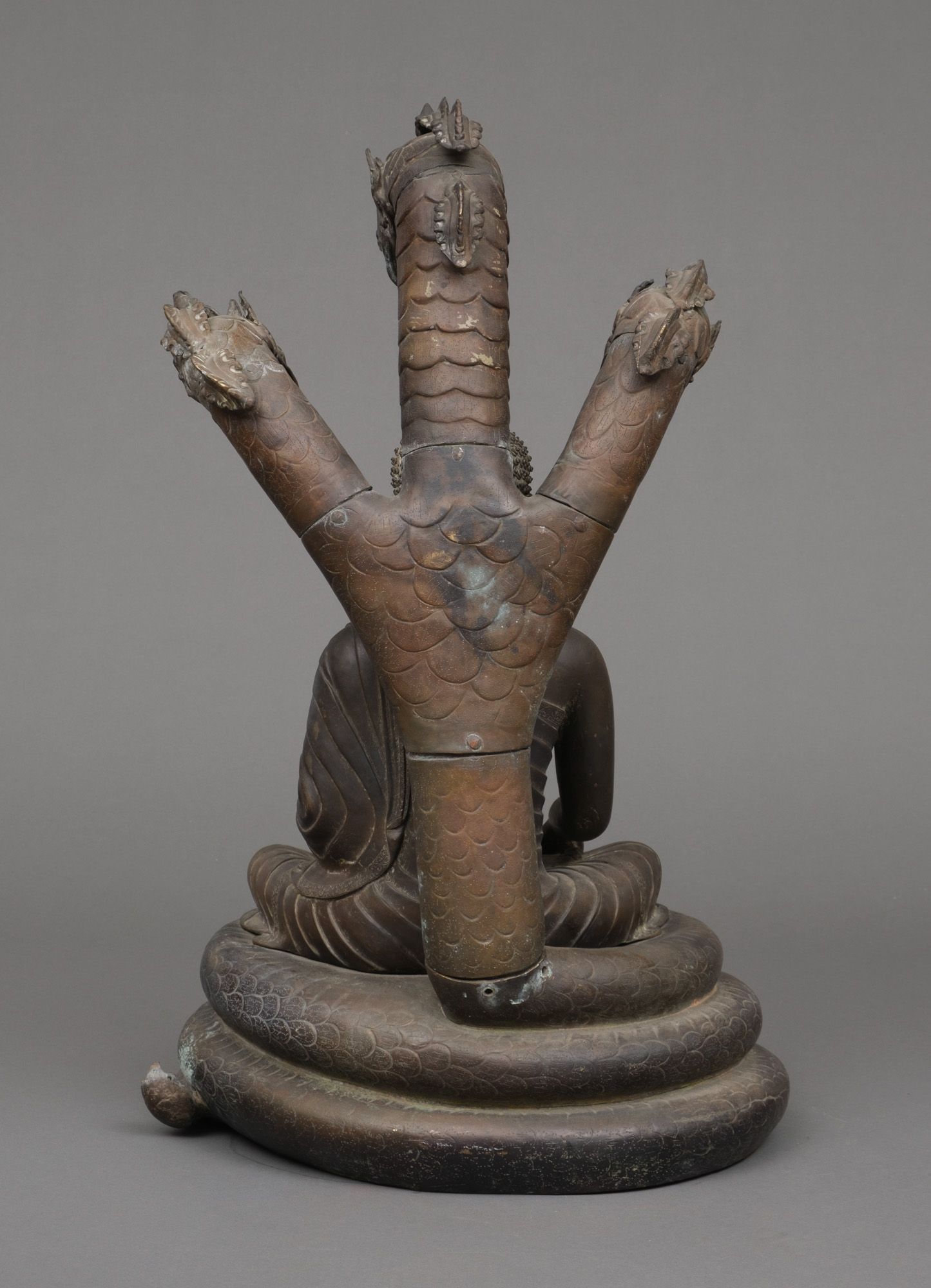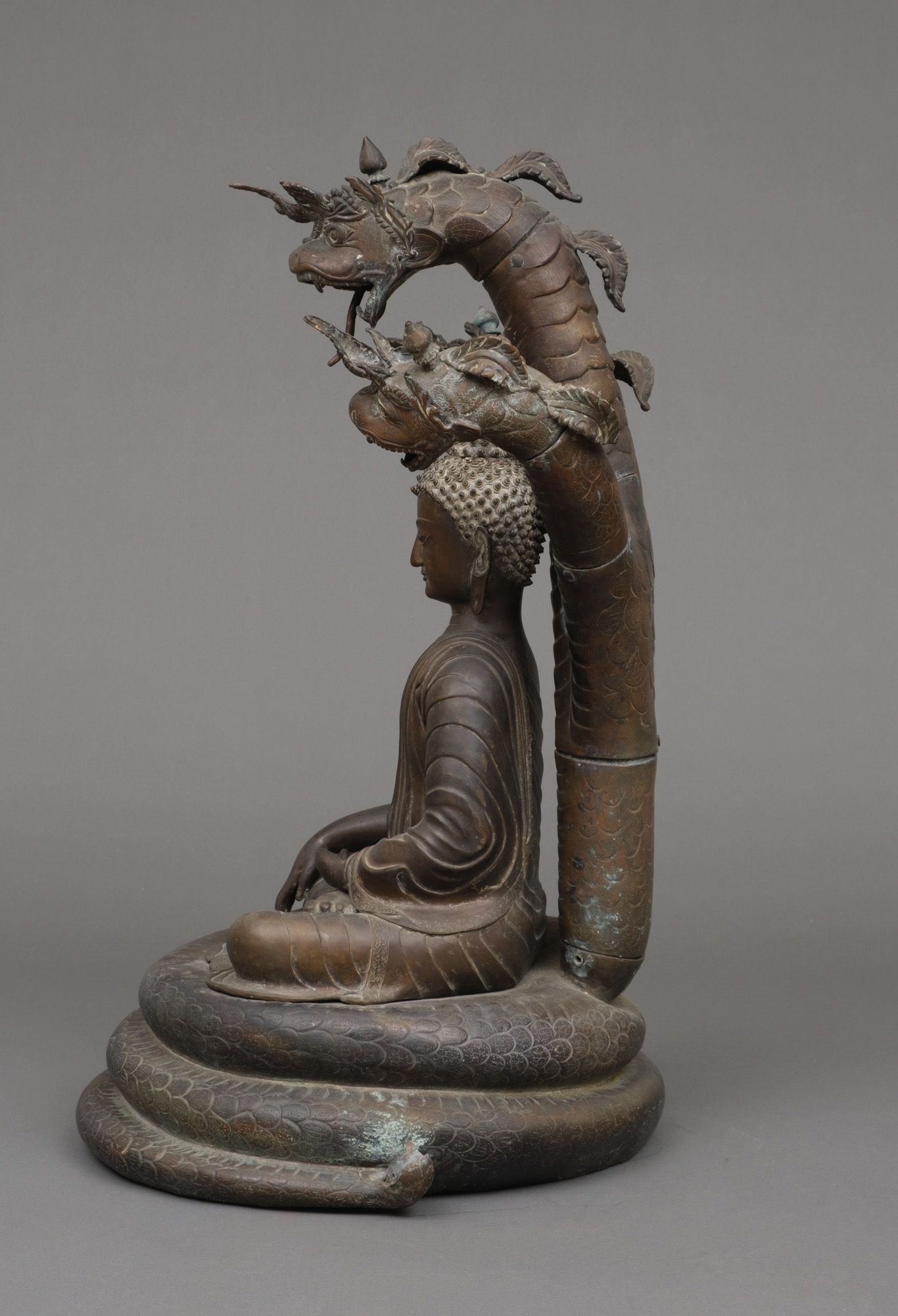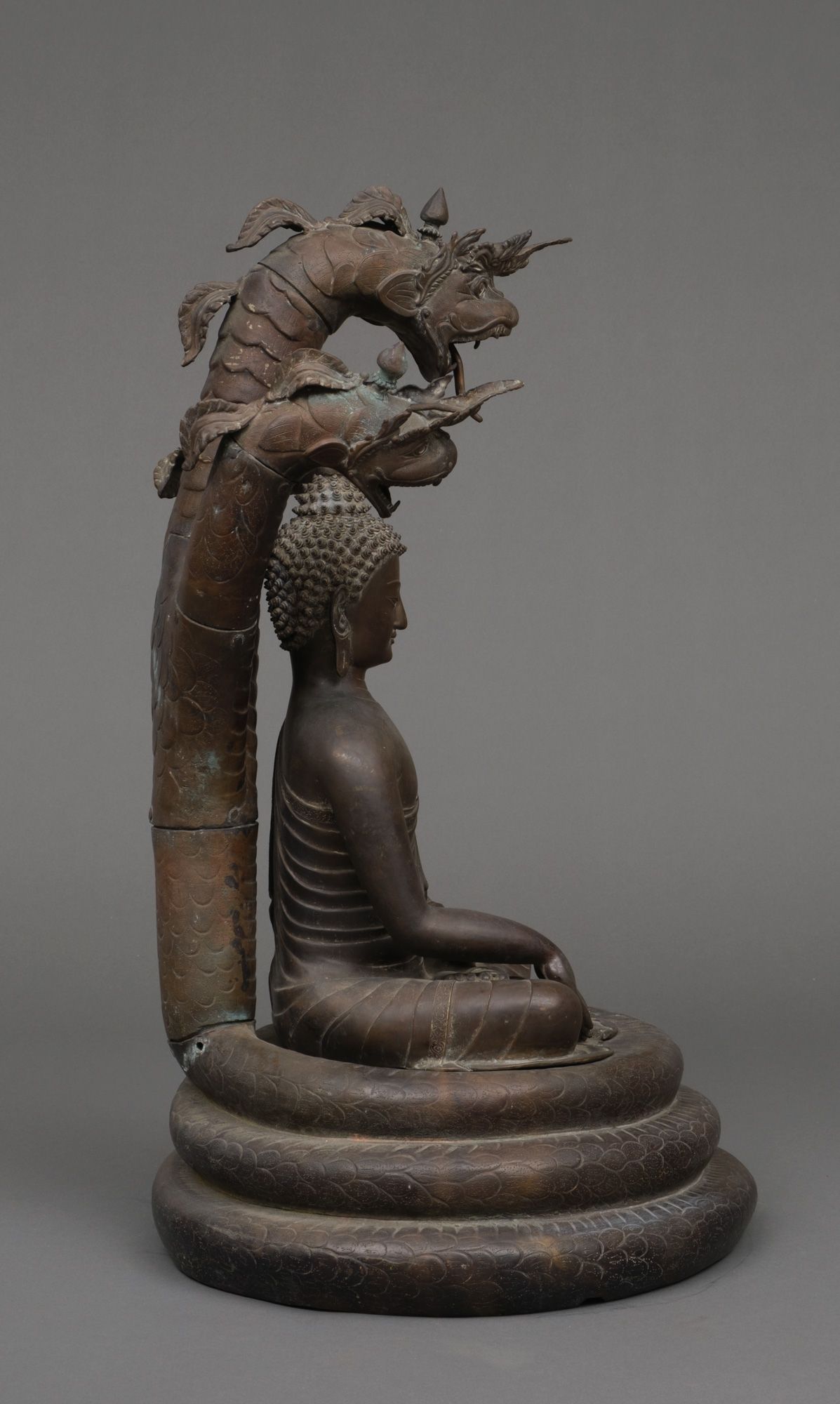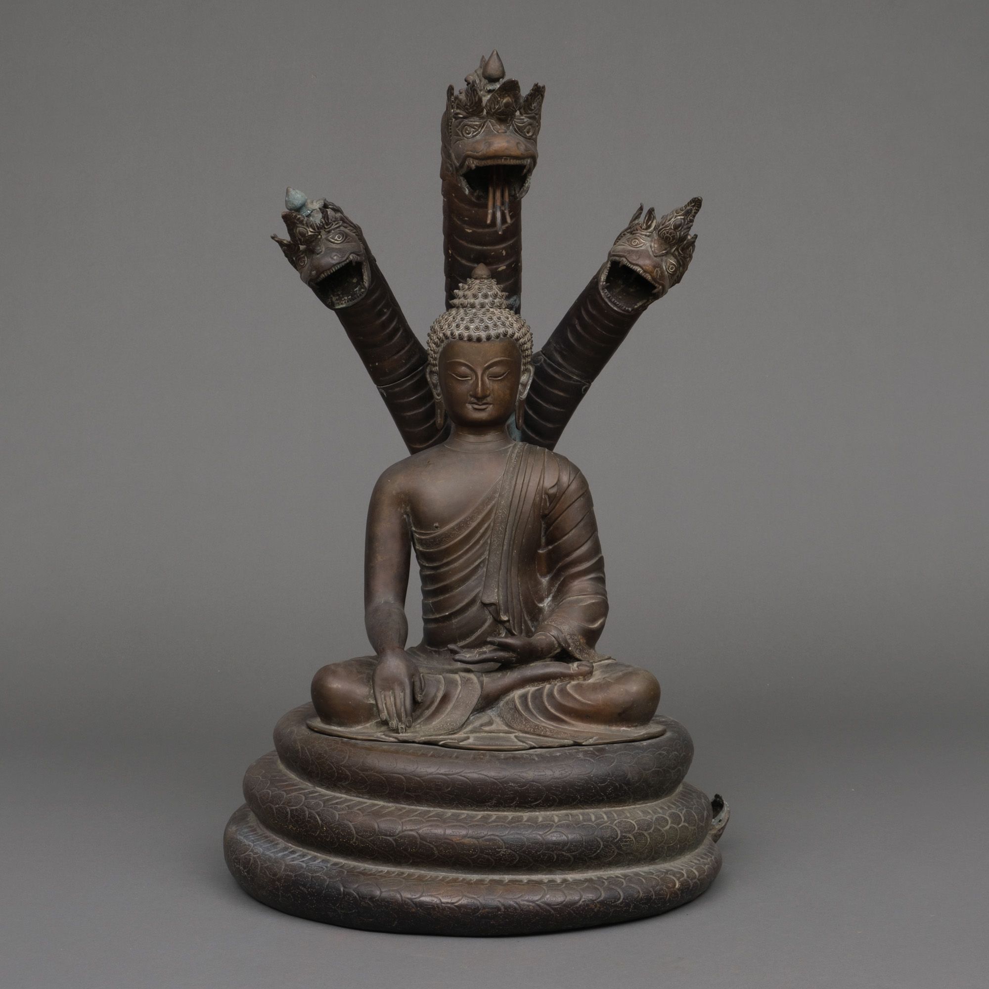 Very large patinated bronze figure depicting the three-headed serpent king Muchilinda protecting the seated Buddha Shakyamuni from heavy rains. Also known as ‘Naga Buddha’.