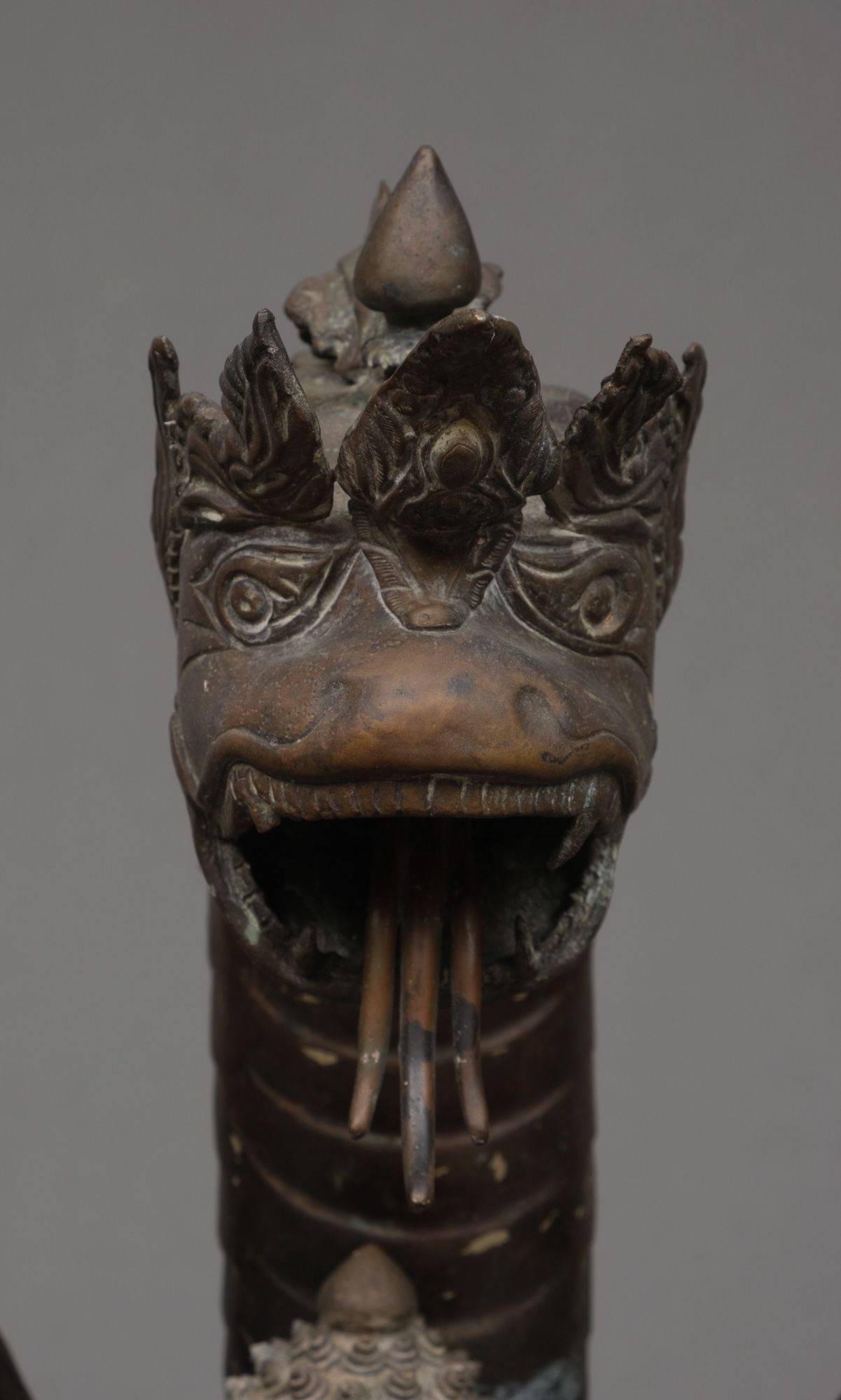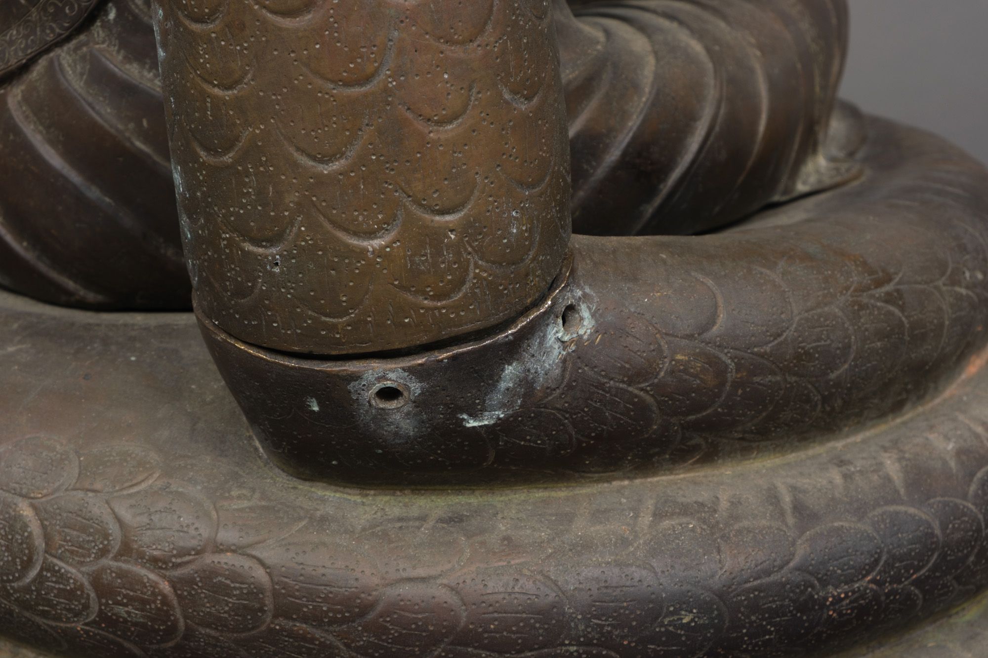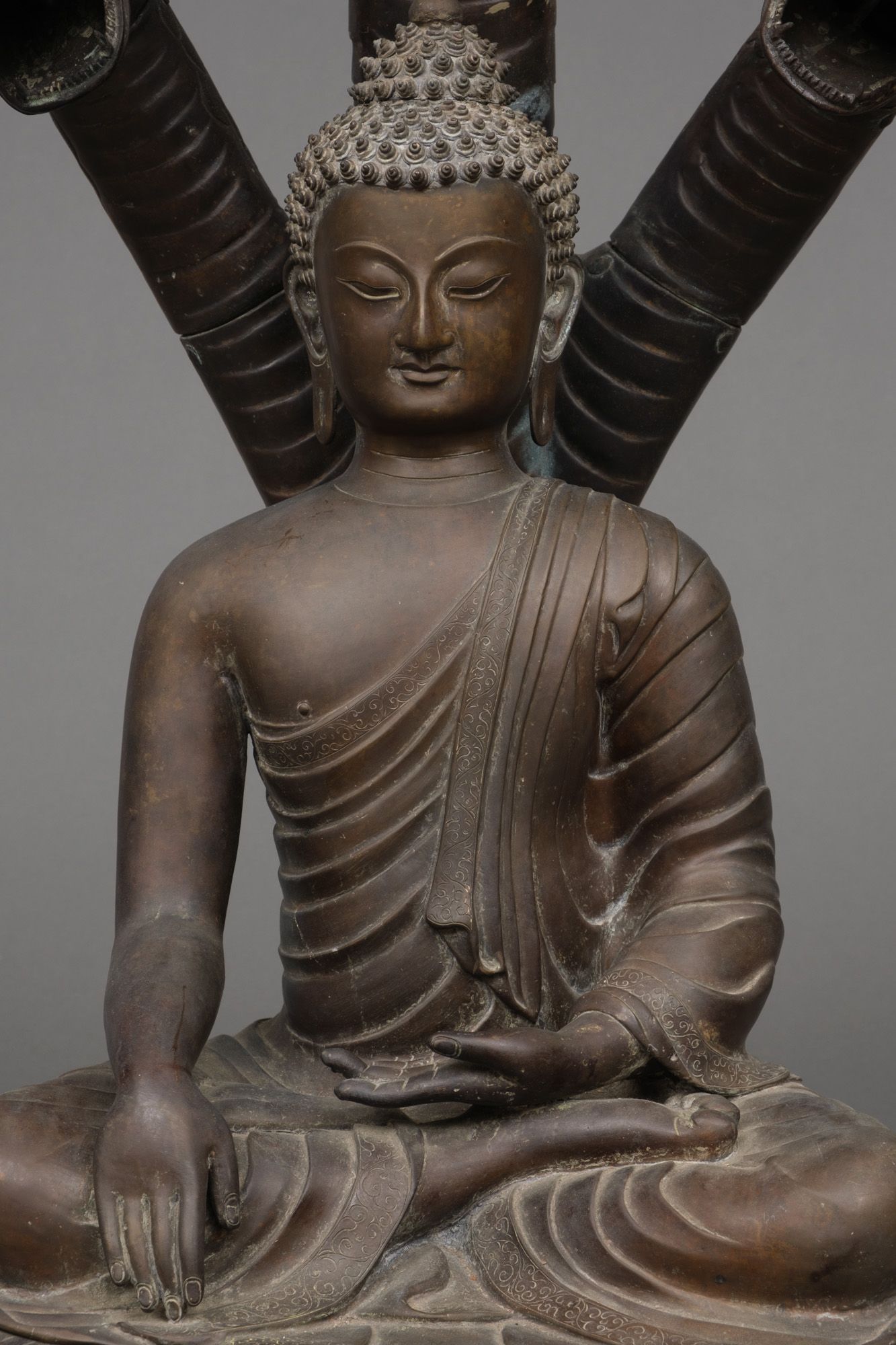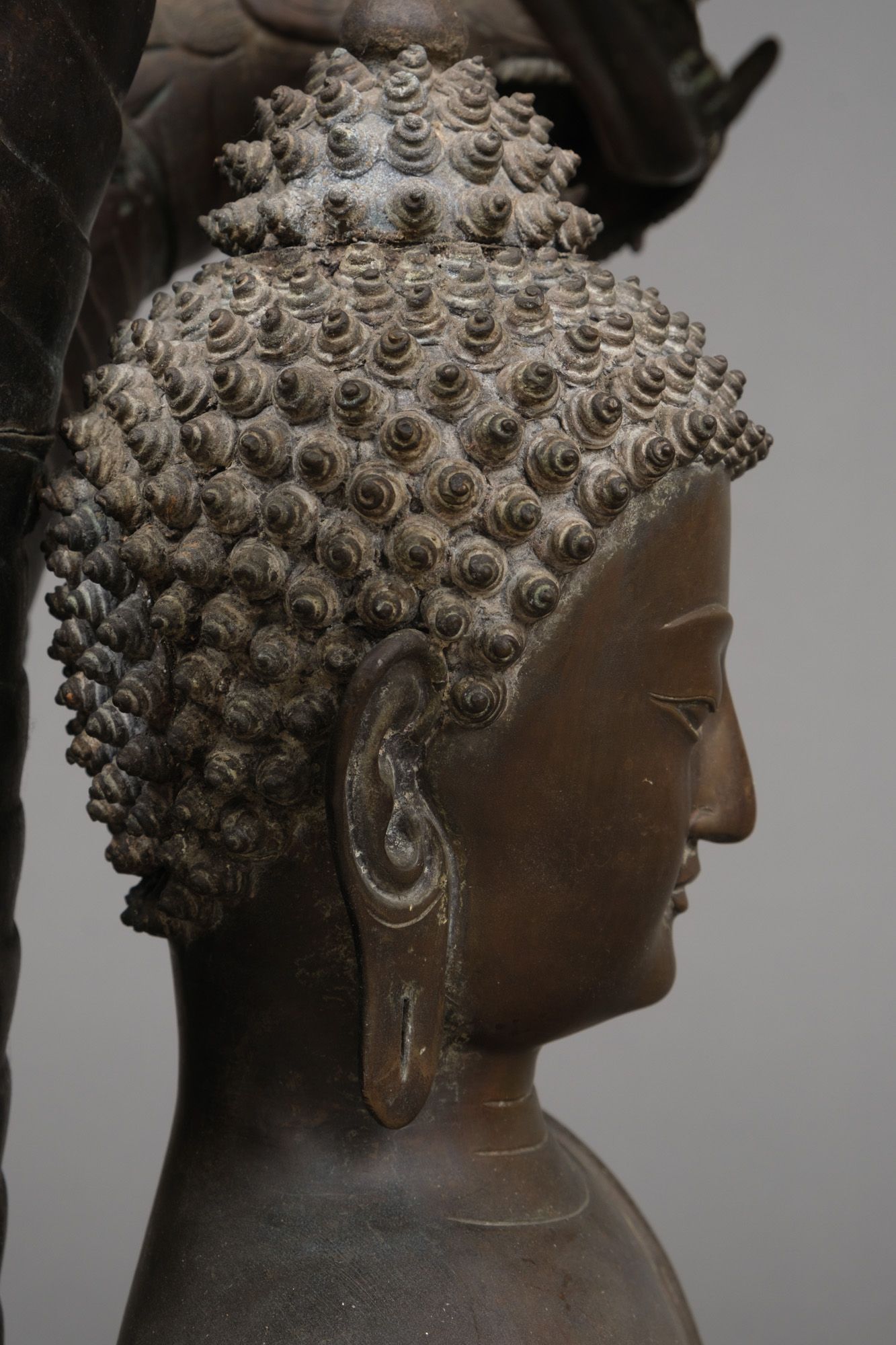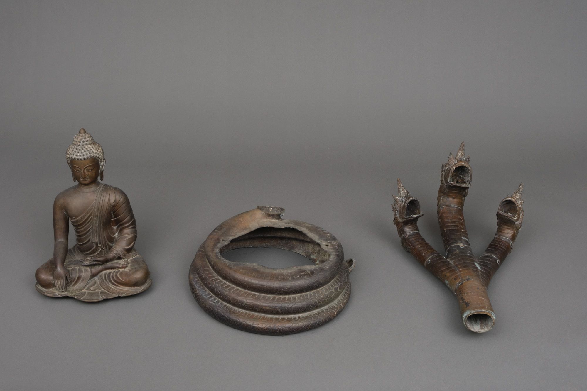 Very large patinated bronze figure depicting the three-headed serpent king Muchilinda protecting the seated Buddha Shakyamuni from heavy rains. Also known as ‘Naga Buddha’.