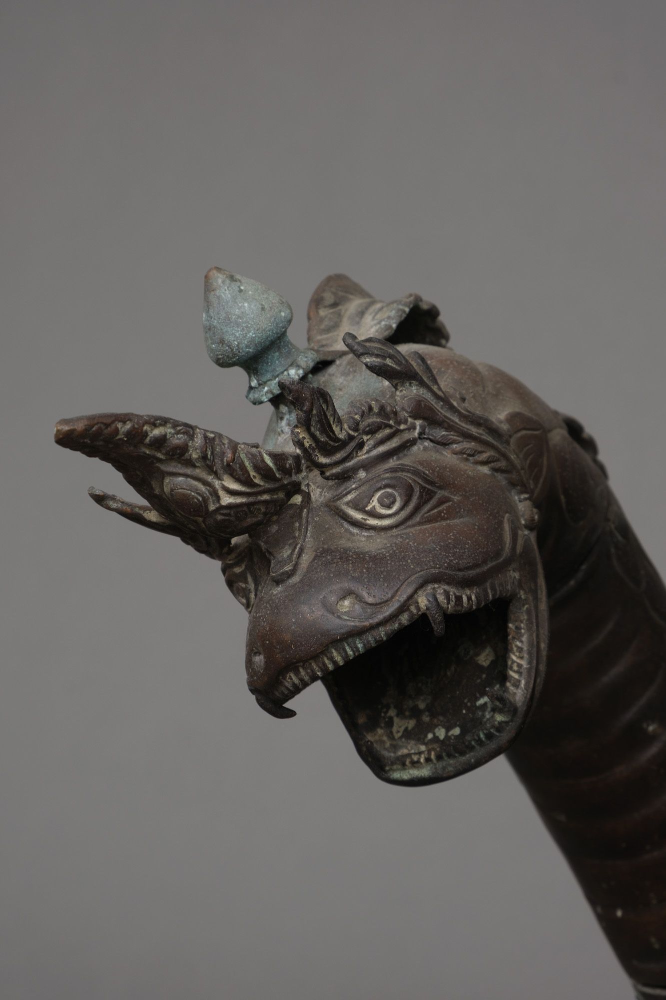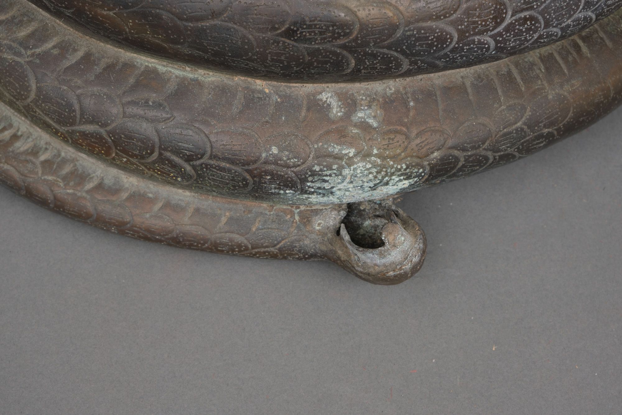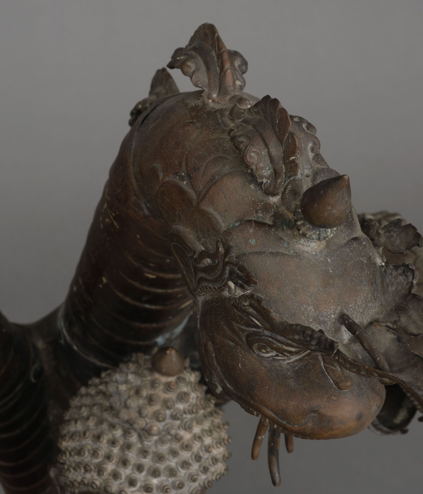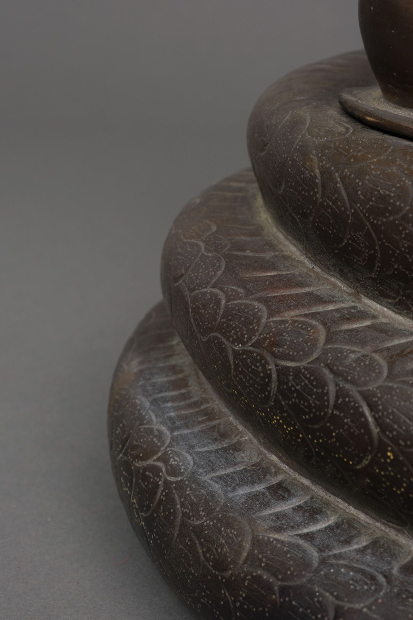 Very large patinated bronze figure depicting the three-headed serpent king Muchilinda protecting the seated Buddha Shakyamuni from heavy rains. Also known as ‘Naga Buddha’.