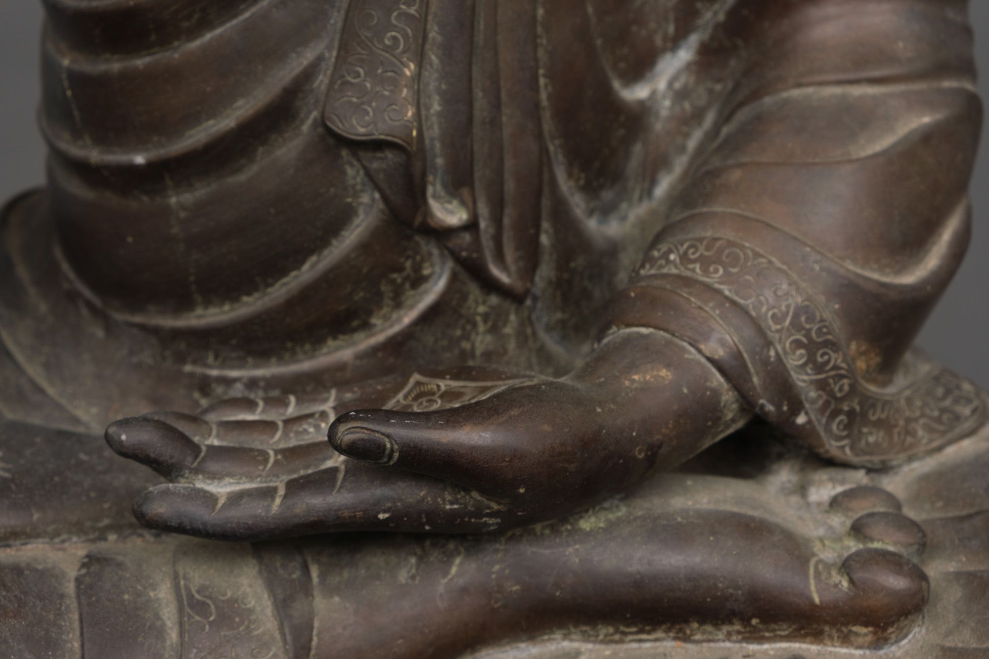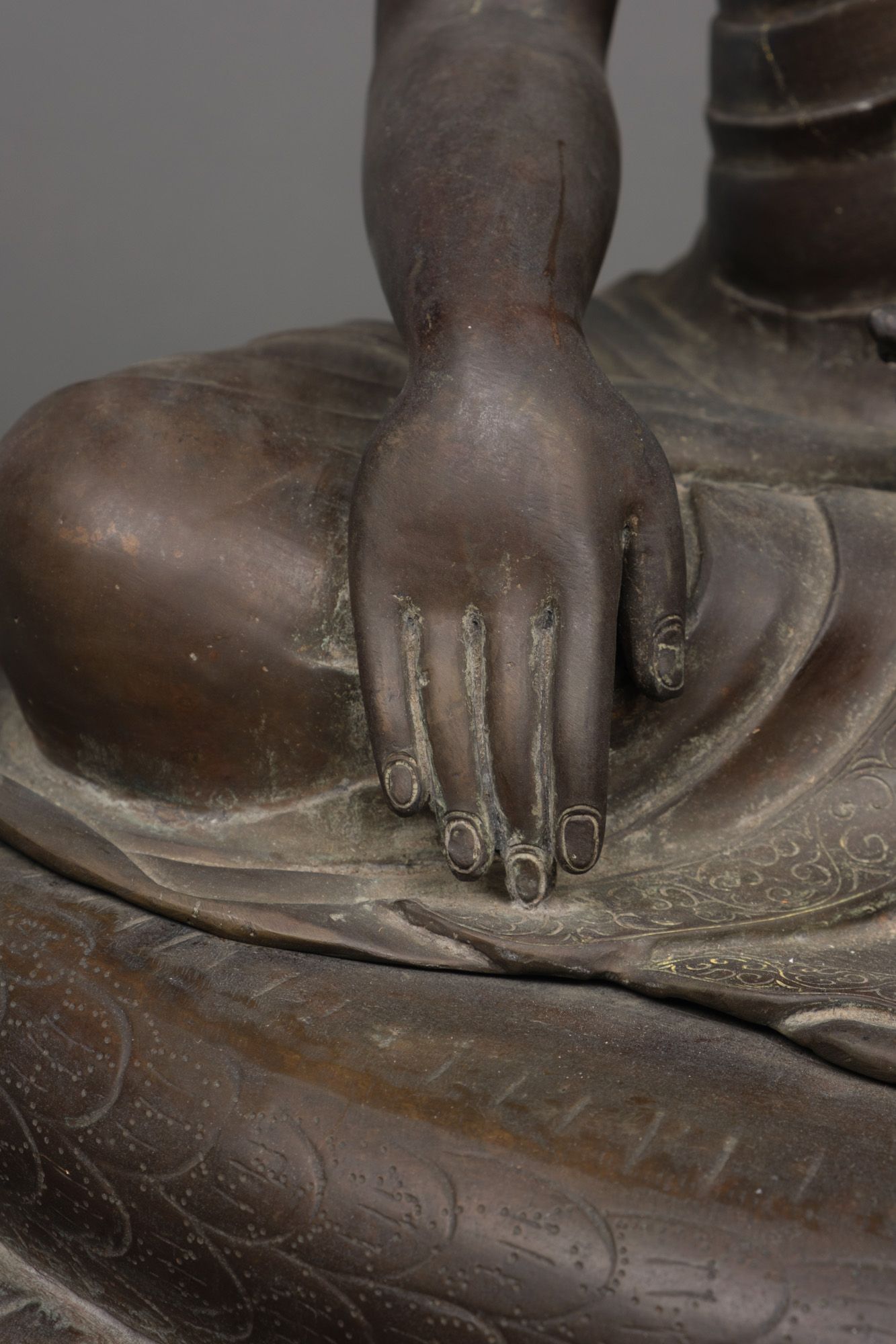 Shakyamuni holding its hands in the Bhumisparsha Mudra, representing the moment of the Buddha’s awakening as he claims the earth as the witness of his enlightenment.
