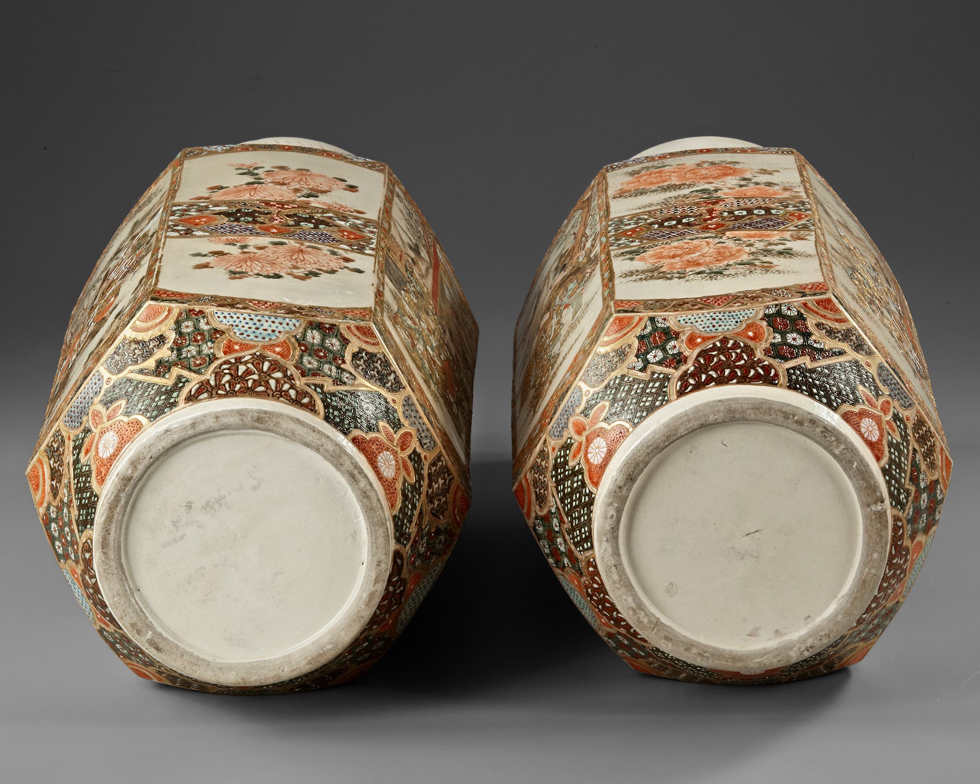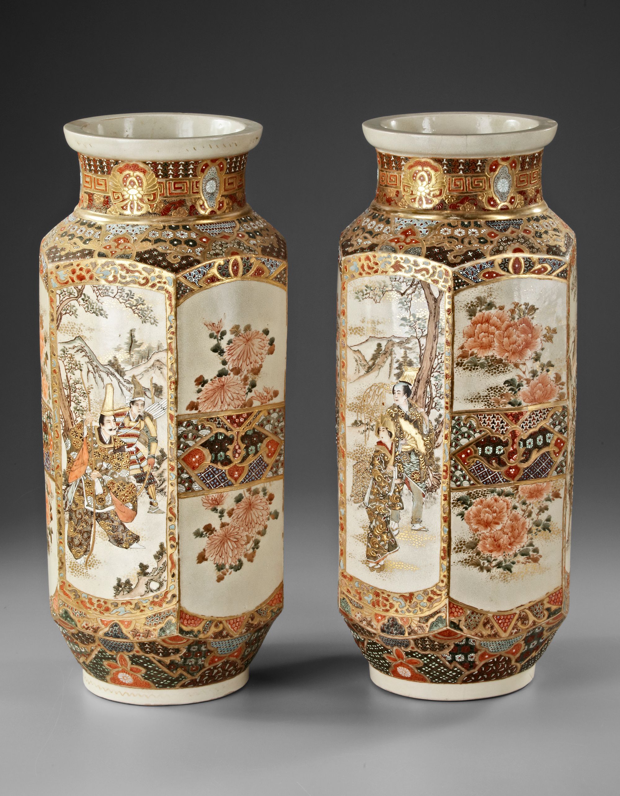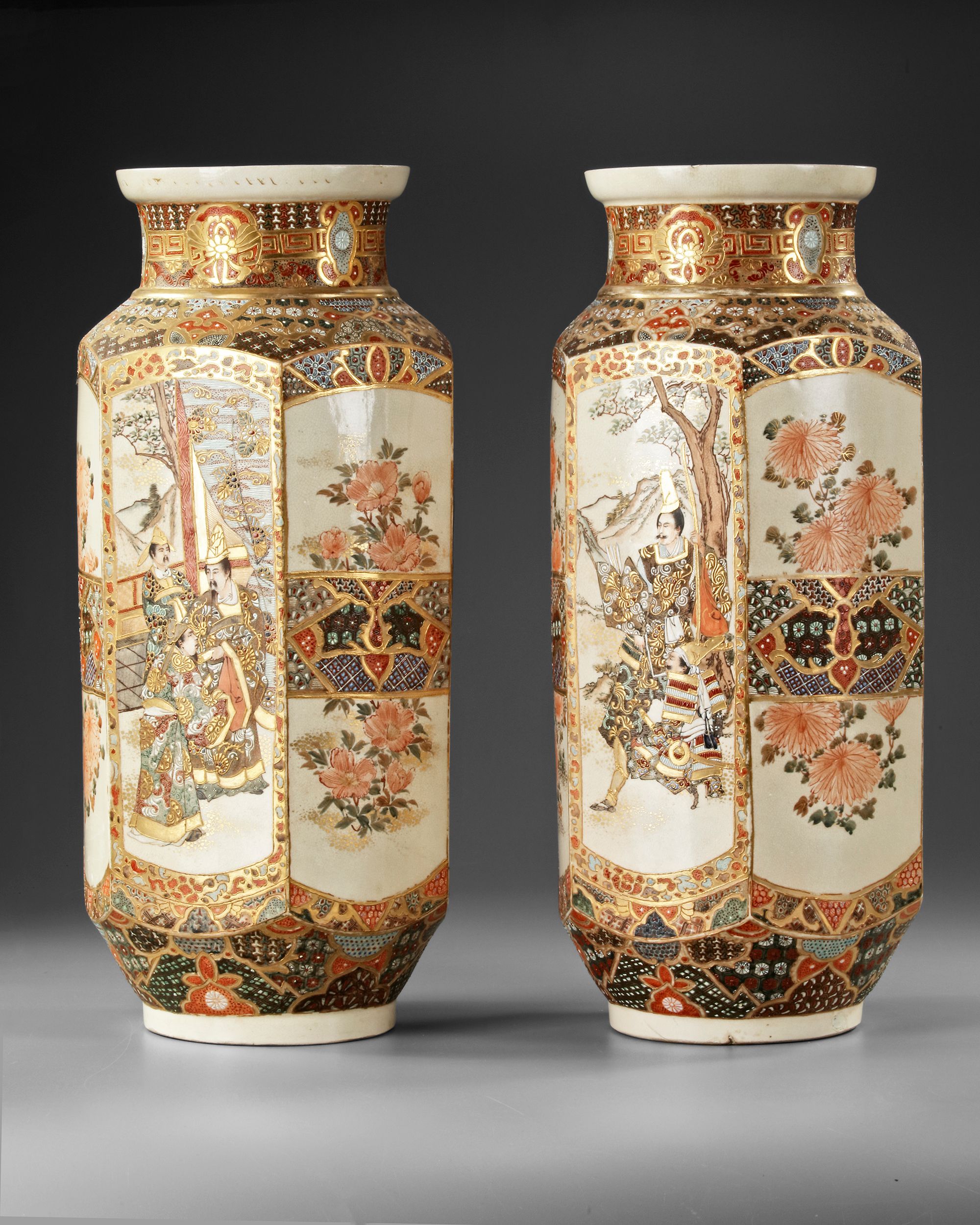 A pair of Japanese porcelain vases with gilt accents, each decorated with panels depicting a dignitary accompanied by attendants and intricate floral motifs. The panels alternate between narrative scenes of a noble figure attended by servants and depictions of lush chrysanthemums and peonies. The waisted necks are stylized with floral roundels set on a key-fret chain design.