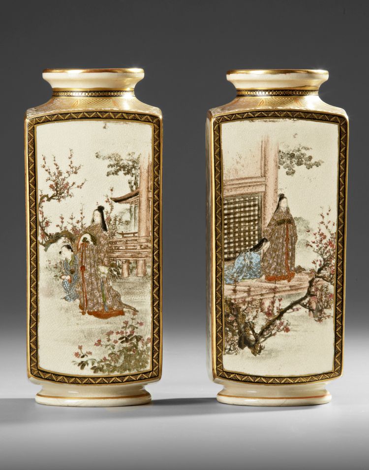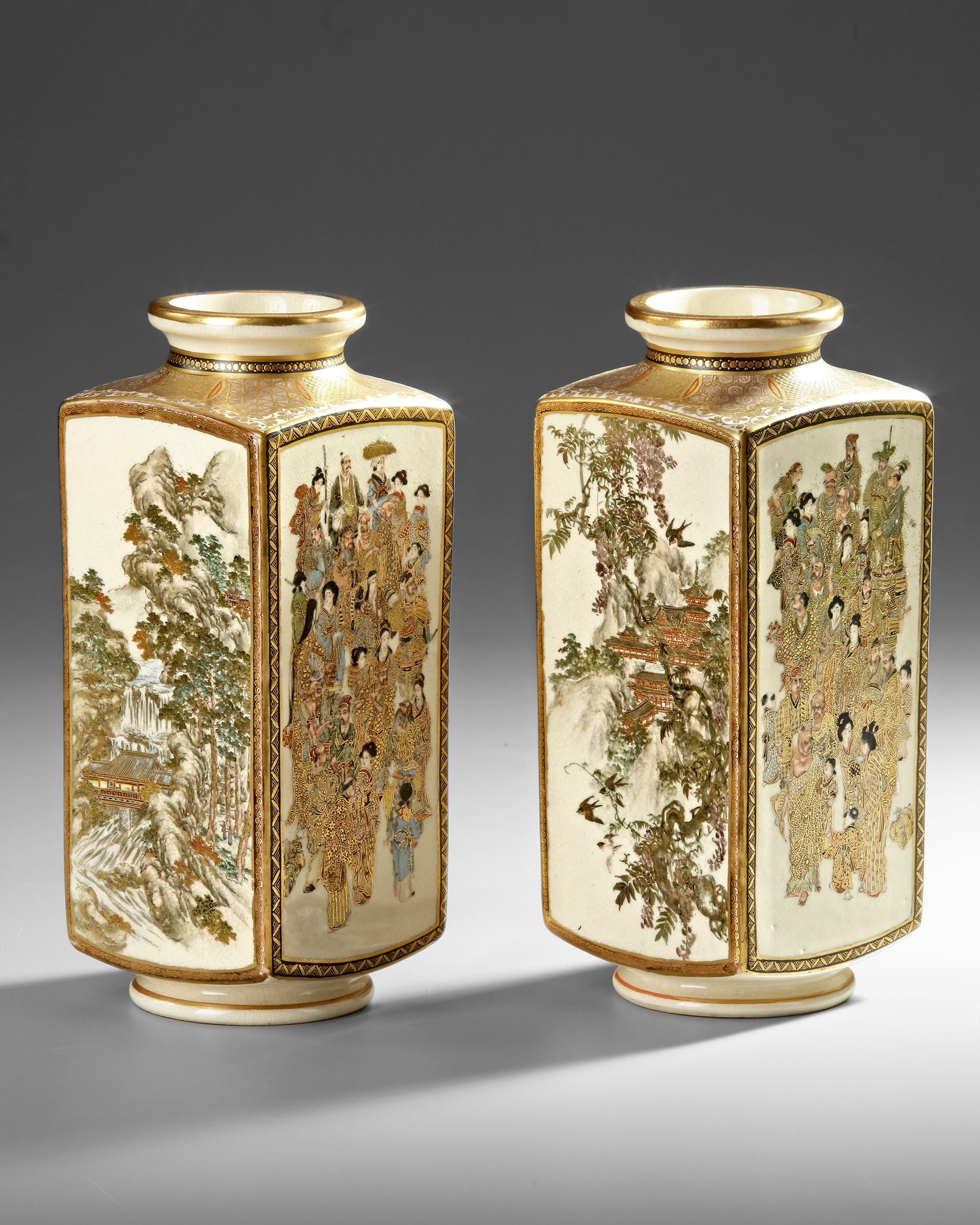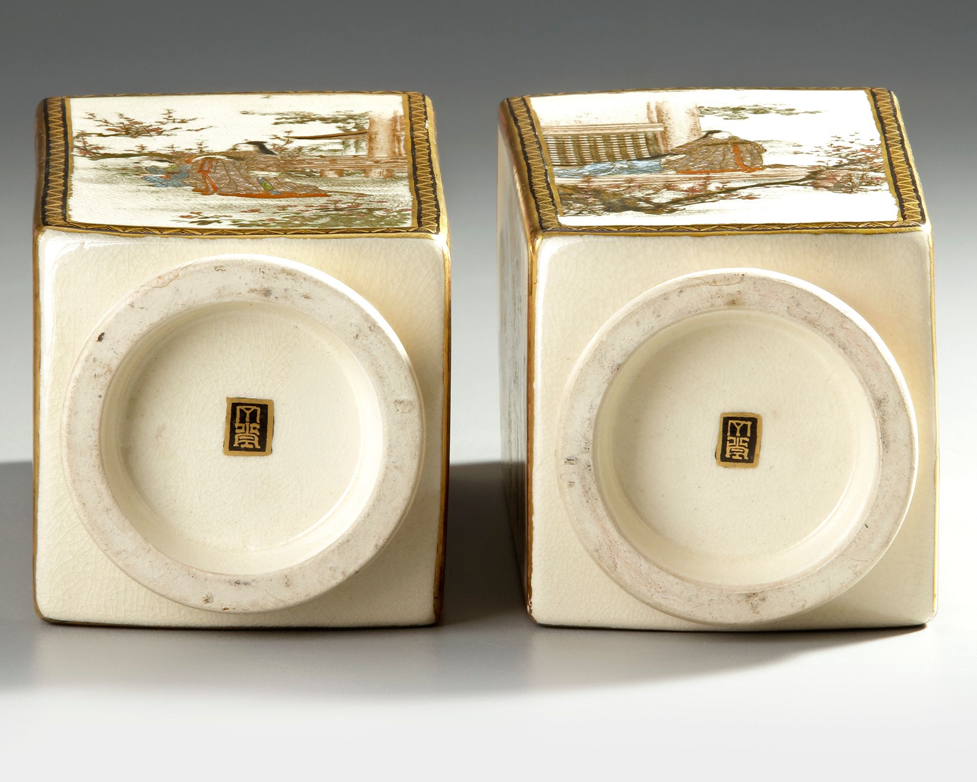 A pair of square-form Satsuma vases, each panel richly decorated. One side depicts a noble woman with her servant, while another features a densely composed scene of Japanese figures in elaborate attire. The remaining panels showcase mountainous landscapes with traditional houses. Gilded geometric borders frame each scene, enhancing the crackle glaze.