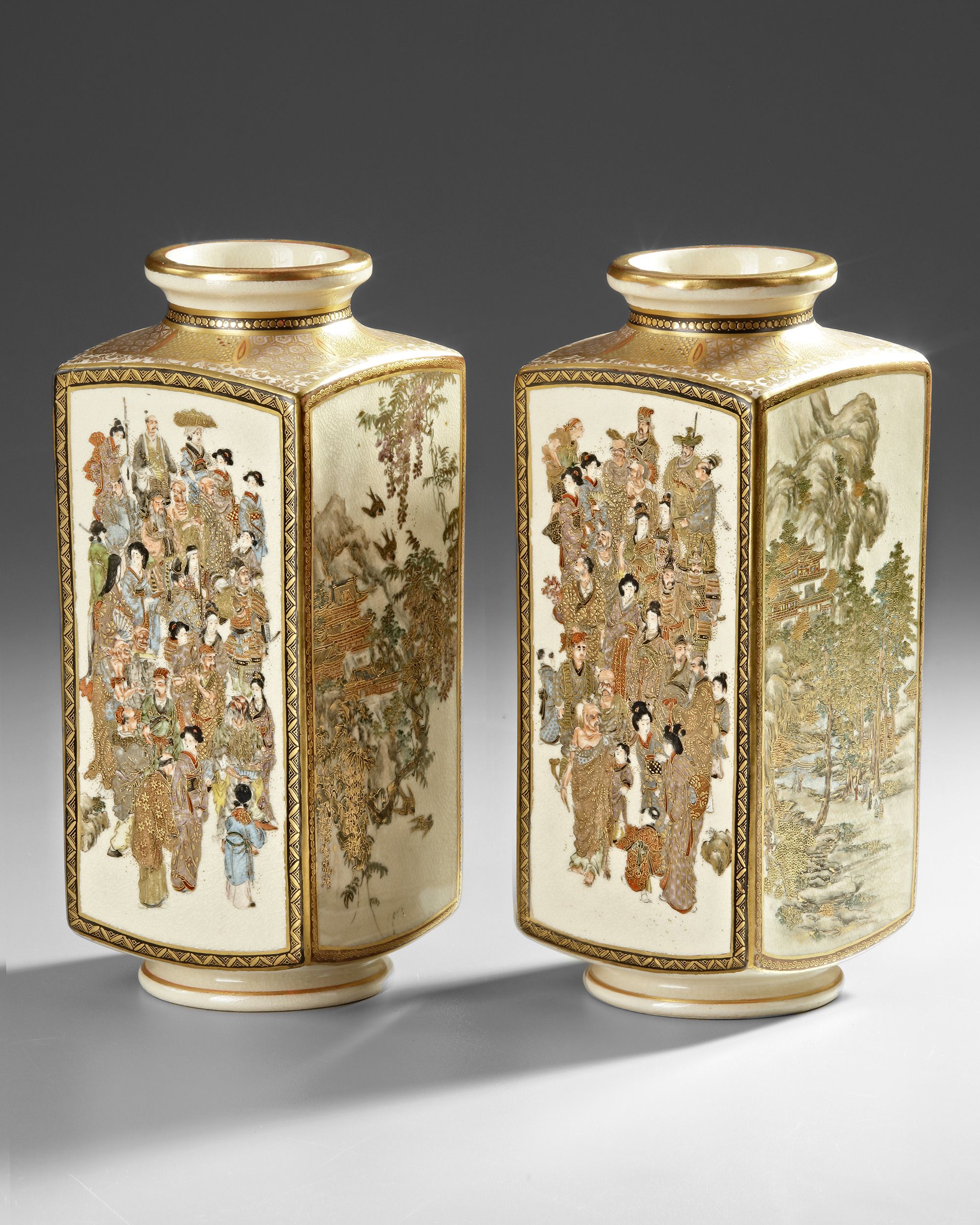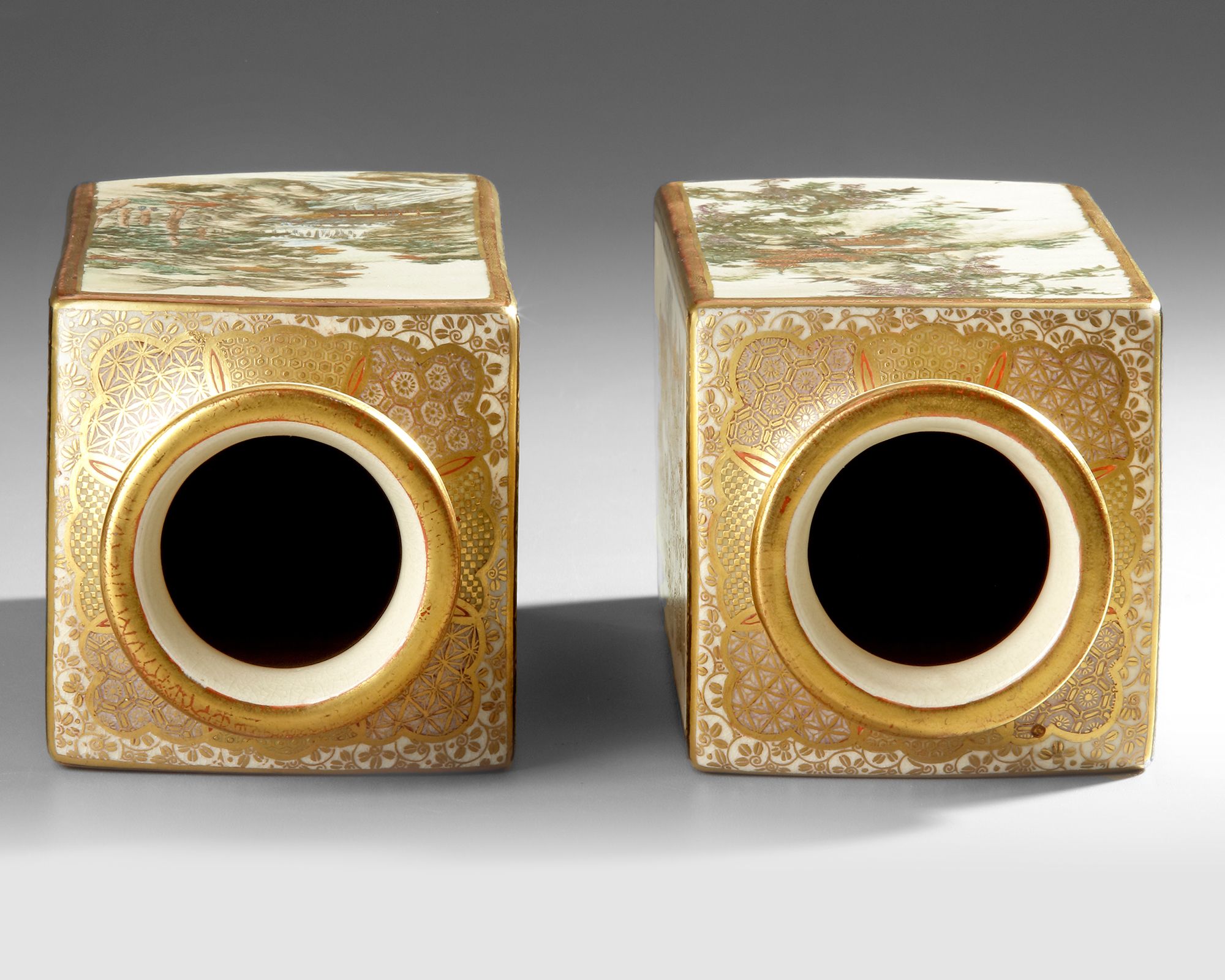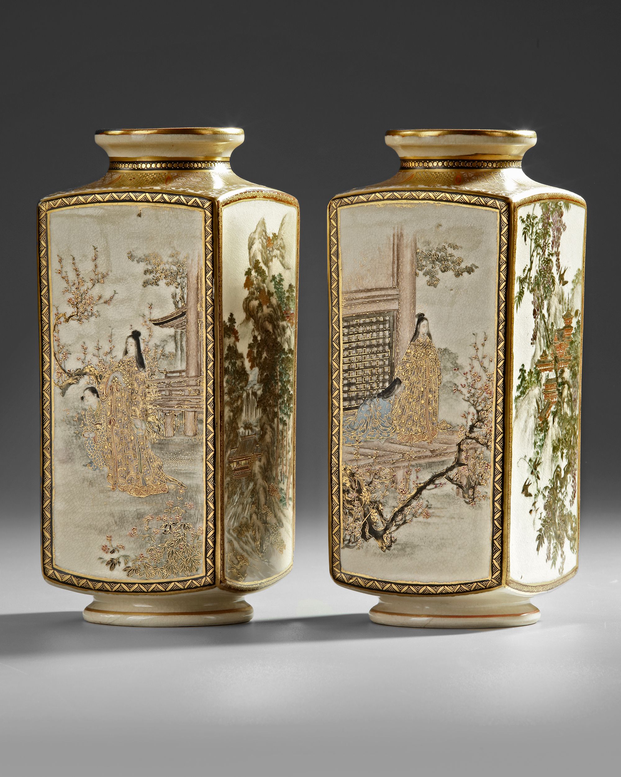 A pair of square-form Satsuma vases, each panel richly decorated. One side depicts a noble woman with her servant, while another features a densely composed scene of Japanese figures in elaborate attire. The remaining panels showcase mountainous landscapes with traditional houses. Gilded geometric borders frame each scene, enhancing the crackle glaze.