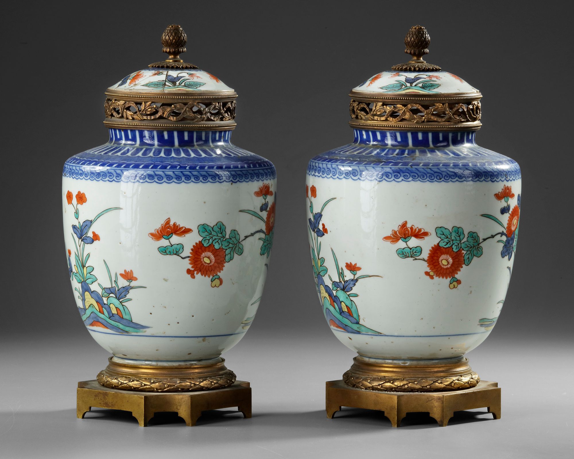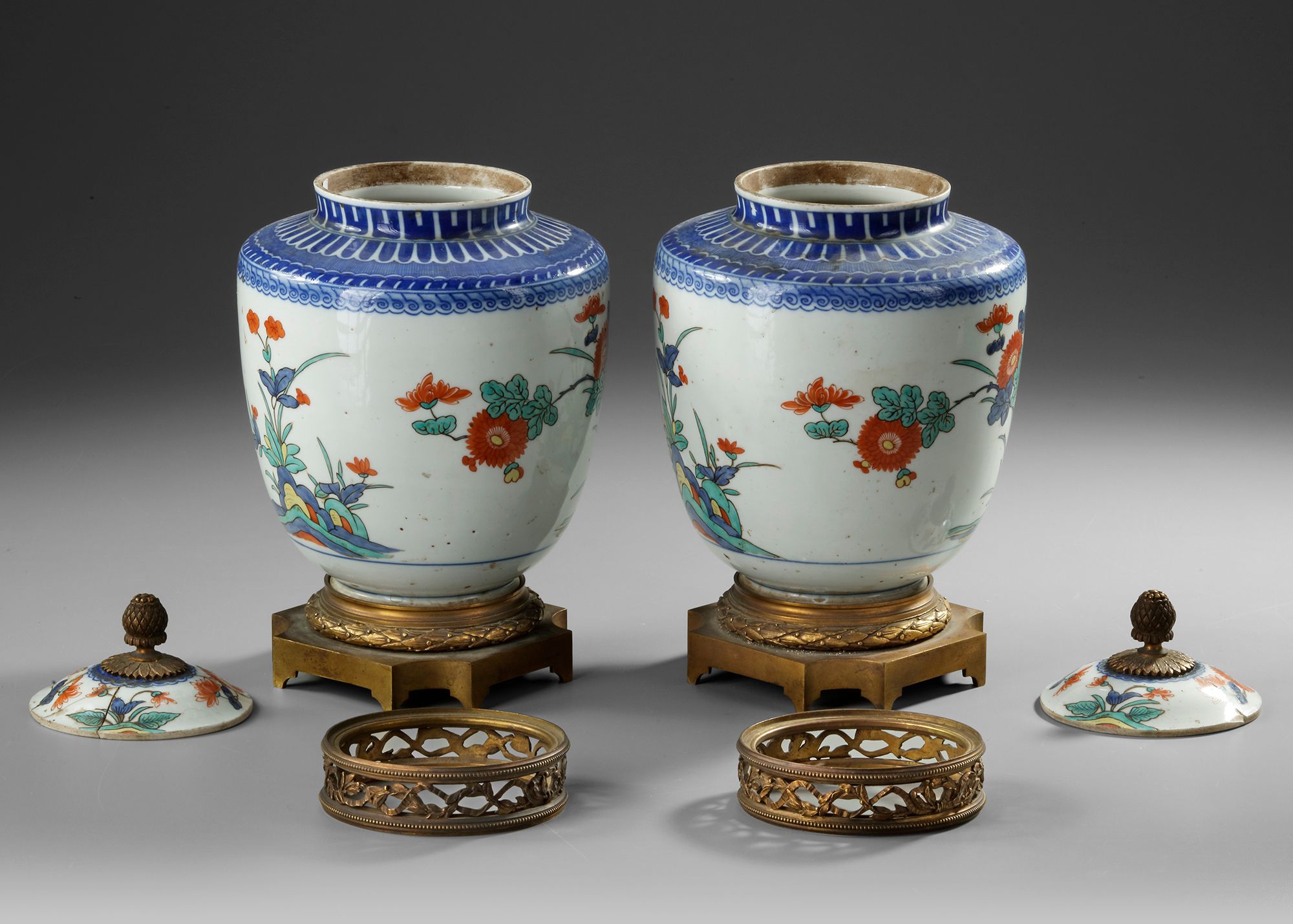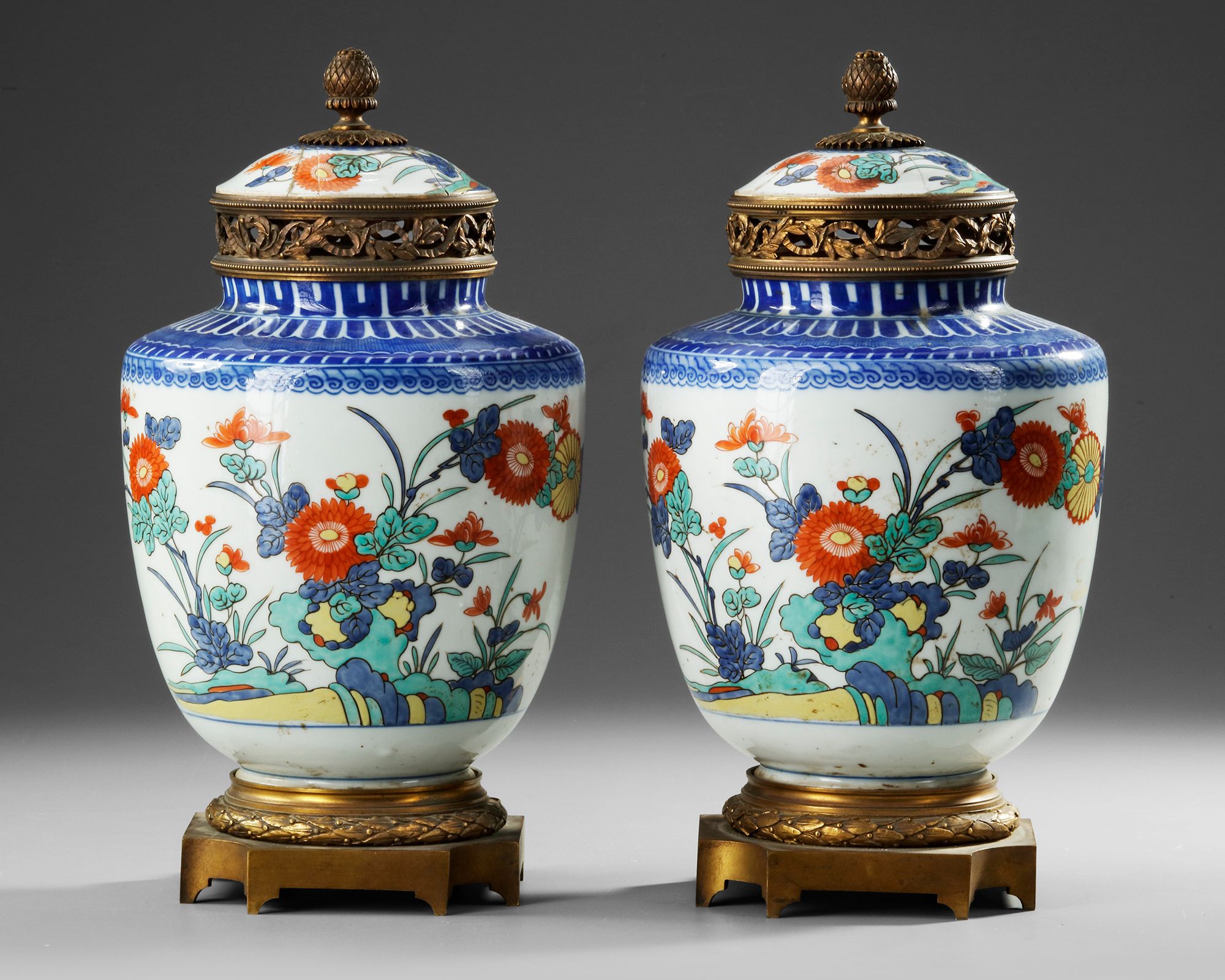 A pair of European lidded jars in Kakiemon style, decorated with vibrant floral motifs in red, blue, and green on a white background. The jars feature bronze mounts with intricate openwork designs on the lids and matching bases.