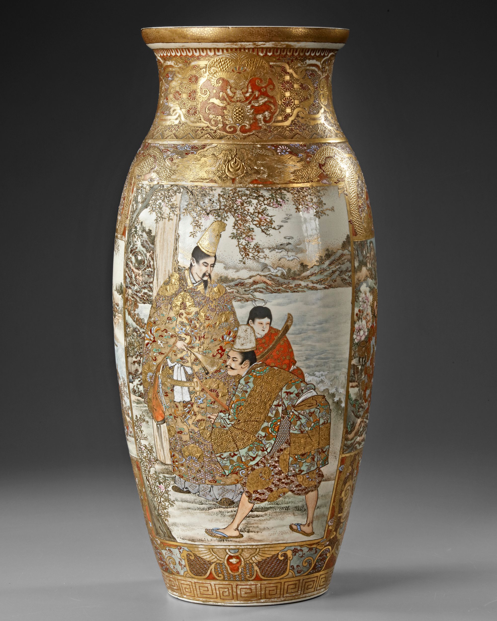 A Japanese porcelain vase, gilt and heavily decorated with panels enclosing a dignitary and his servants, the panels framed by gilt leaping dragons. The waisted neck is stylized with masks and flower heads, with a key fret chain at the base.