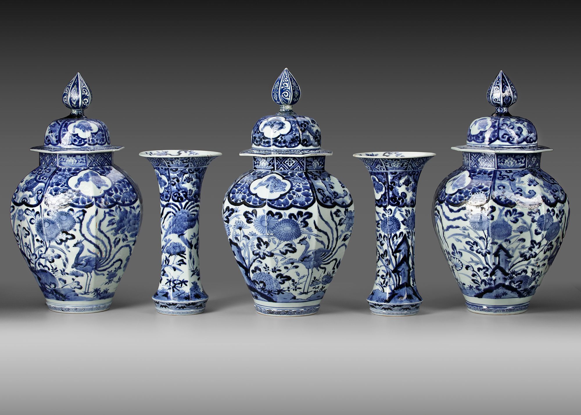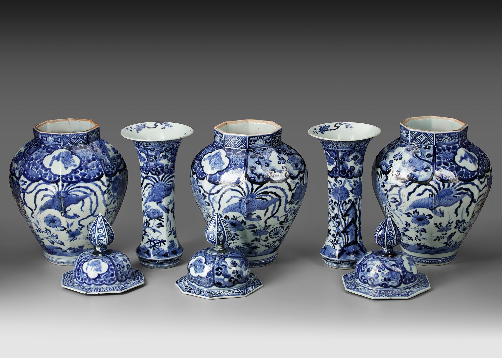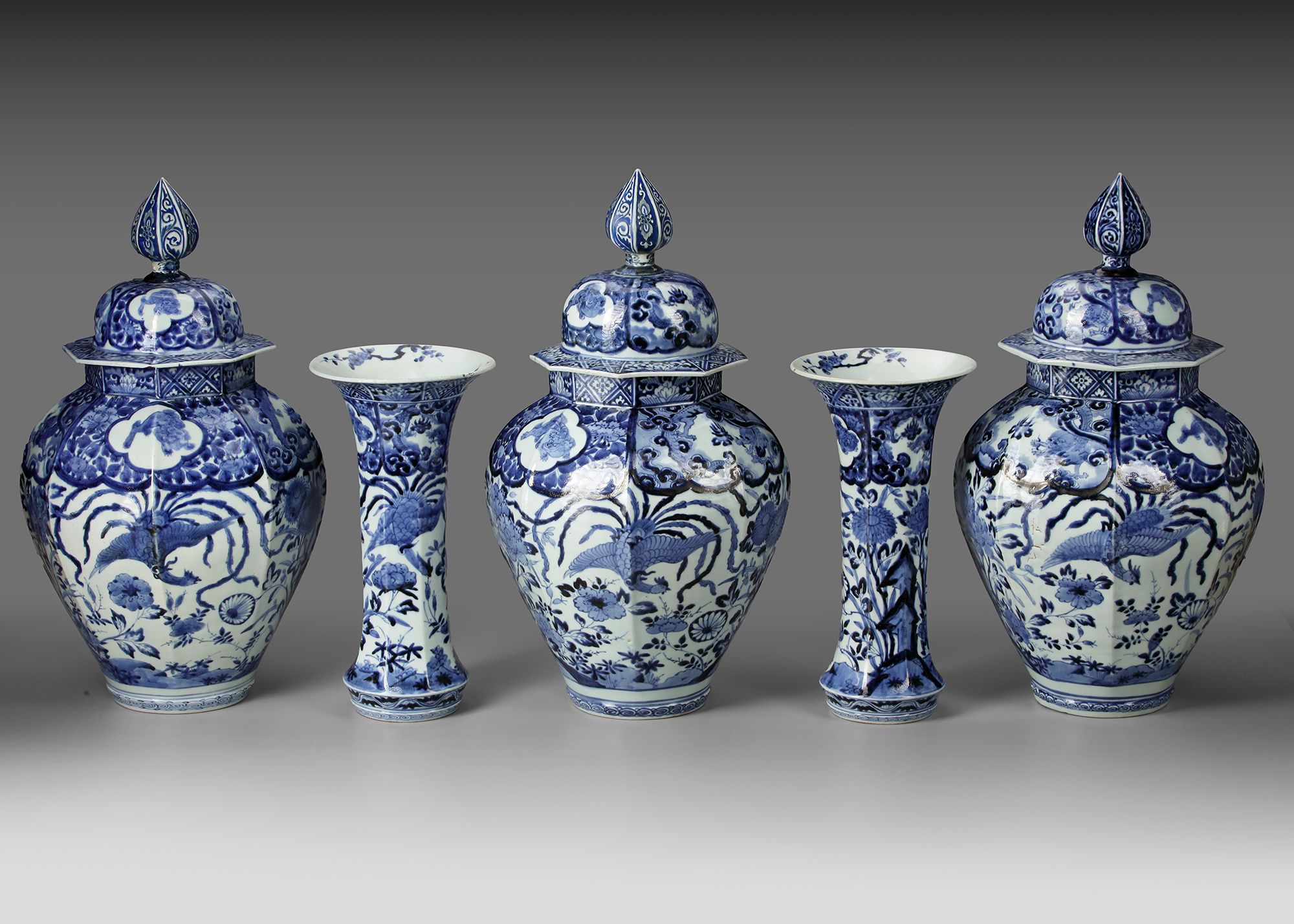 Blue/white Japanese porcelain Arita cabinet set with decoration of bird and floral motifs, circa 1700.