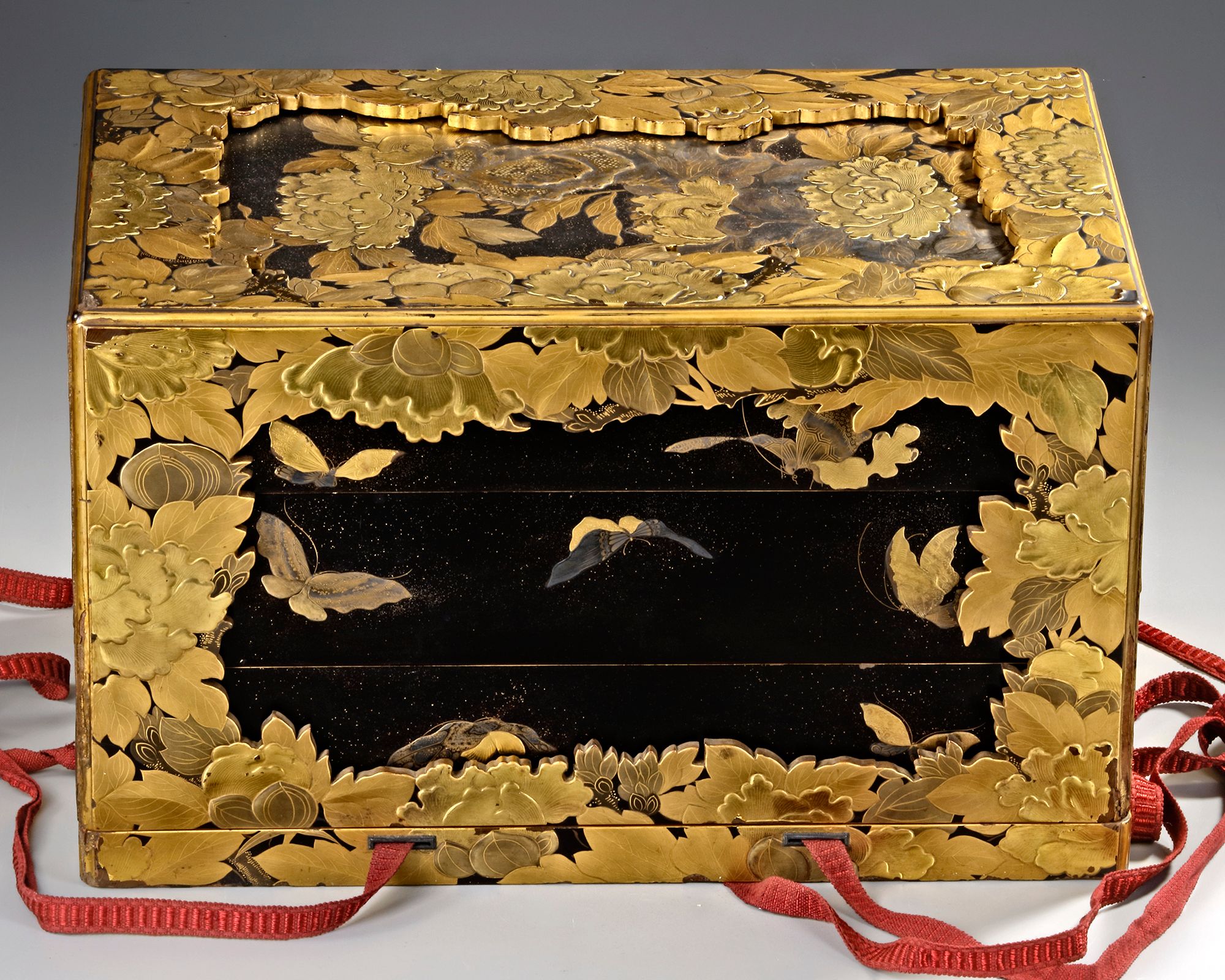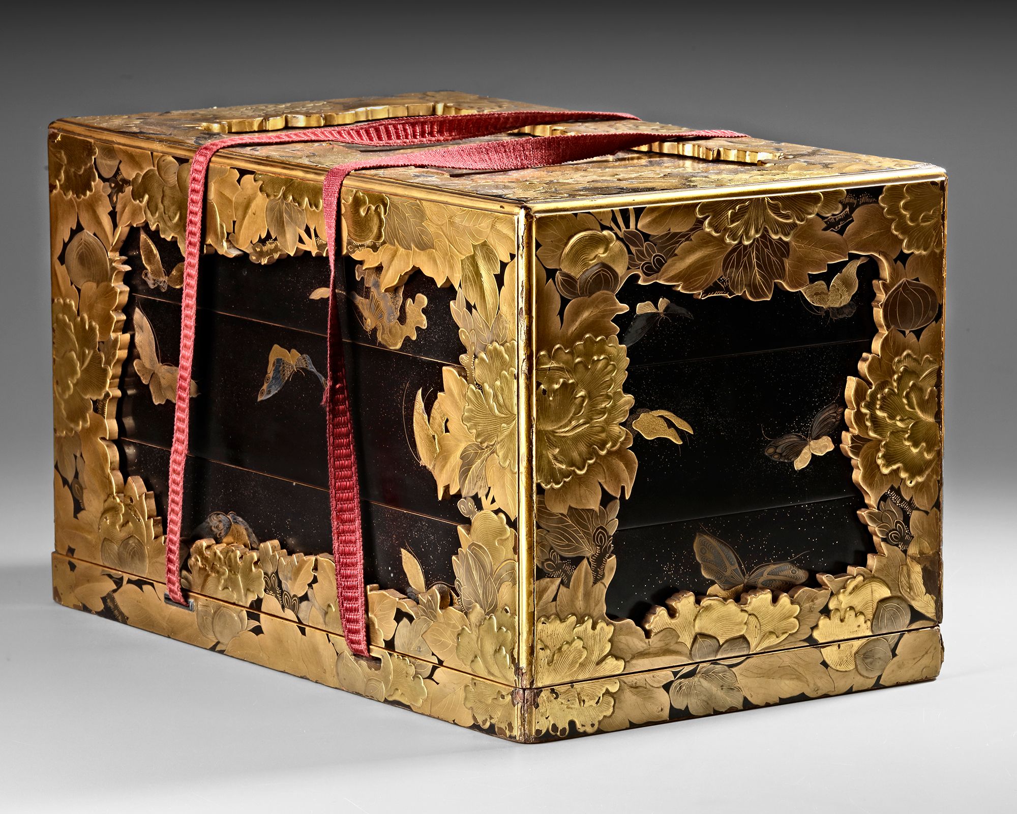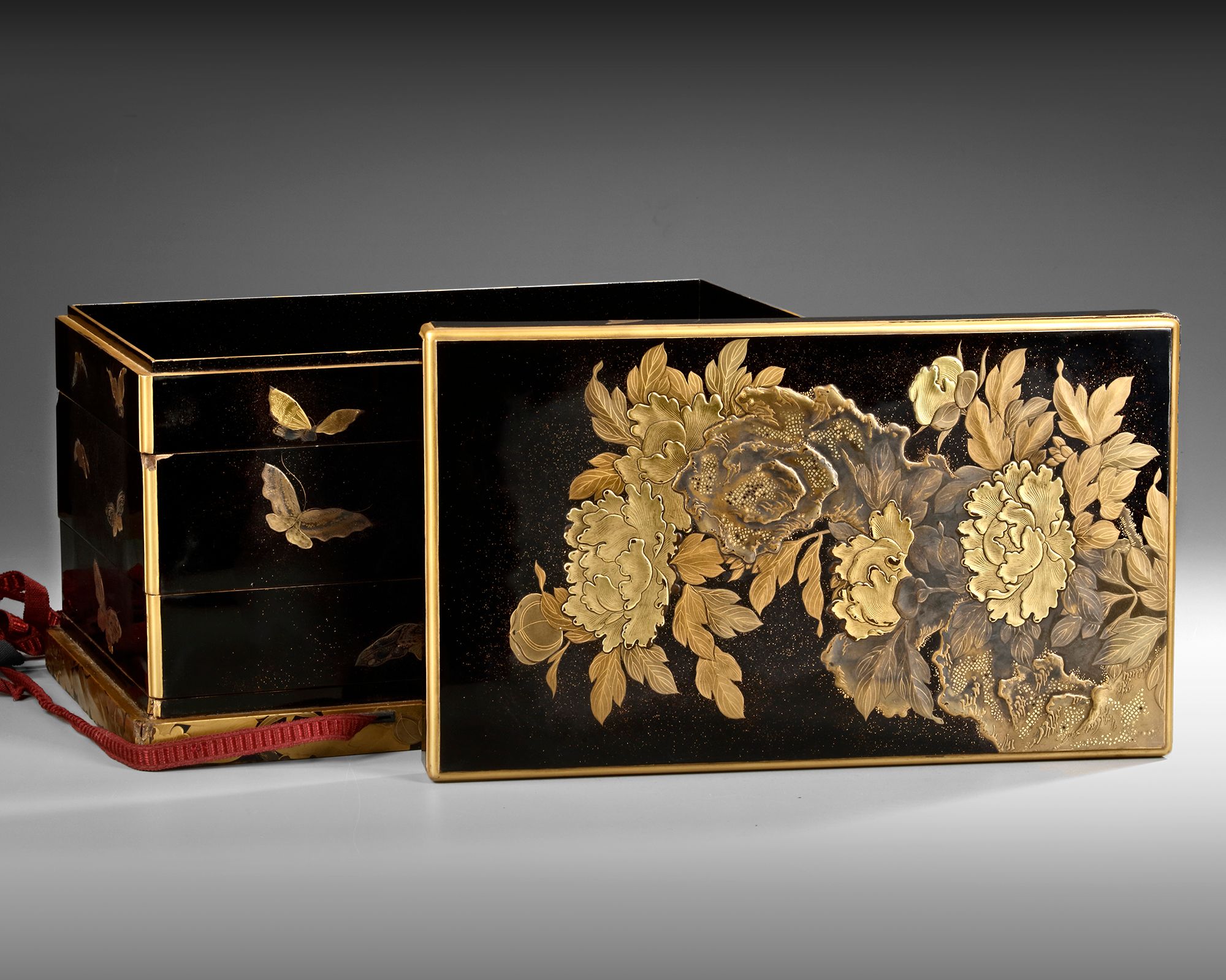 A black lacquered sandan jubako box consisting of three trays on a base and with a lid. The trays are decorated with butterflies in raised silver- and gold lacquer (takamakie) and some sprinkled nashiji-lacquer. The lid decorated with a design of peony flowers in raised takamakie-lacquer and gold flakes (hirame). The jubako fit in a five sided box with openwork panels at each side, the box is all over decorated with a carved designs of peony flowers in silver- and gold makie-lacquer.