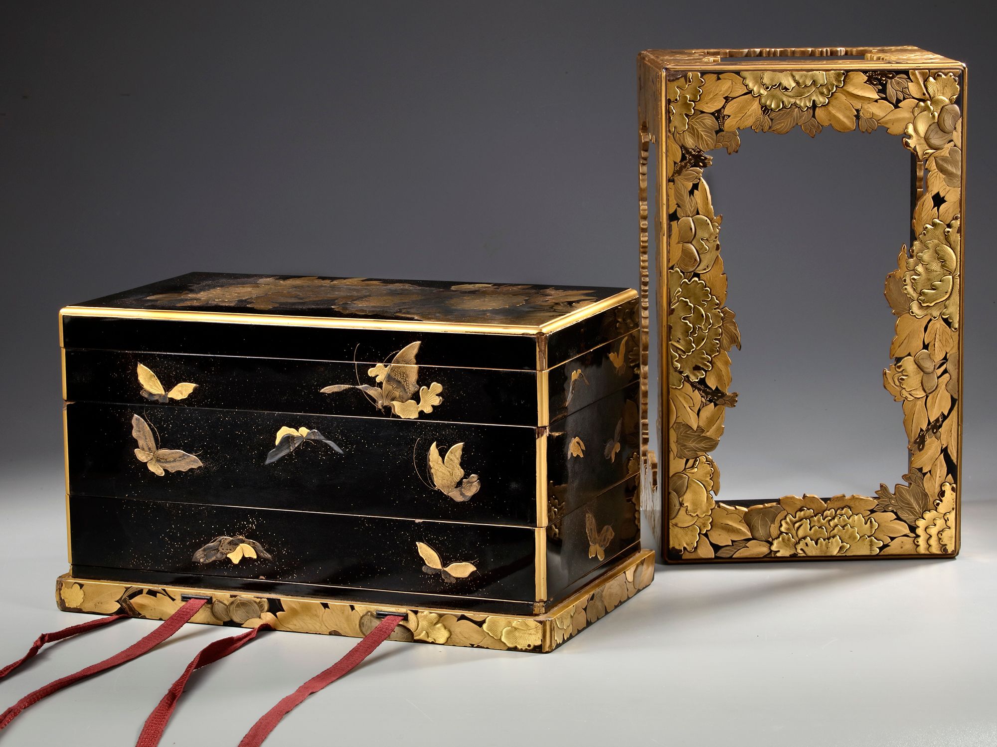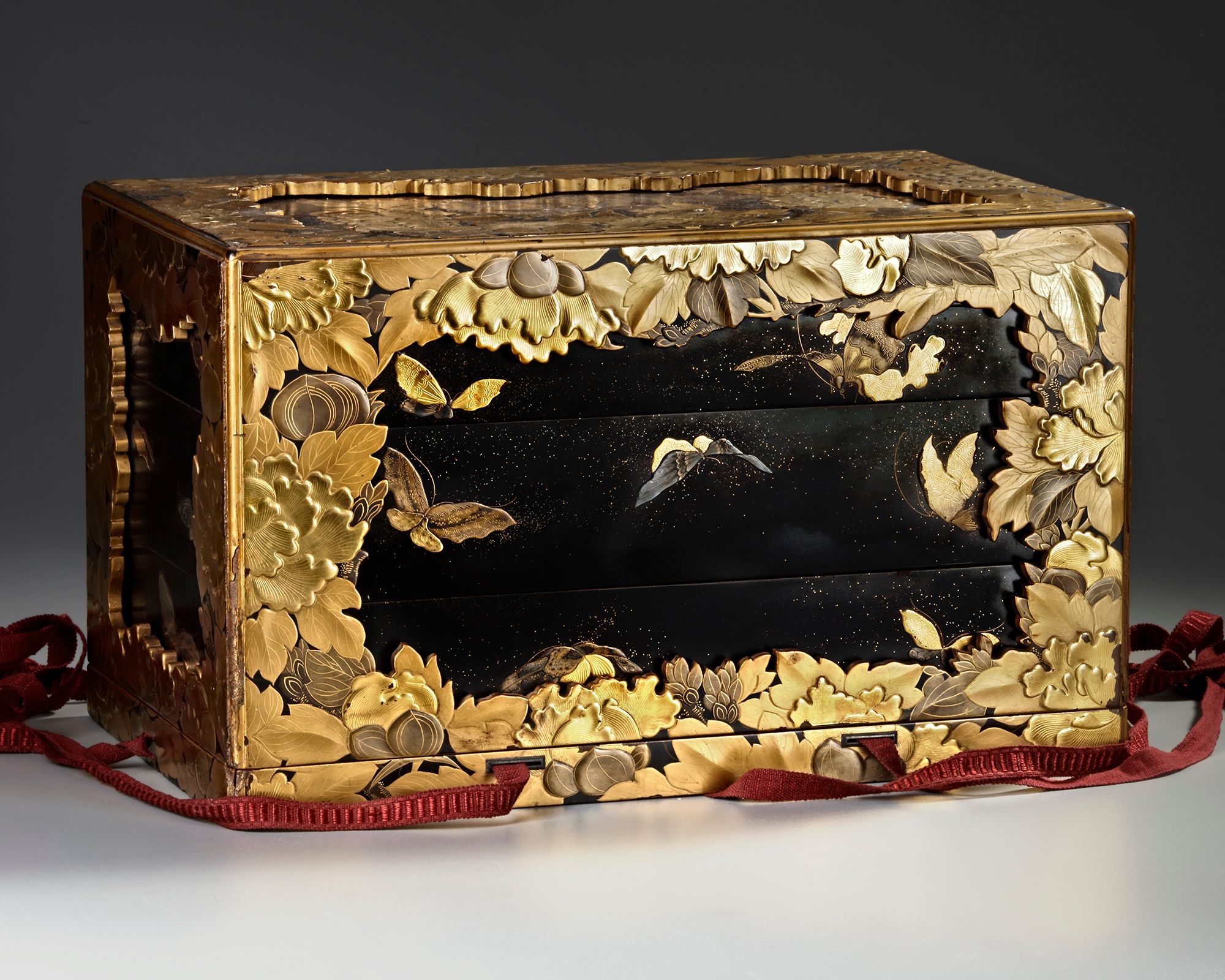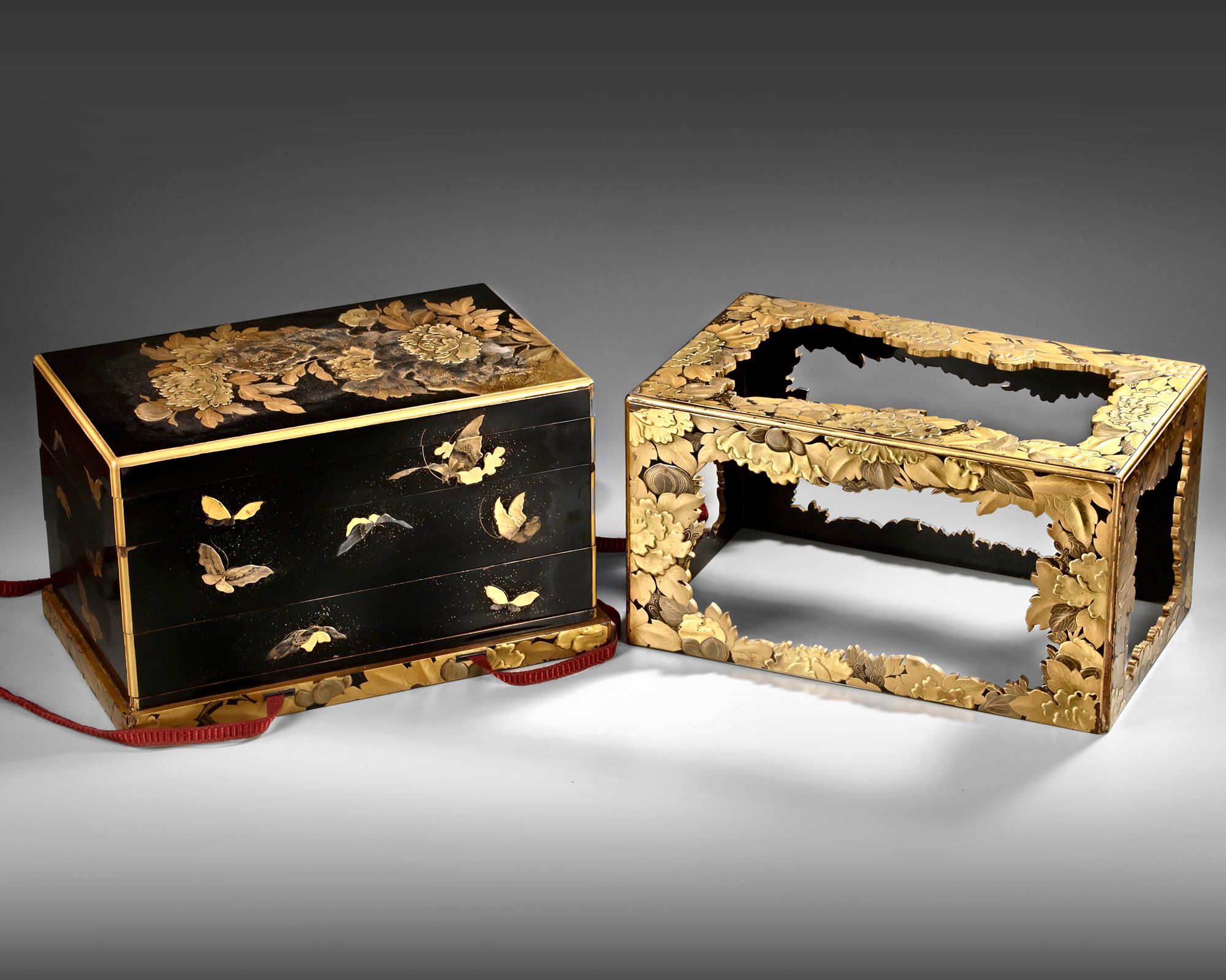 A black lacquered sandan jubako box consisting of three trays on a base and with a lid. The trays are decorated with butterflies in raised silver- and gold lacquer (takamakie) and some sprinkled nashiji-lacquer. The lid decorated with a design of peony flowers in raised takamakie-lacquer and gold flakes (hirame). The jubako fit in a five sided box with openwork panels at each side, the box is all over decorated with a carved designs of peony flowers in silver- and gold makie-lacquer.