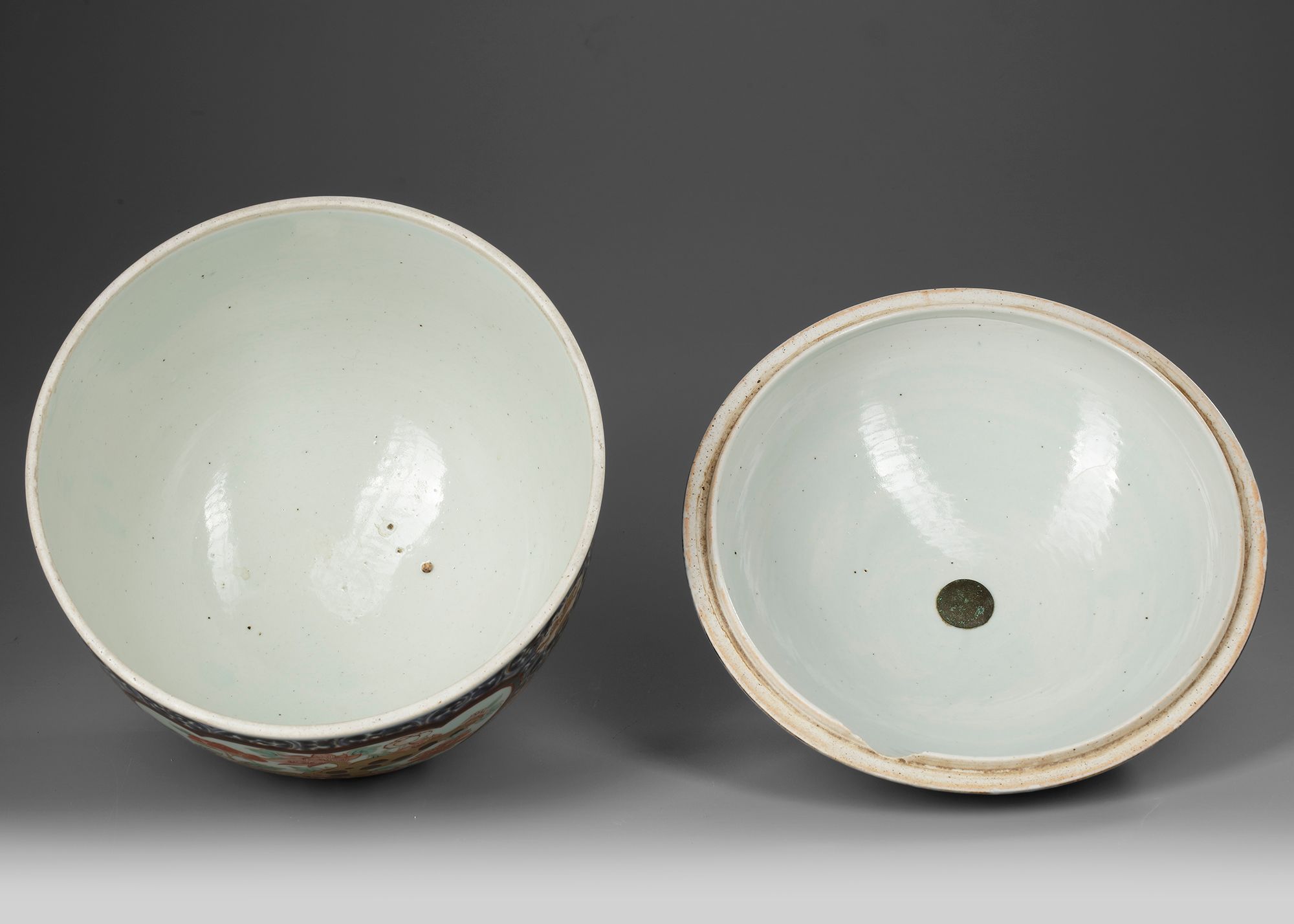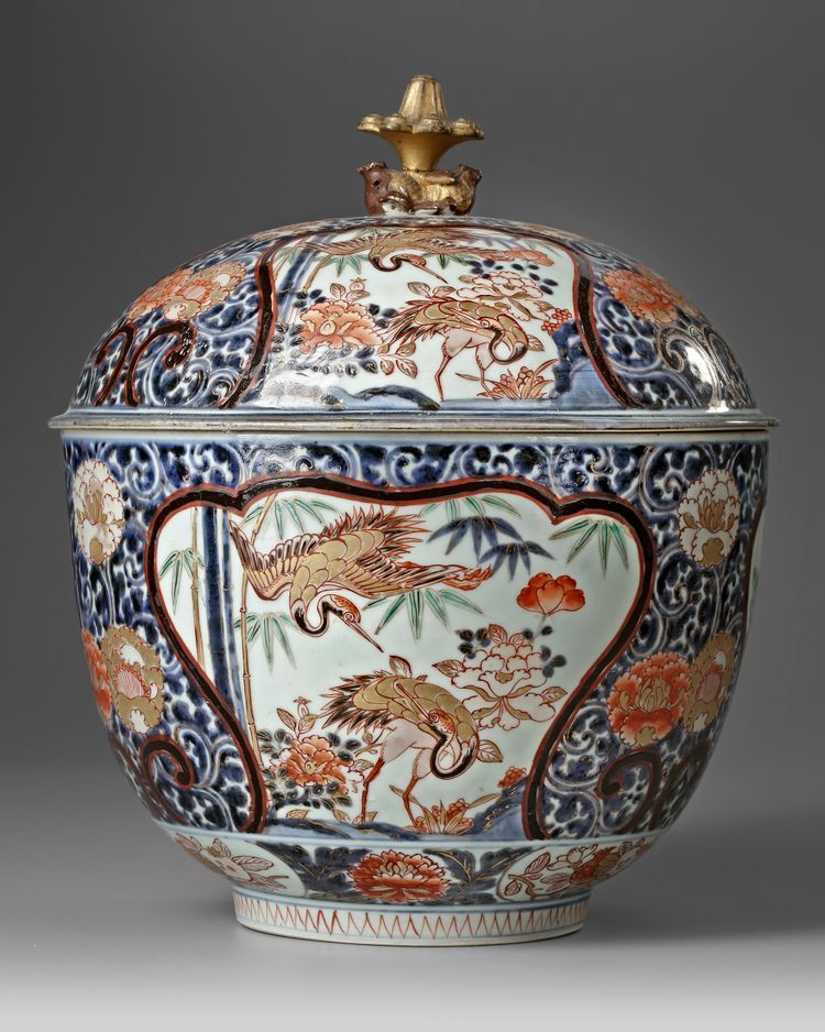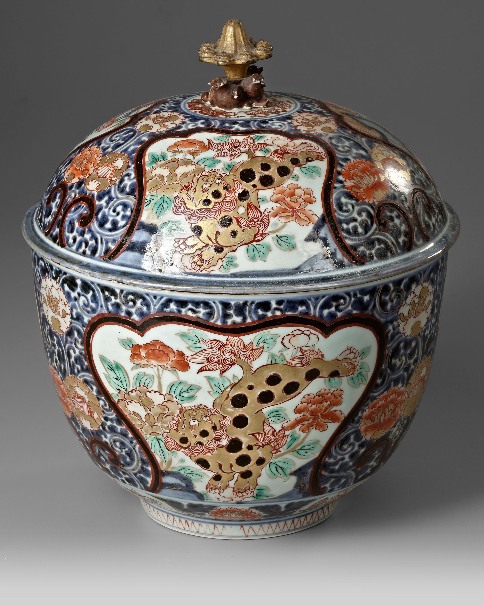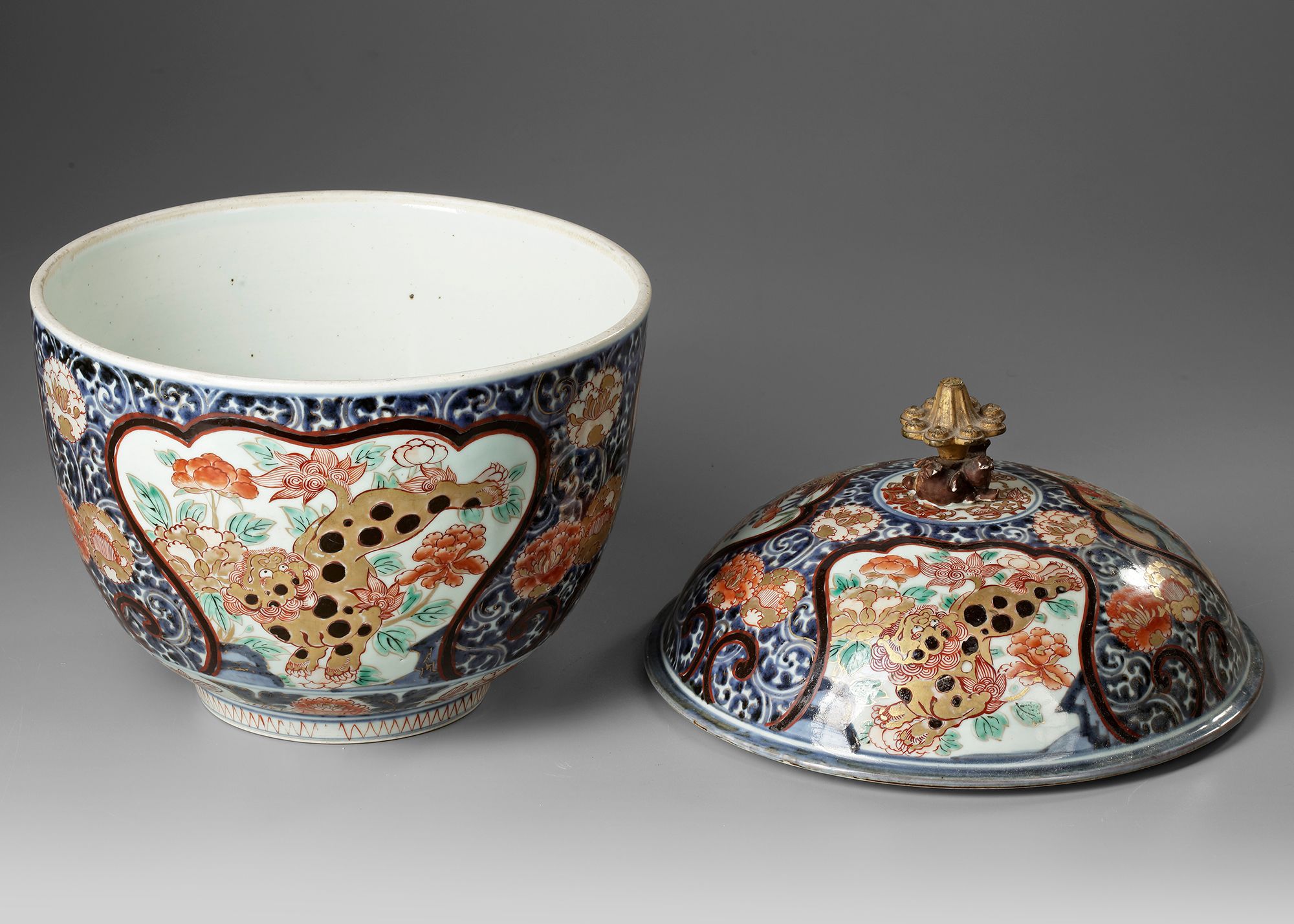 The body of the bowl is decorated with alternating panels, each depicting traditional motifs. One panel showcases a spotted mythical creature, likely a karashishi (lion dog), amidst chrysanthemums and stylized foliage, while the other panels display detailed floral arrangements. The palette is dominated by Imari’s signature colors—iron red, cobalt blue, and gold. Height with cover : 33 cm
