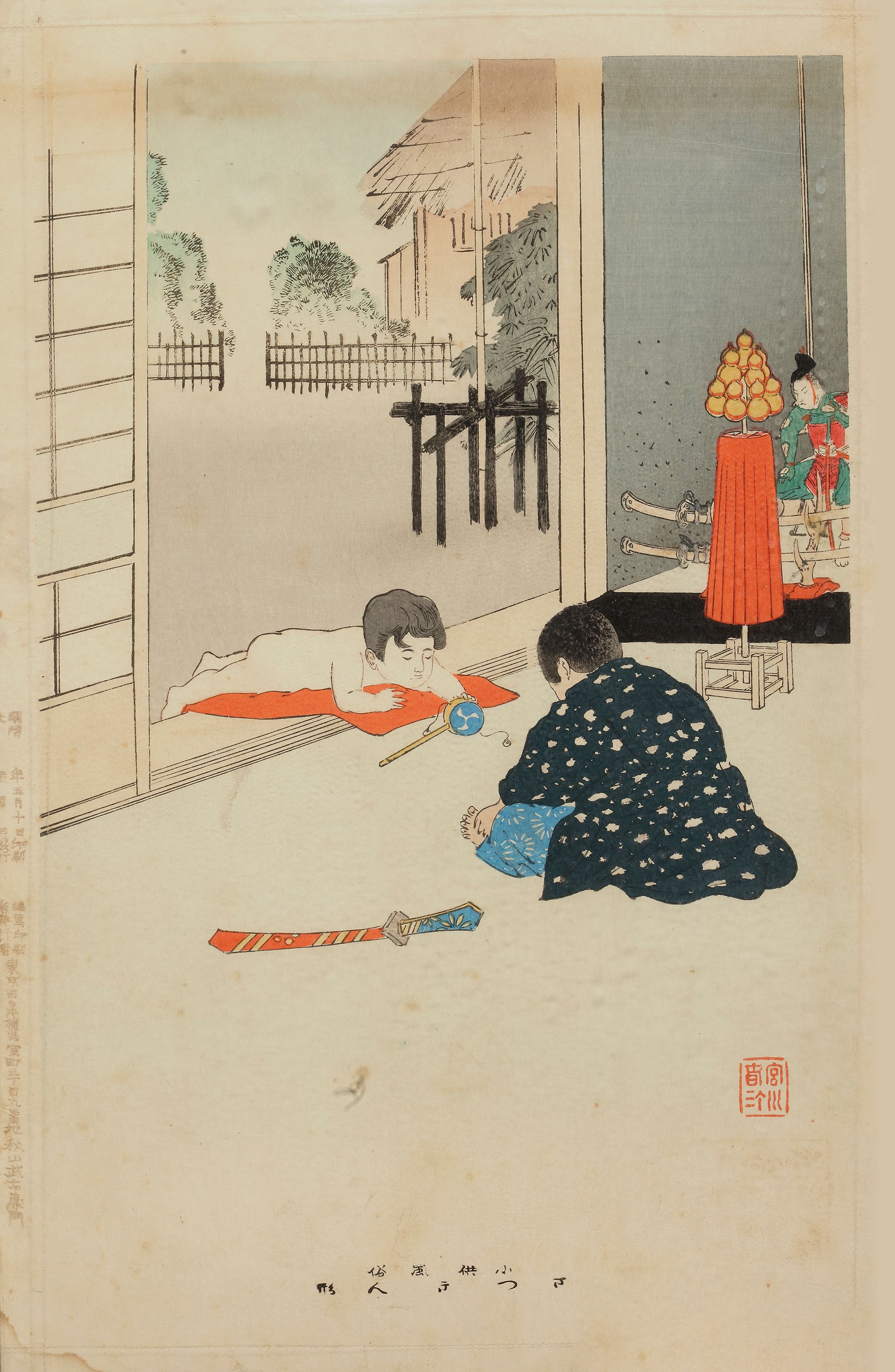 A serene indoor scene of two children playing with traditional toys, accompanied by a decorative sword. The background reveals a garden through open sliding doors, with an altar visible nearby.