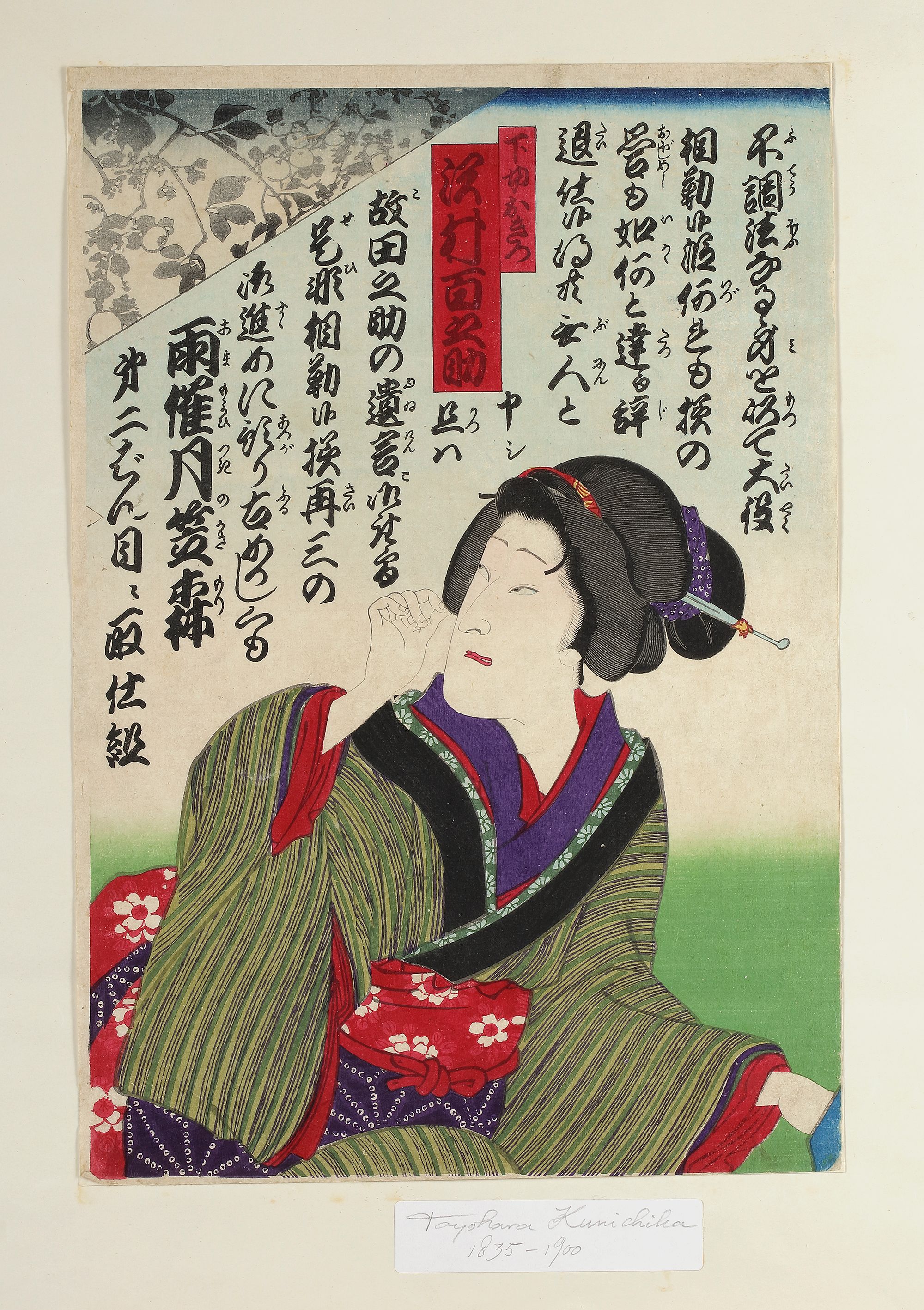 A finely detailed Japanese woodblock print depicting a graceful bijin (beautiful woman) dressed in an elegant green and red kimono with intricate patterns.