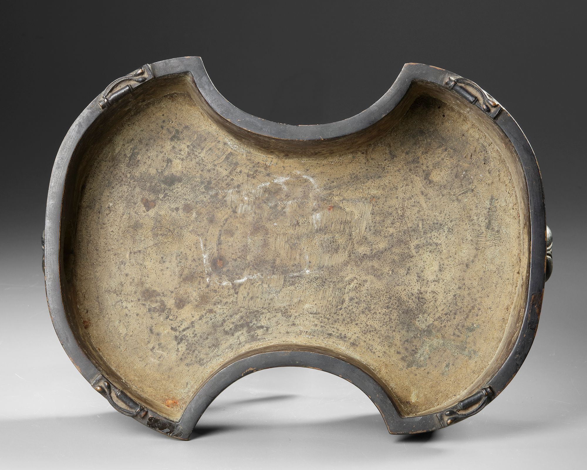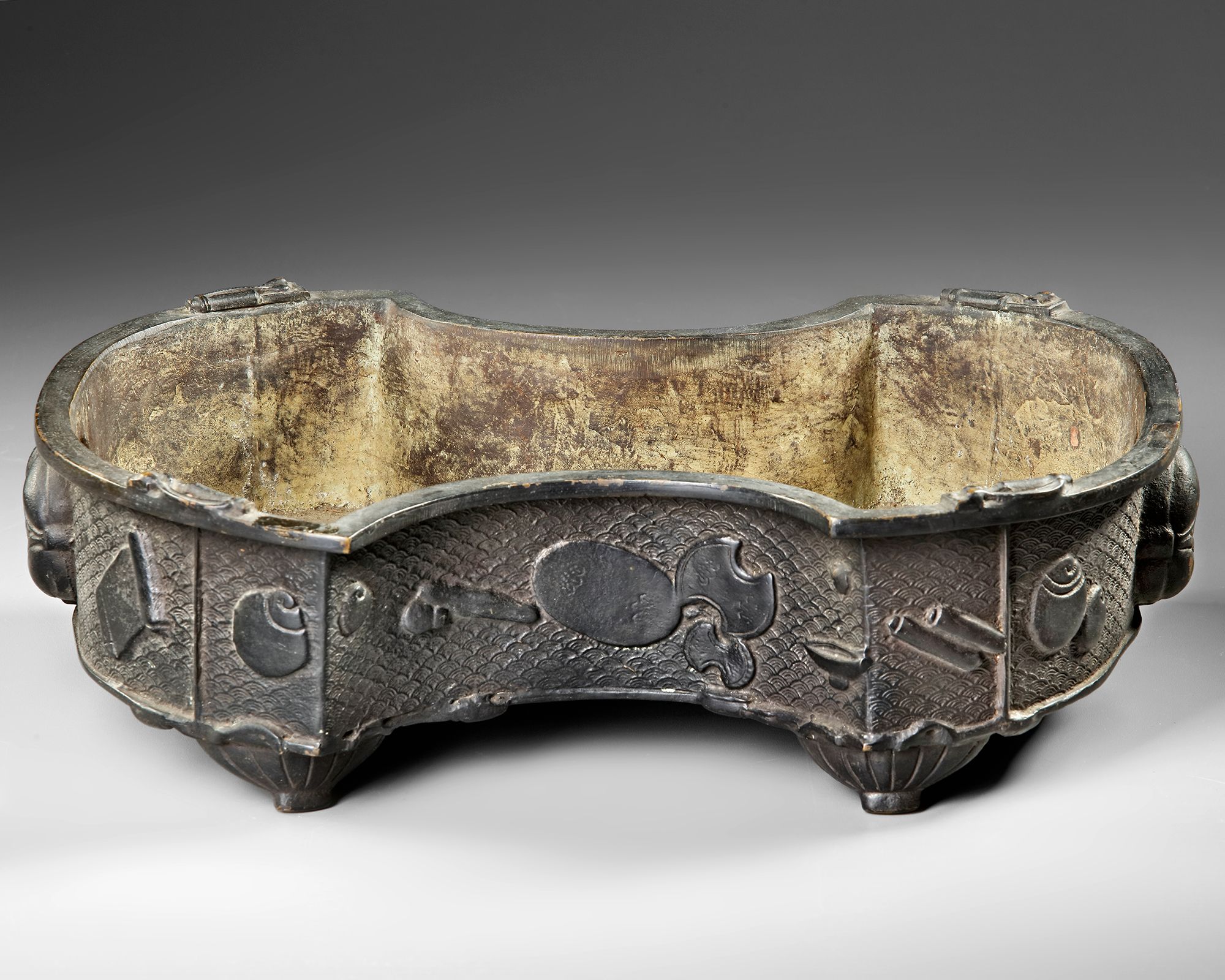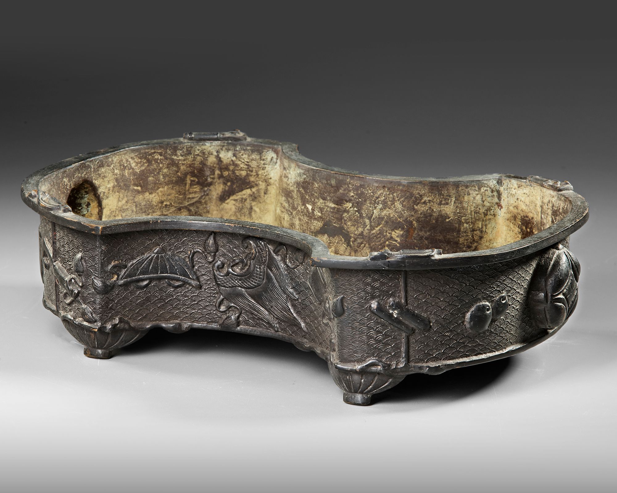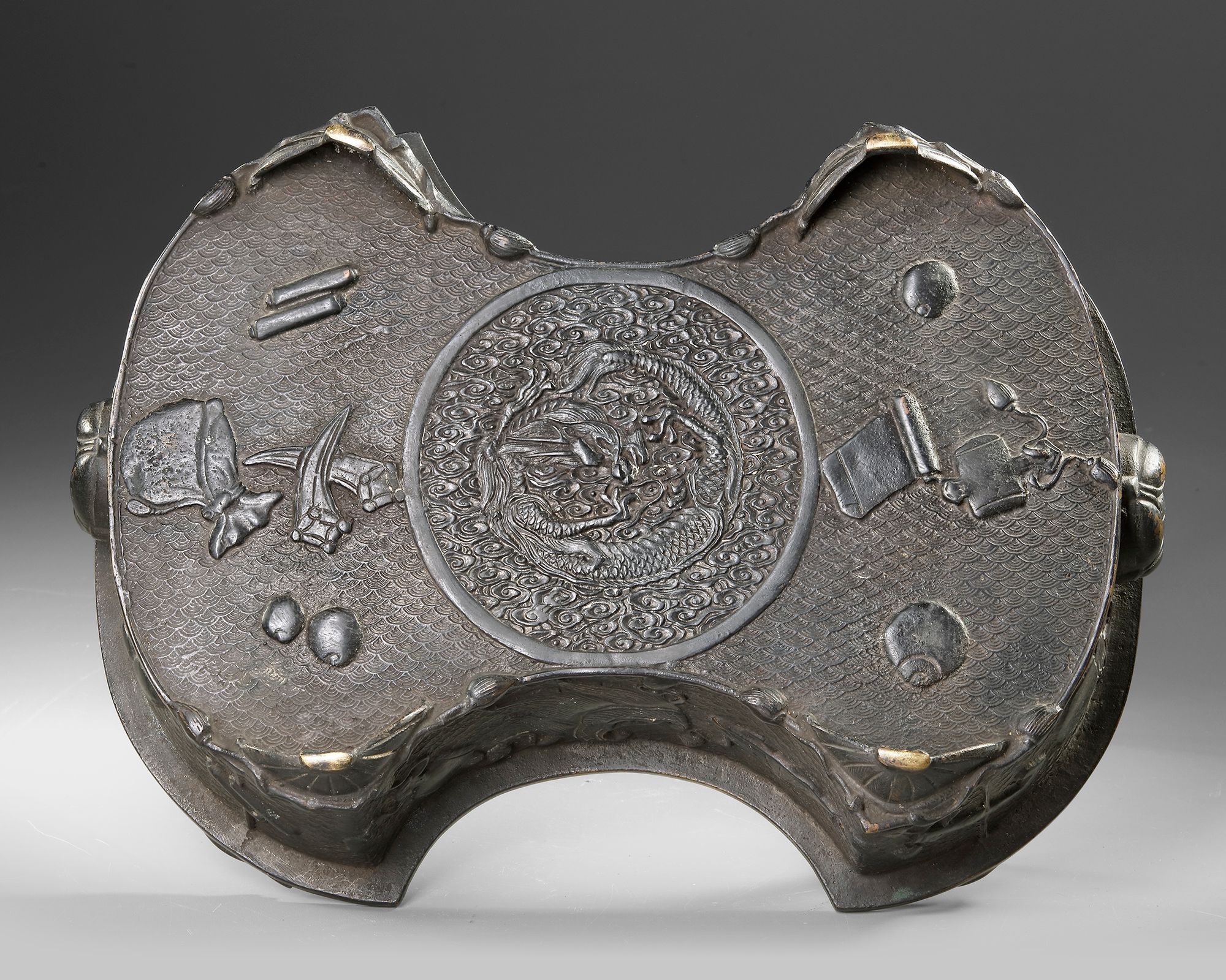 With allover decorated with buddhistic symbols. On the reverse side and embossed circular decoration of a dragon. 39 by 28 by 10 cm.