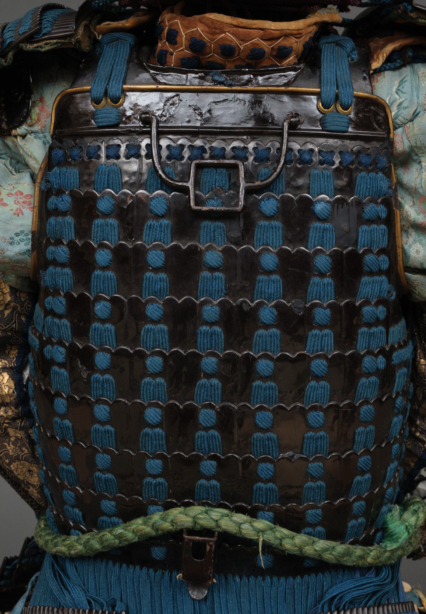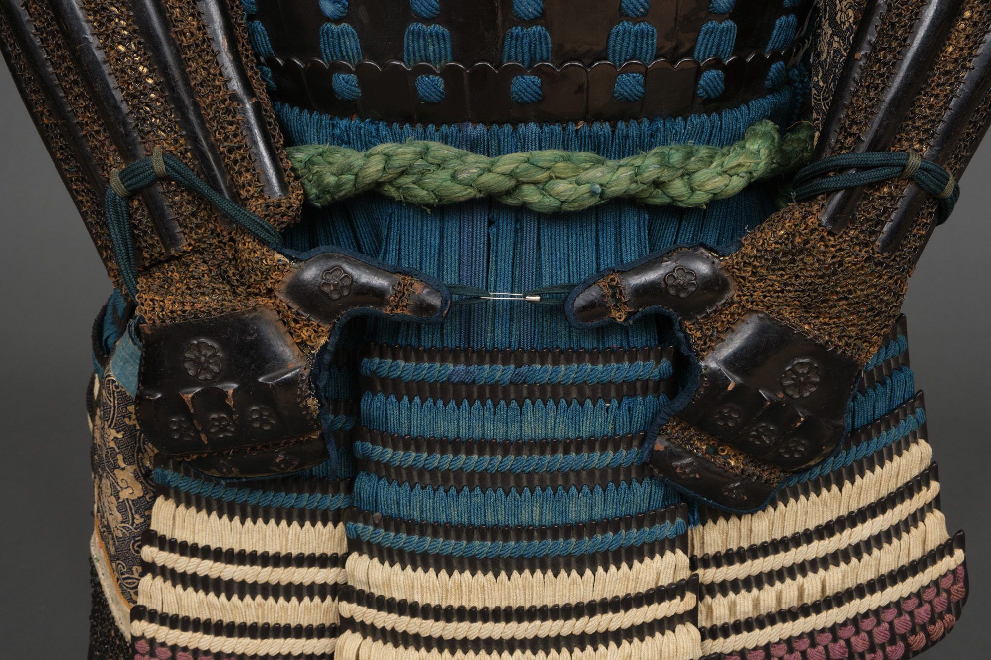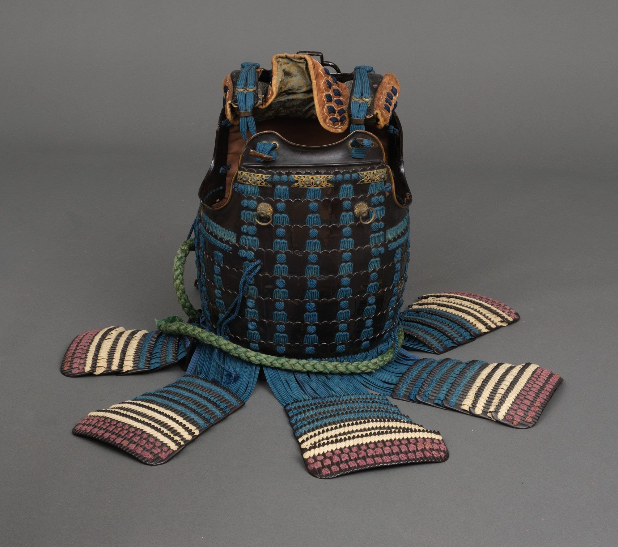 Hanging from the cuirass 7-parts of 5-piece ‘kiritsuke kozane’-plate kusazuri (tassets). Around the waist a cord uwa’obi (waist band).