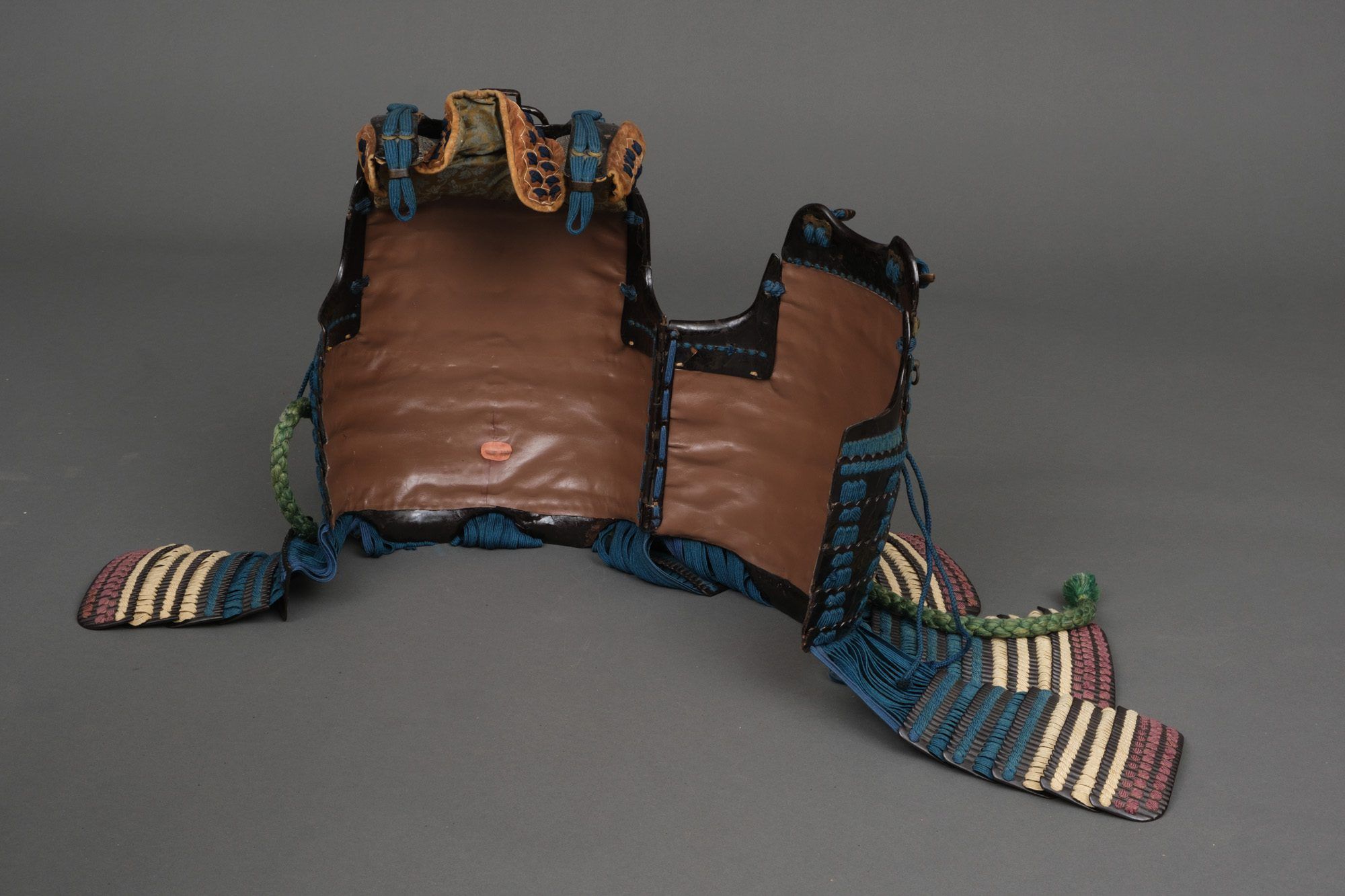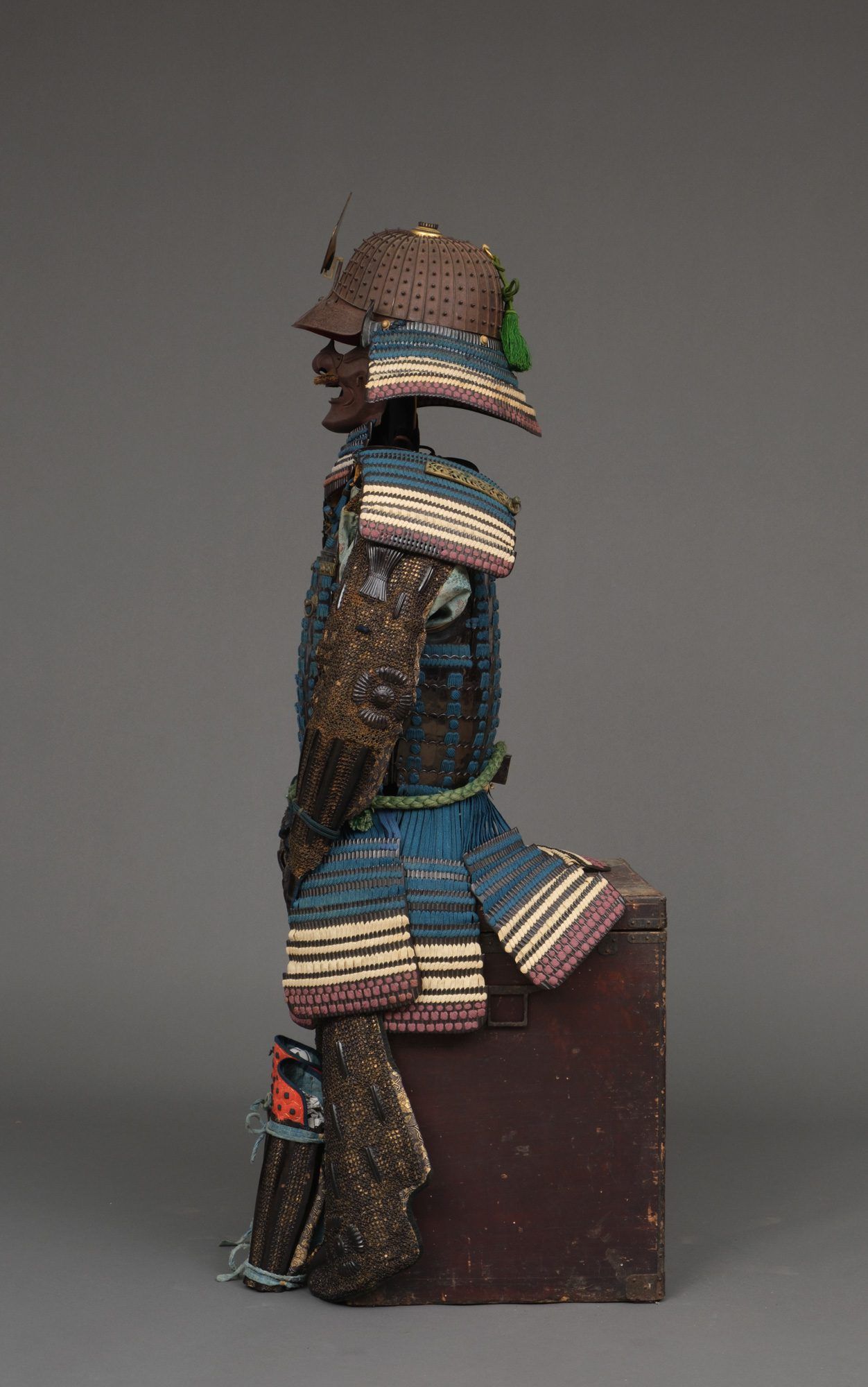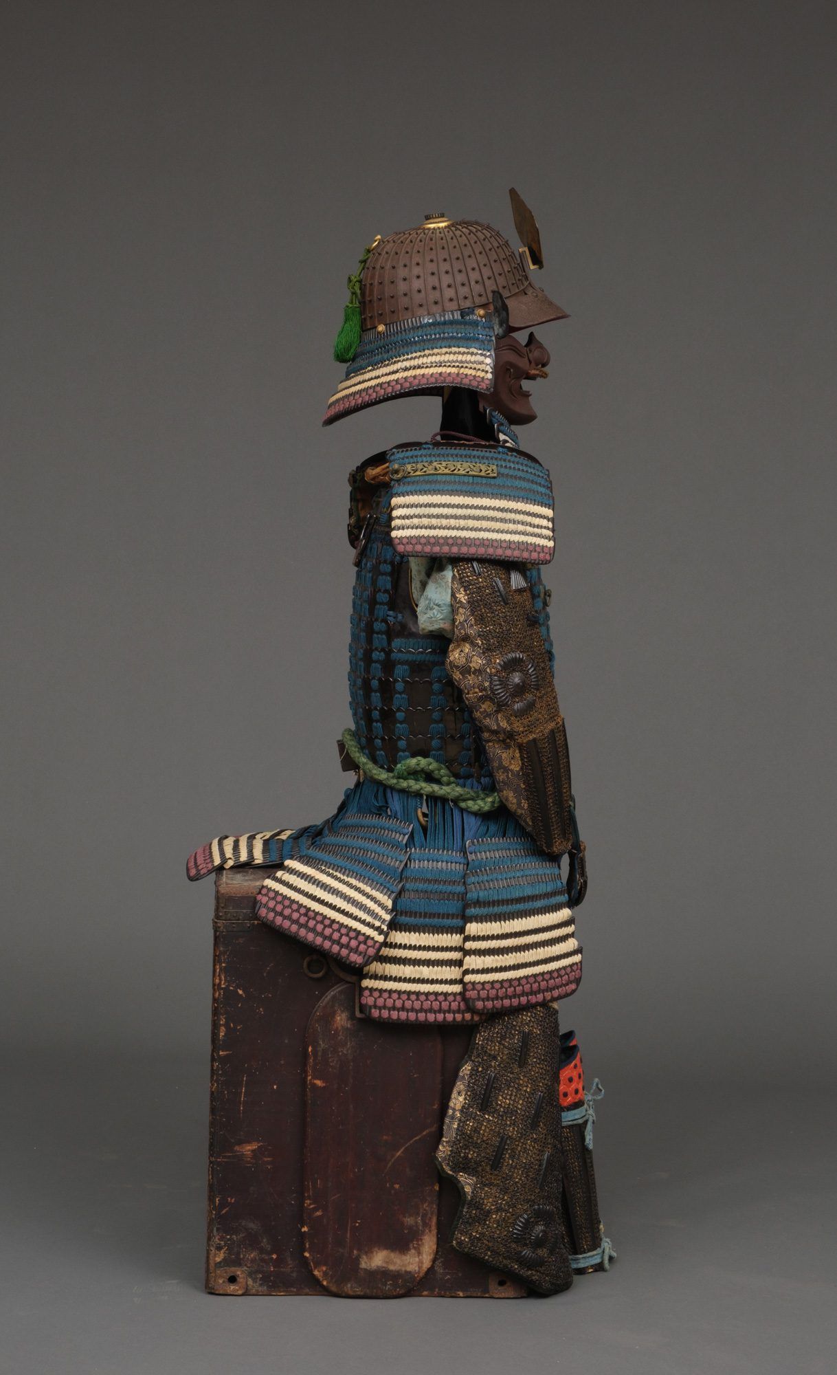 Hanging from the cuirass 7-parts of 5-piece ‘kiritsuke kozane’-plate kusazuri (tassets). Around the waist a cord uwa’obi (waist band).