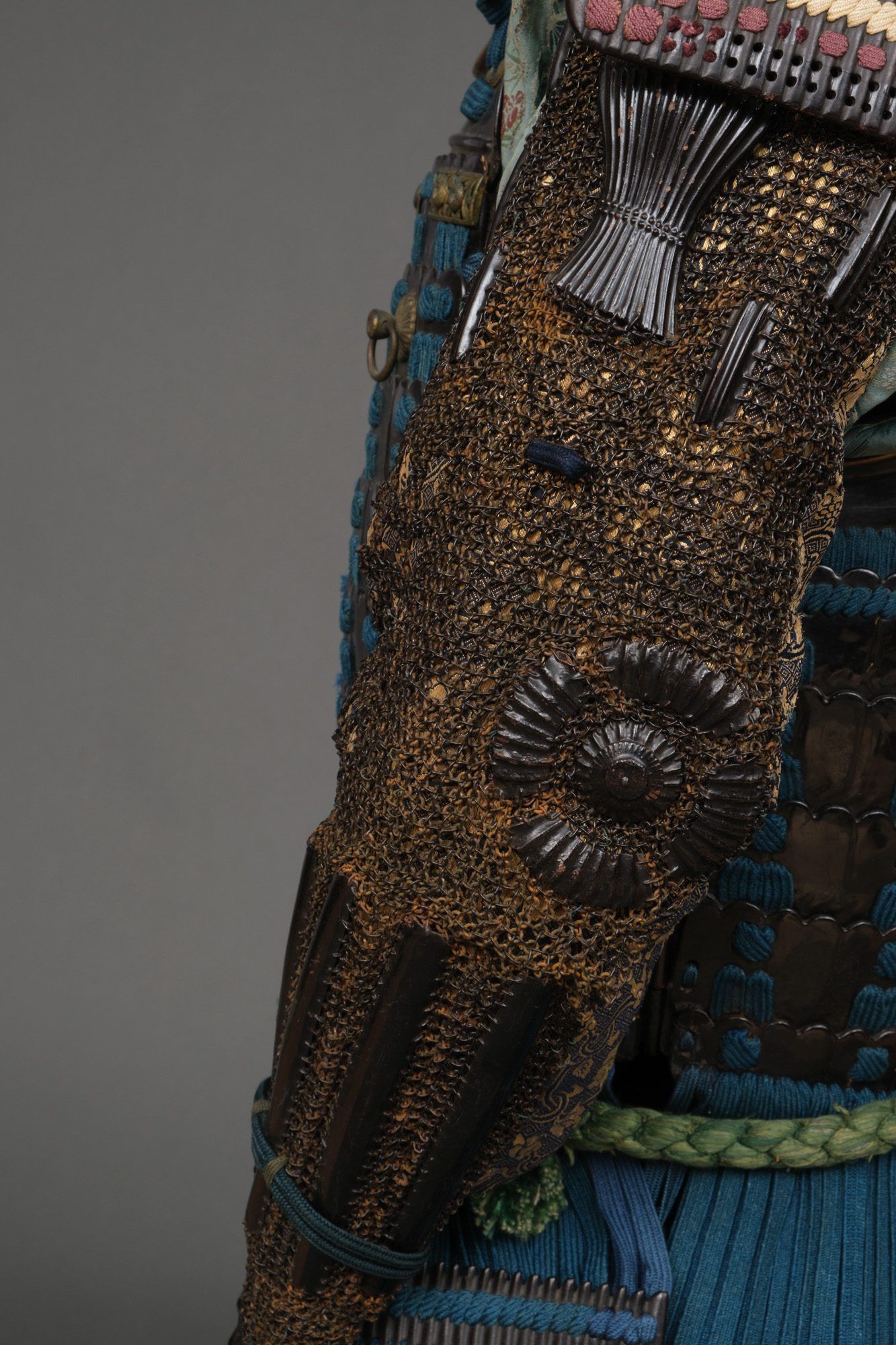 – Haidate (thigh armour), etchû-type, small lacquered plates, oblong and kiku-shaped, connected by Japanese mail.