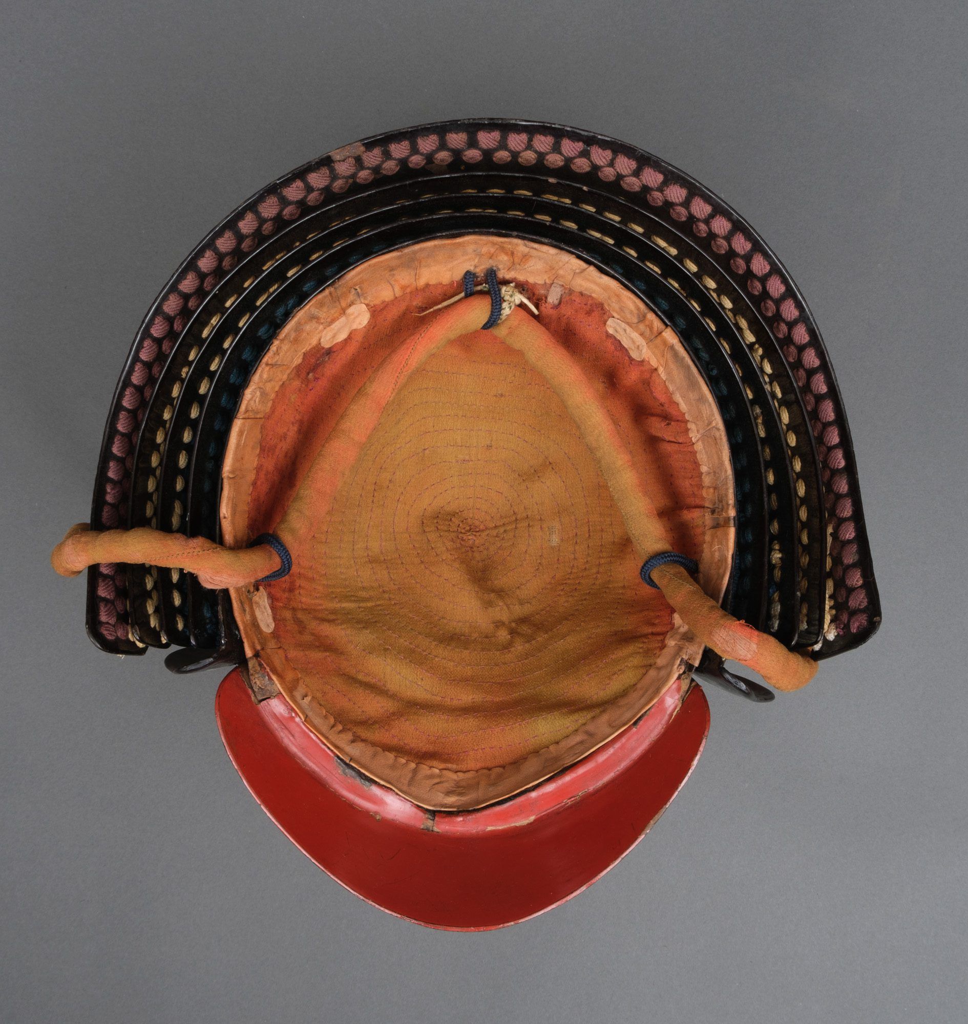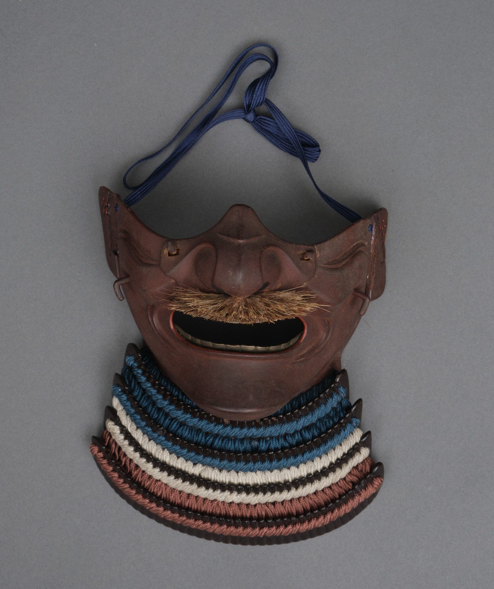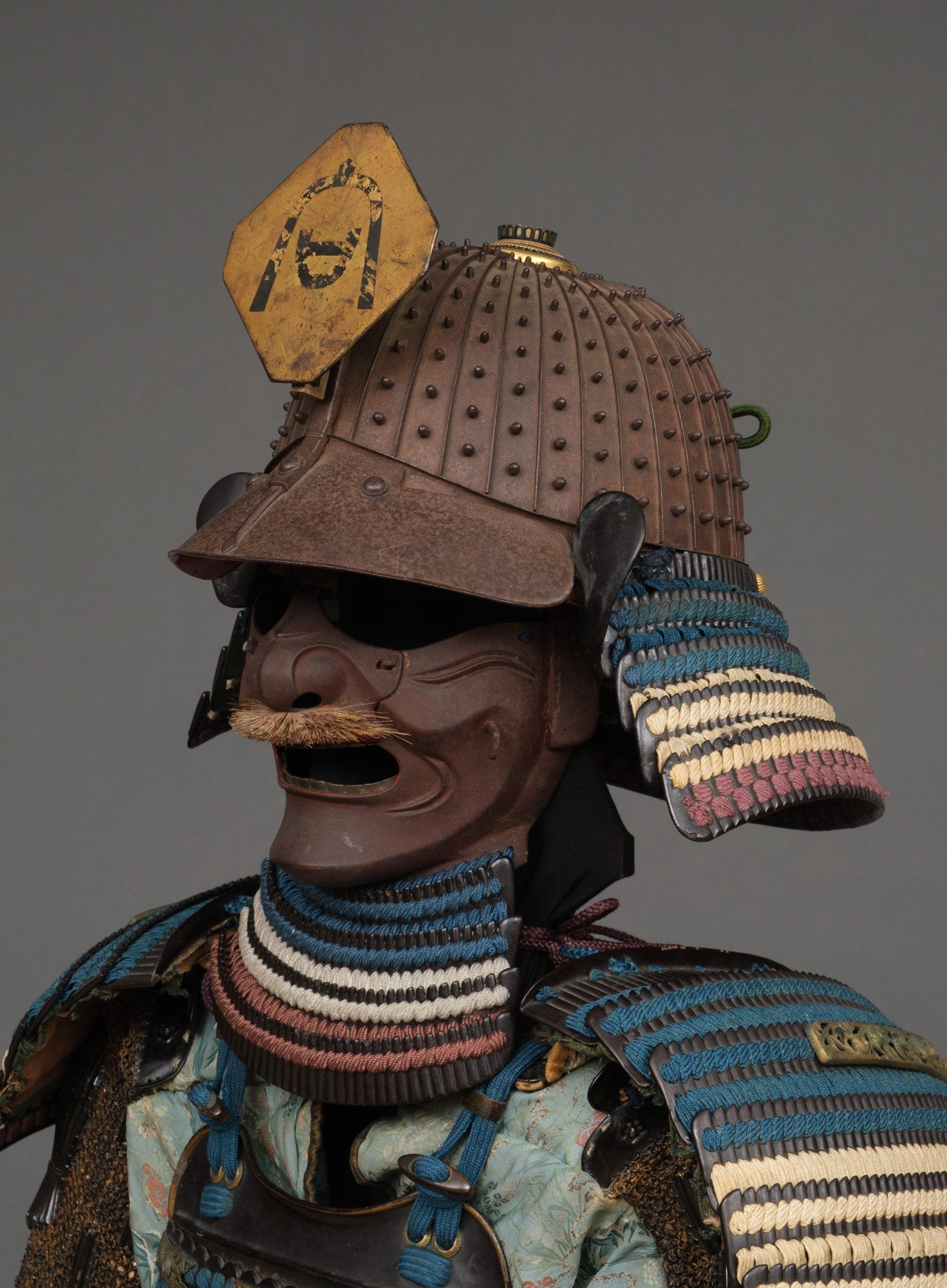 – ‘Russet iron’ ‘Angry man’-facial mask (resseibô) with brown moustache, gold lacquered teeth, separate nose-piece, pair of orekugi (helmet cord tying hooks), ‘ase nagashi no ana’ (sweat running hole), and 4-tiered ‘kiritsuke kozane’-plate gorget (yodarekake).