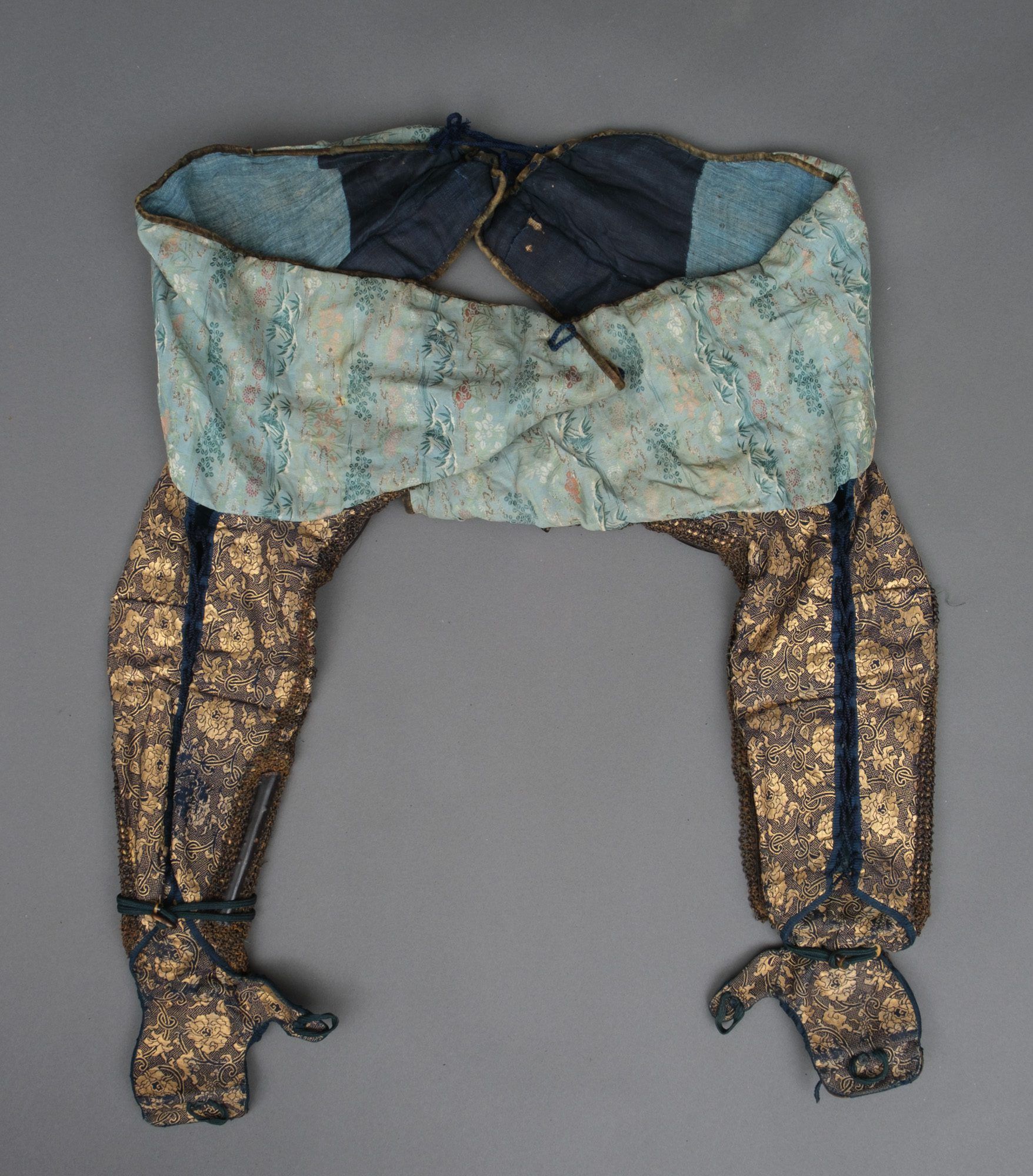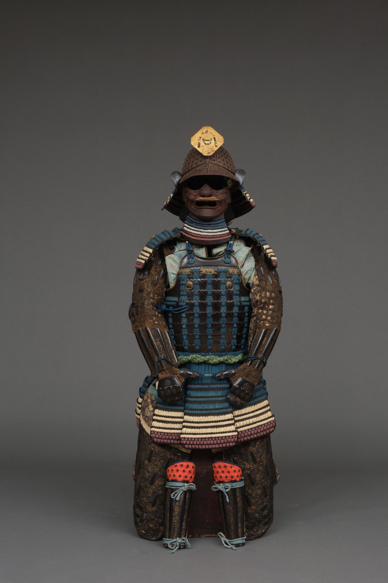 – Suneate (shin guards), shino-type, long metal plates connected by Japanese mail with a blue tateage (knee guards) and en-suite fabric.