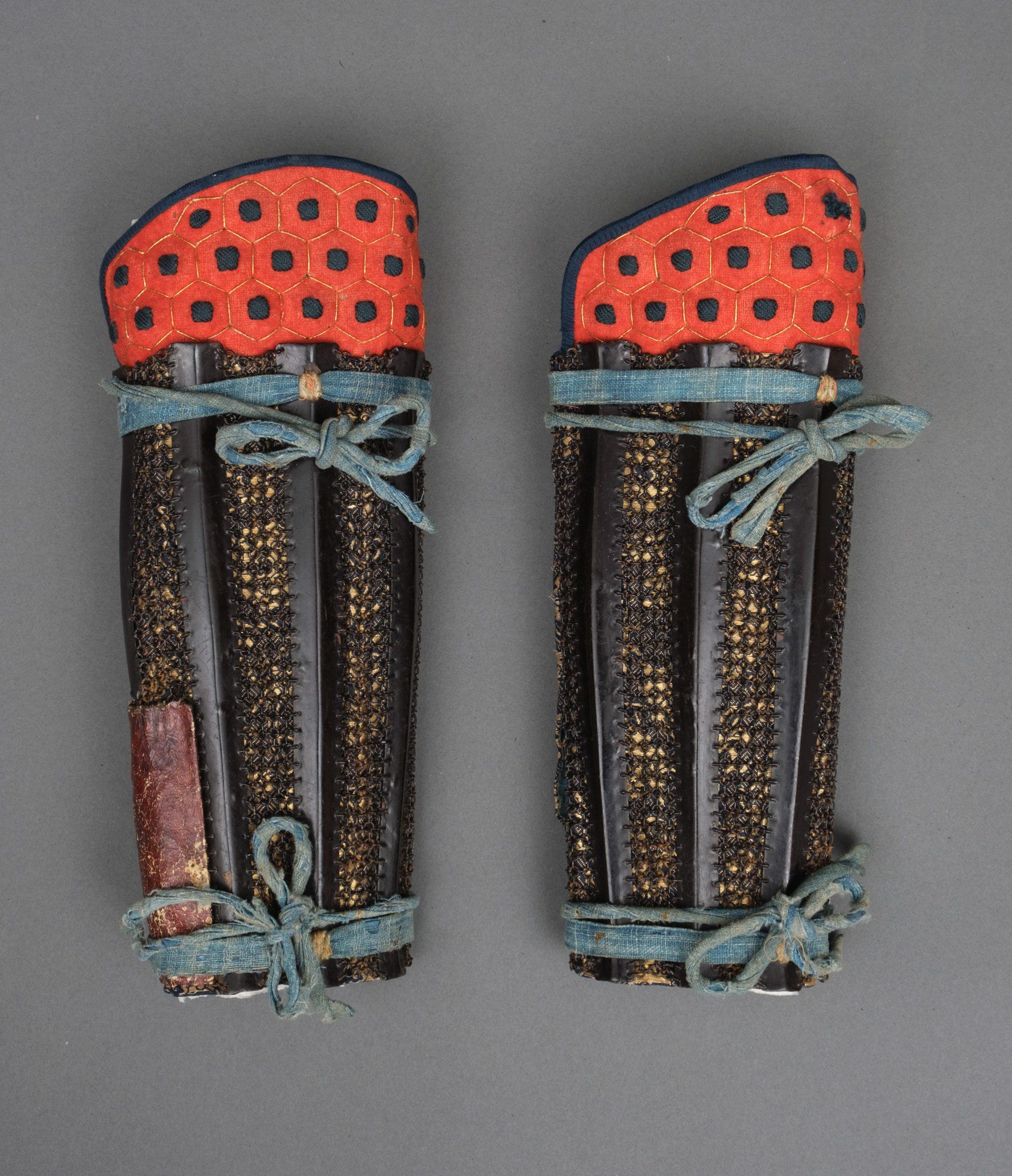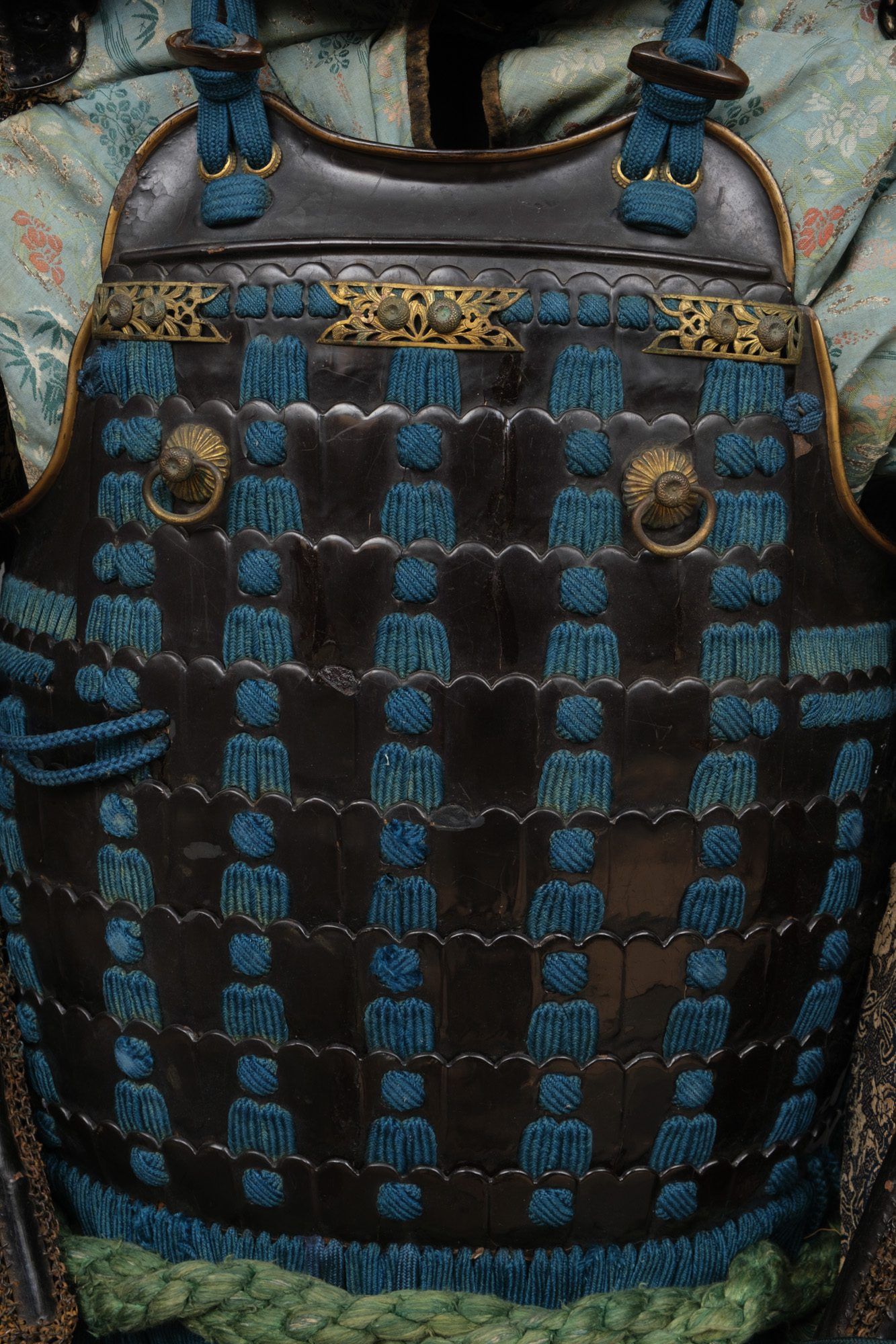 – Kote (bracer), hisago-type 瓠 (bottle gourd), constructed with various black lacquered pieces connected by Japanese mail (kaushi-gusari), some of these pieces are in the shape of bottle gourds, hence the name. The hand guards (tekko) decorated with a design of different flower emblems in relief. This whole is placed over dark blue-gold brocade silk with a flower motif.