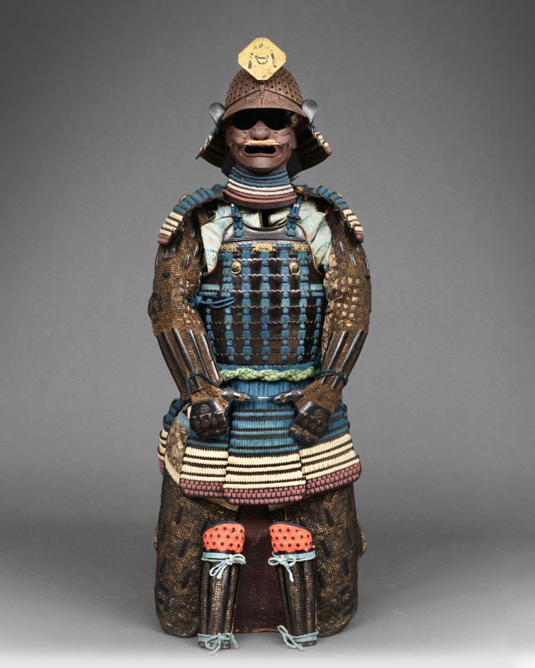 – Dô (cuirass), mogami-type, constructed with rows of black lacquered ‘kiritsuke iyozane’-plates, fitted with a pair of cord rings in front, and the back with various fittings to place a flag (sagemono): hook (gattari) and support for a flag-pole (ukezutsu).
