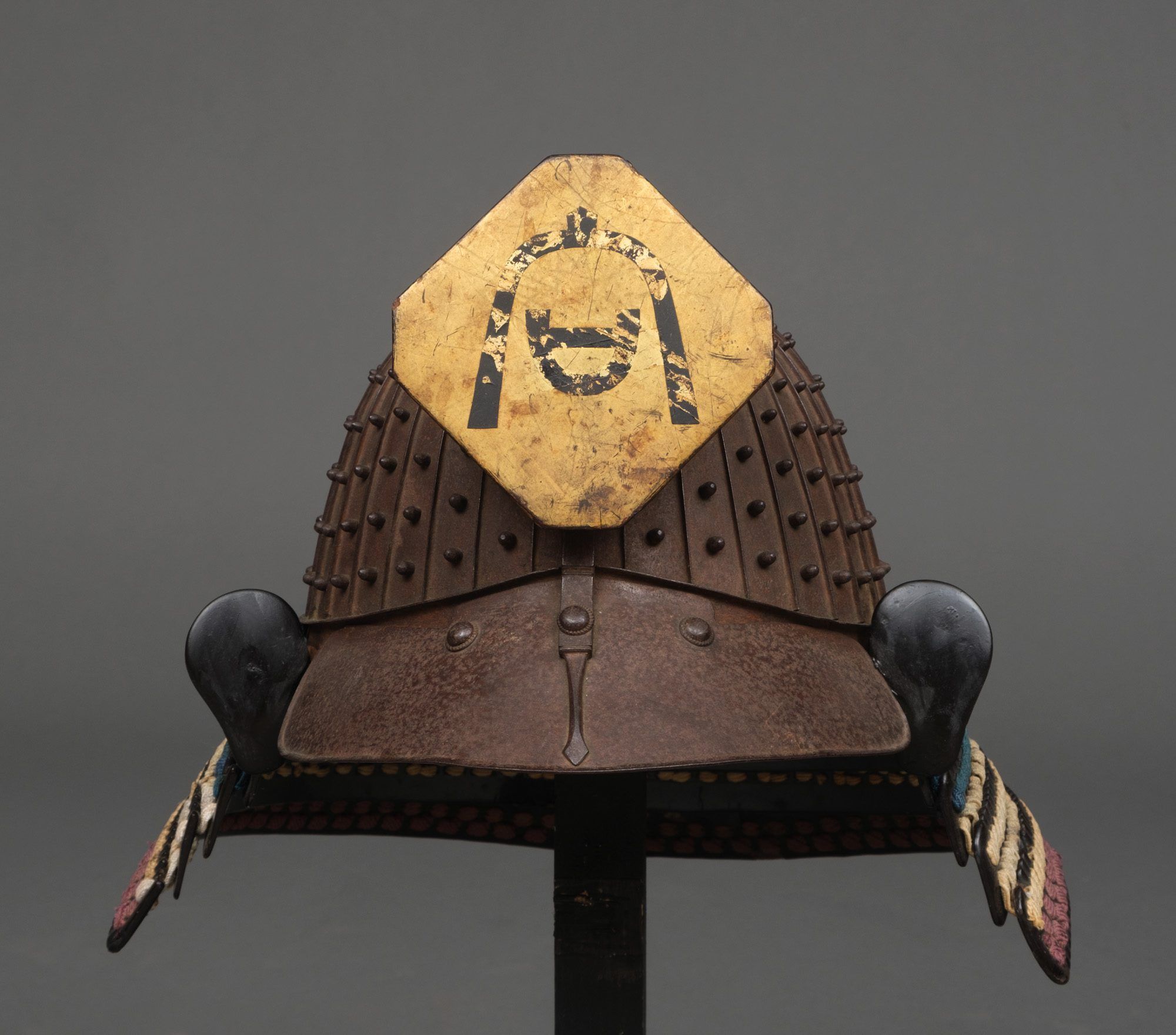 – 32-plate ‘russet iron’ ko’boshi kabuto (helmet with small seated rivets) mounted by a rare gilded wooden maedate (decorative front piece), diamond-shaped with canted corners, featuring a crest of stylized arched kanji 漢字 (Chinese characters).