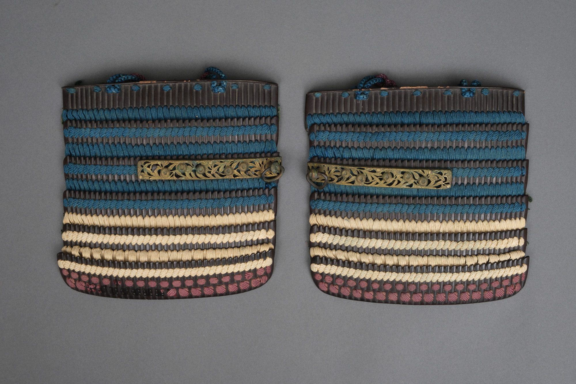 – Sode (shoulder guards), tôsei-type, constructed with 5 rows of slightly arched ‘kiritsuke kozane’-plates fitted with reticulated brass plates with a chrysanthemum (kiku) motif.