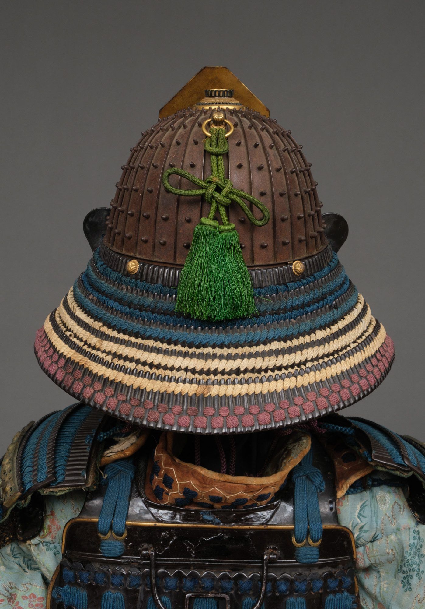7-tiered chrysanthemum-shaped tehen’no’kanamono (decorative apex fitting), 4-tiered black lacquered ‘kiritsuke kozane’-plate shikoro (neck guards), a green silk agemaki (decorative tassel) and small black lacquered fukikaeshi (face guards).