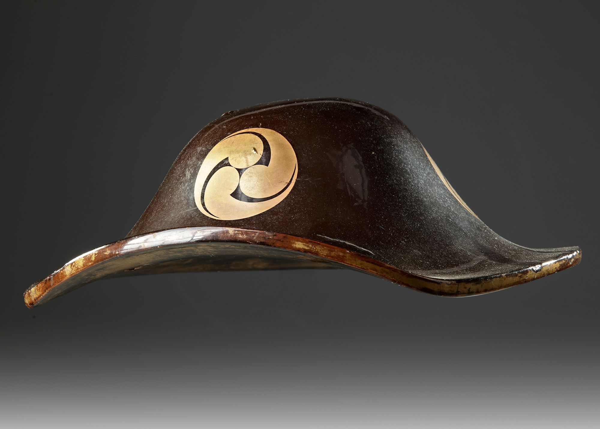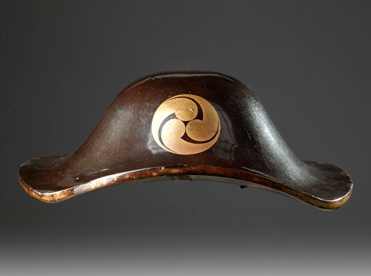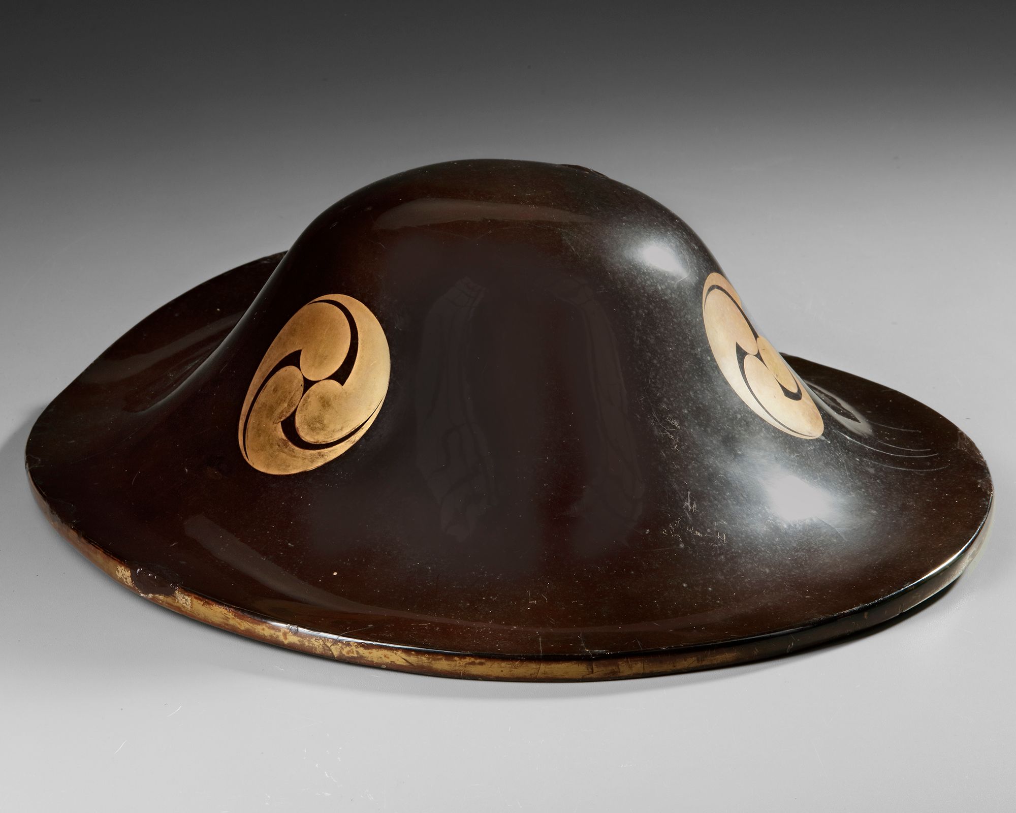 A remarkable Edo-period samurai jingasa (traveling hat), crafted in lacquered wood and adorned with three bold gold “Mitsudomoe mon” family crests—a symbol of strength and protection. The underside features faded gold leaf, showcasing its once-opulent finish, now worn beautifully with age. Signs of old repairs and surface wear.