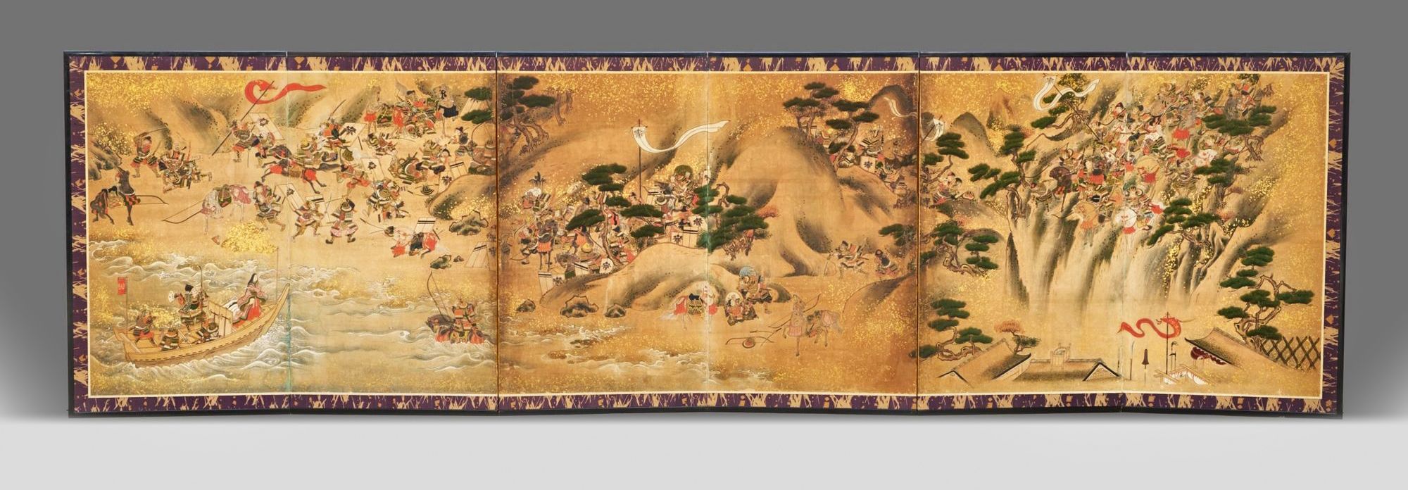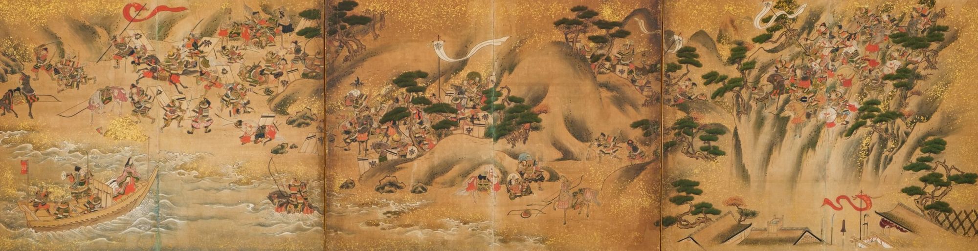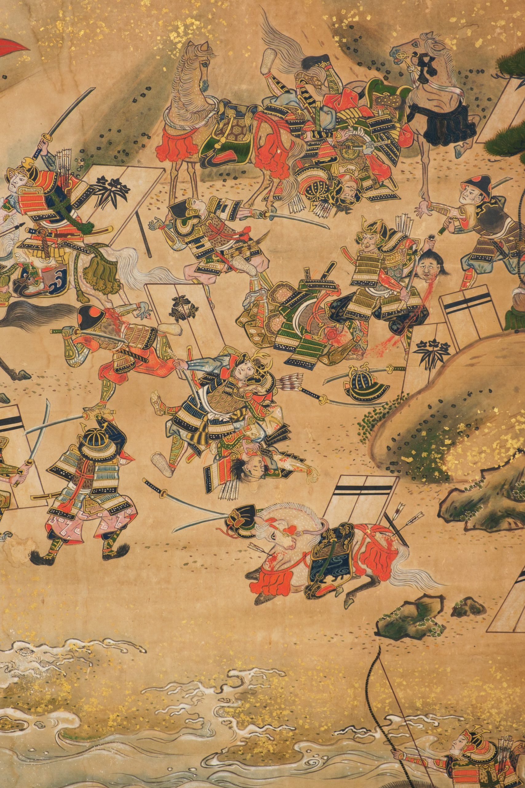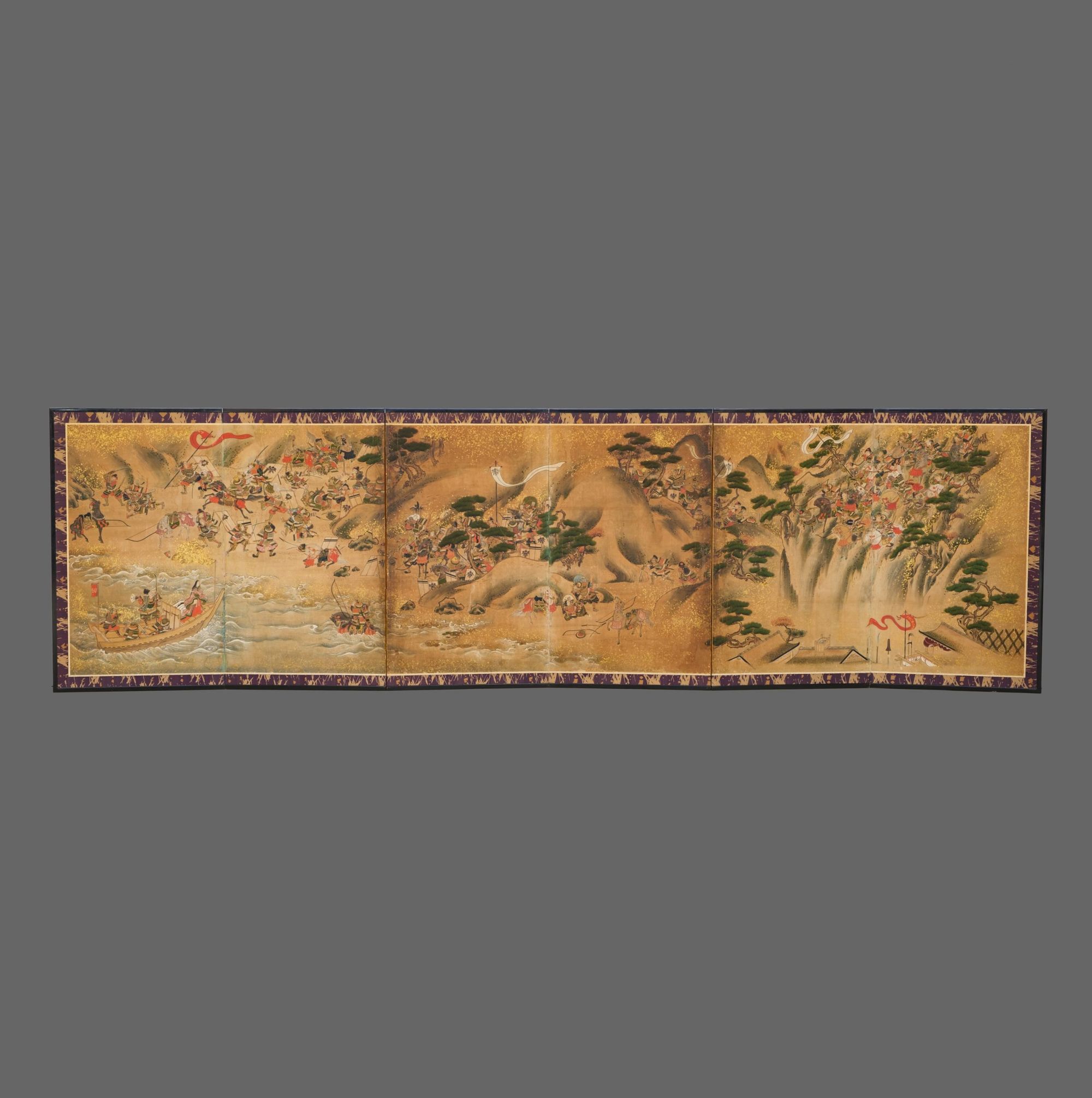 An exceptional medium-sized six-panel byôbu 屏風 (folding screen) featuring a refined painting depicting a dramatic battle during the epochal Genpei War (1180–85), as narrated in the Tales of the Heike, an epic semi-historical account of the rivalry between the Heike (Taira) and Genji (Minamoto) clans for control of Japan, written in the early 1200s.