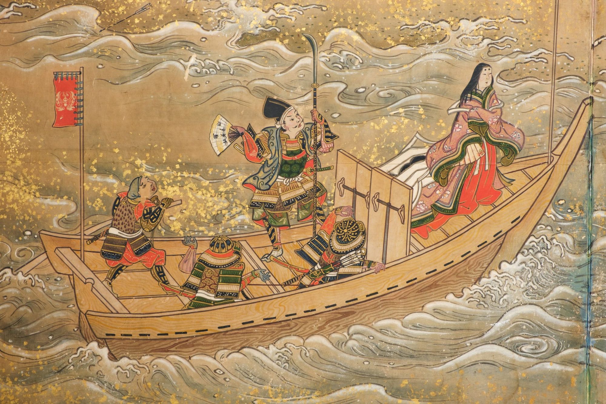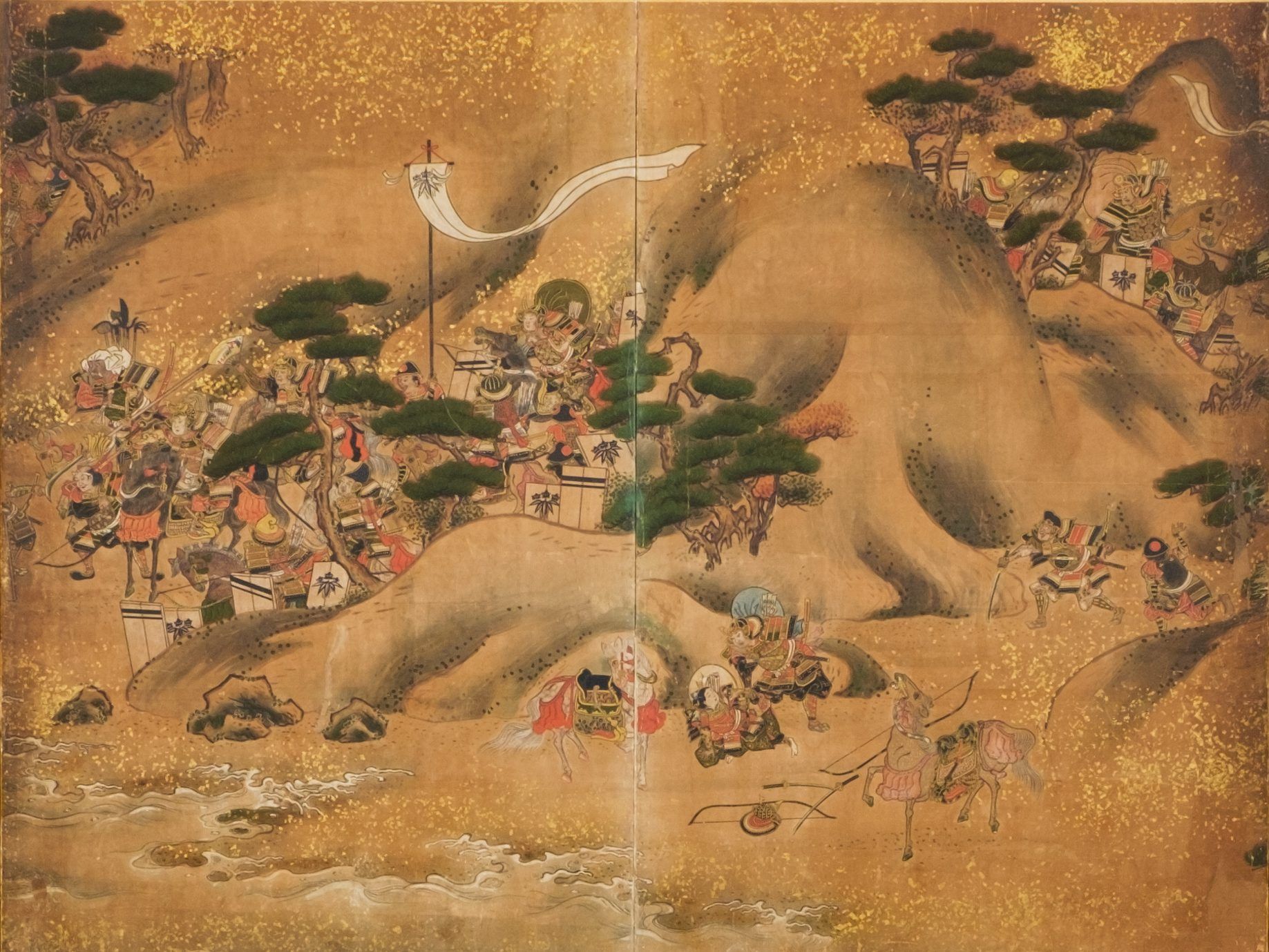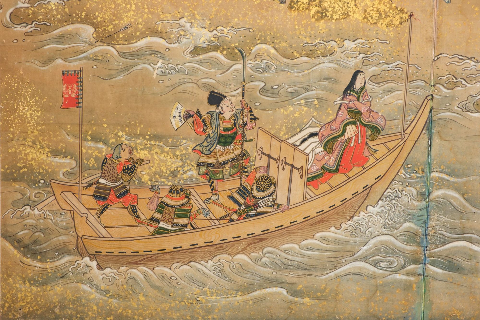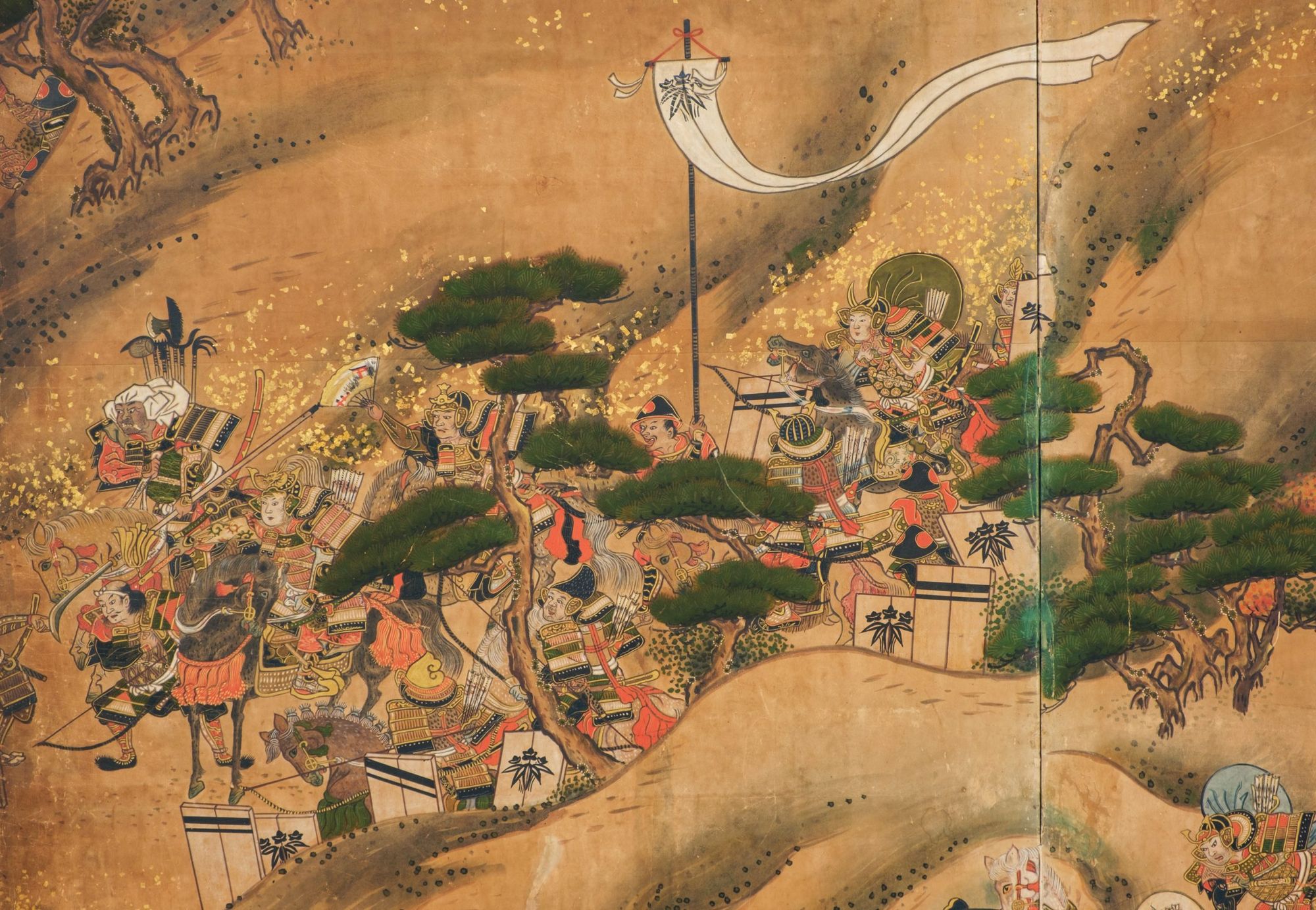 An exceptional medium-sized six-panel byôbu 屏風 (folding screen) featuring a refined painting depicting a dramatic battle during the epochal Genpei War (1180–85), as narrated in the Tales of the Heike, an epic semi-historical account of the rivalry between the Heike (Taira) and Genji (Minamoto) clans for control of Japan, written in the early 1200s.