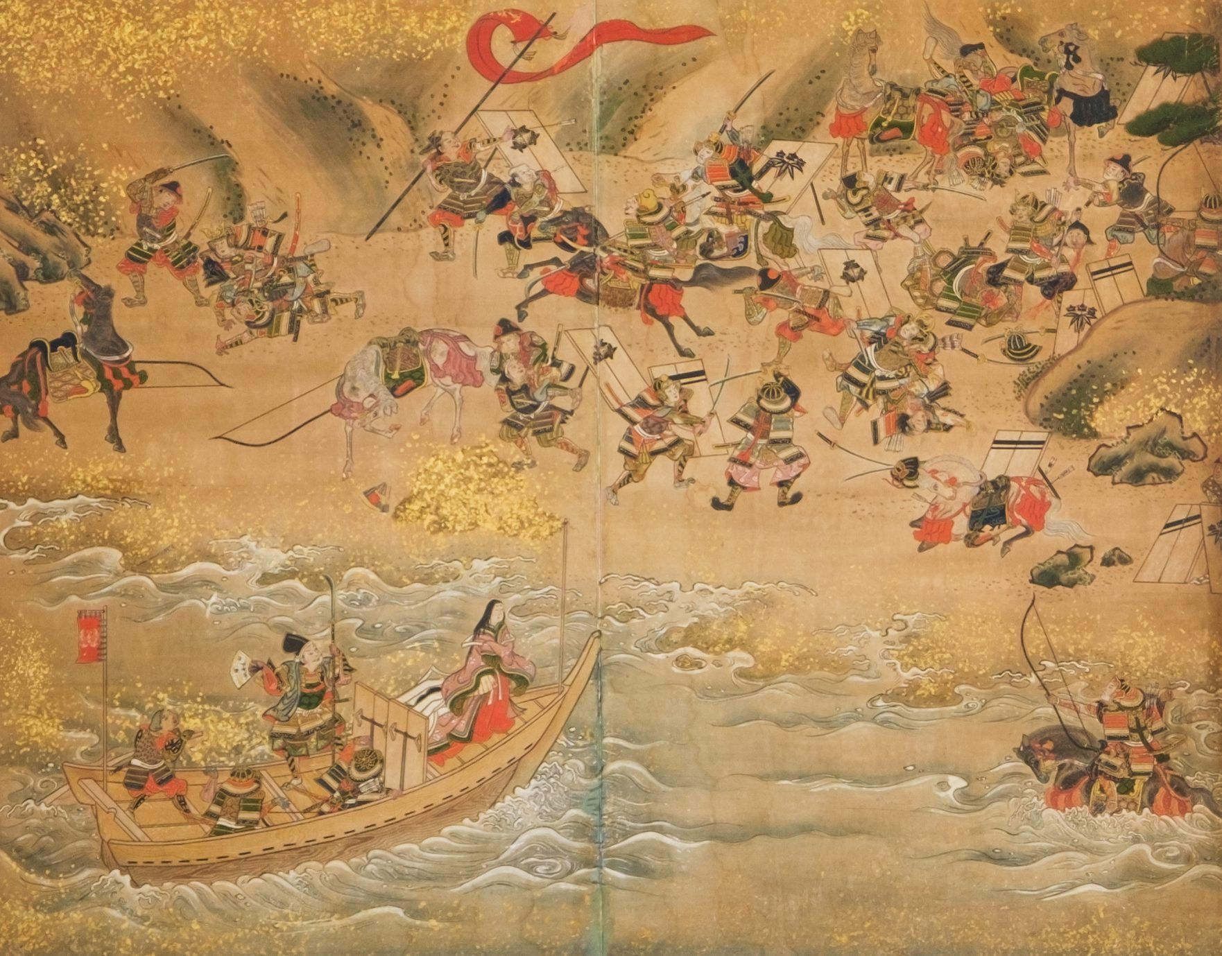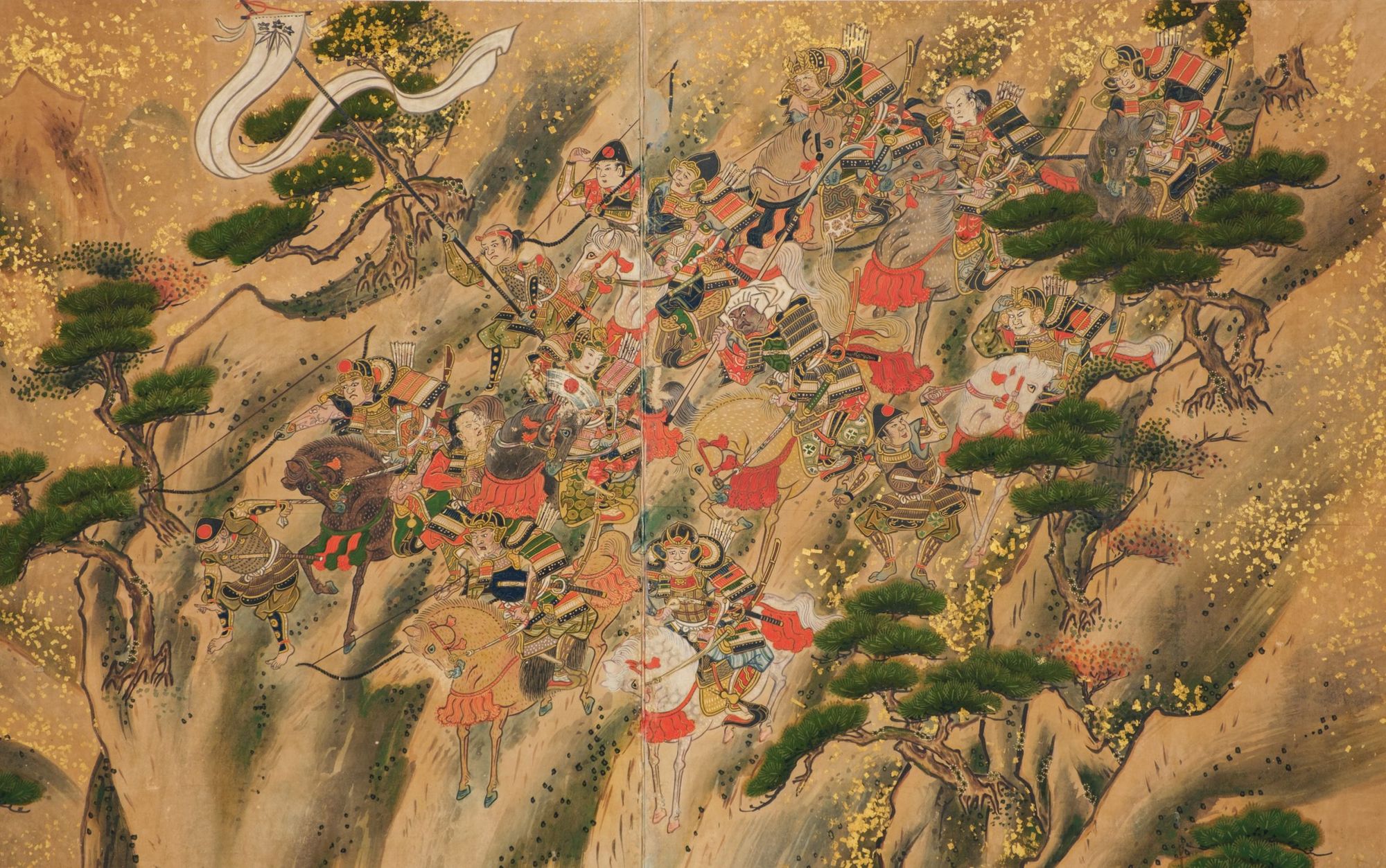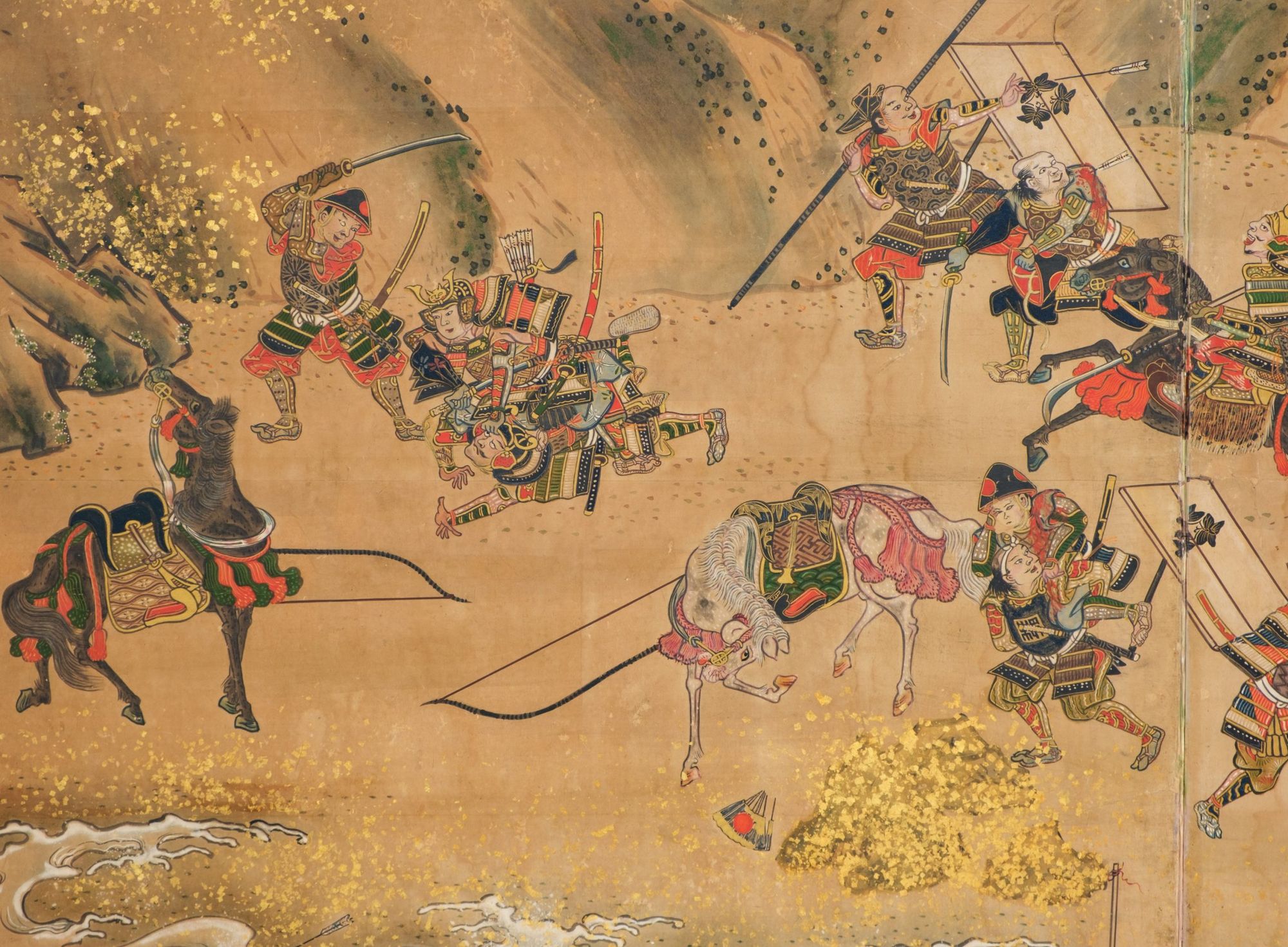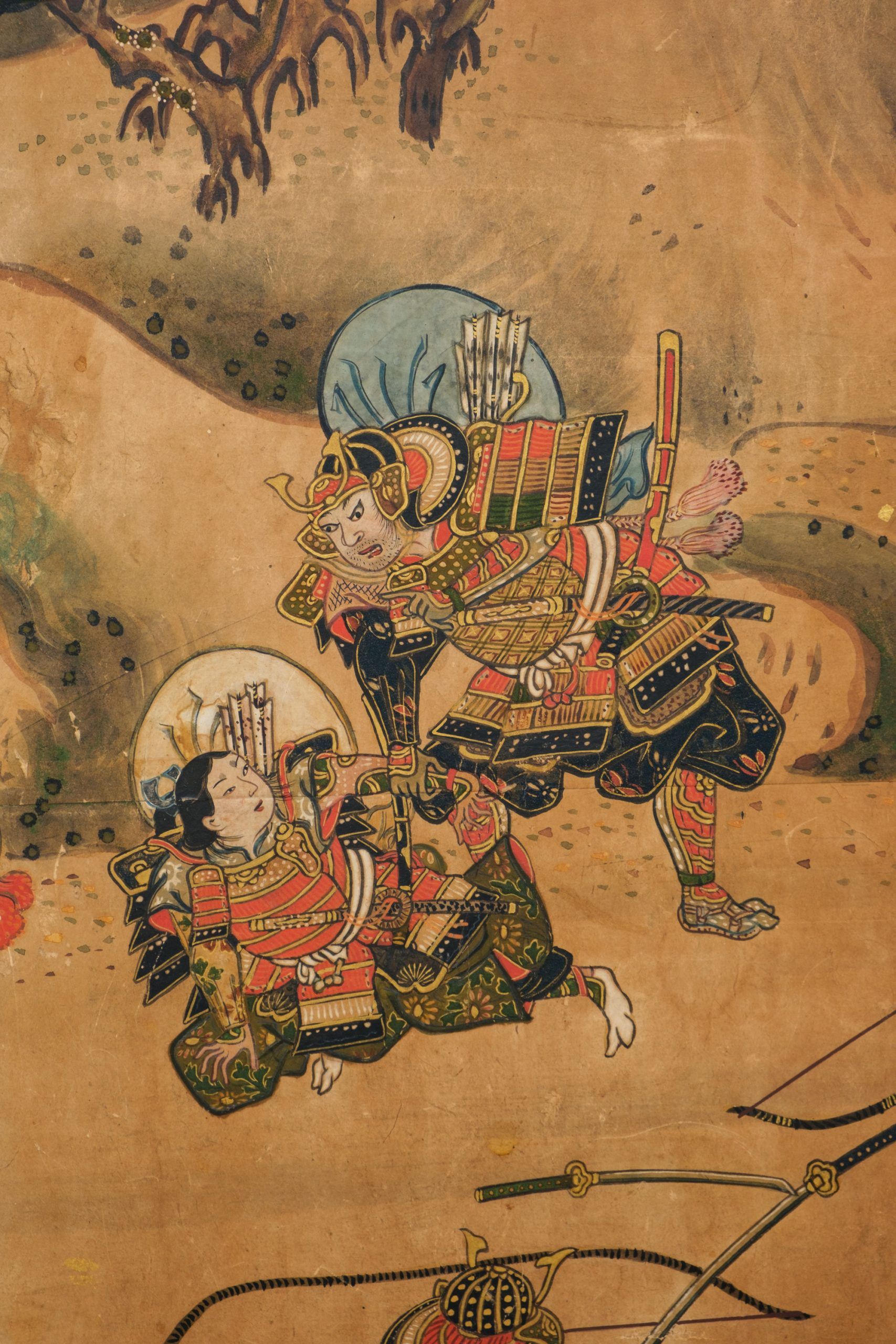 An exceptional medium-sized six-panel byôbu 屏風 (folding screen) featuring a refined painting depicting a dramatic battle during the epochal Genpei War (1180–85), as narrated in the Tales of the Heike, an epic semi-historical account of the rivalry between the Heike (Taira) and Genji (Minamoto) clans for control of Japan, written in the early 1200s.