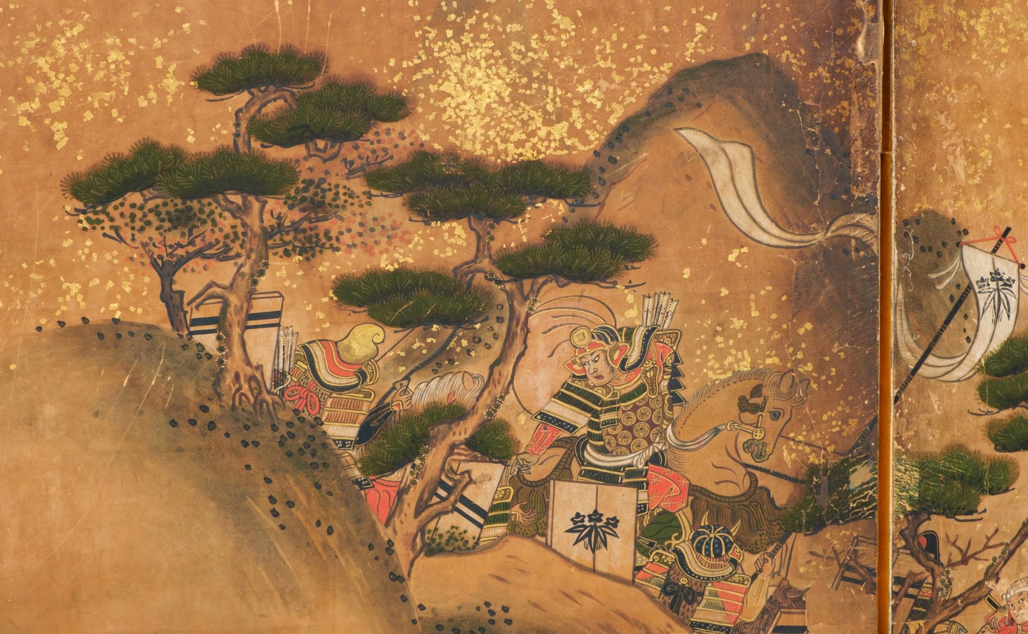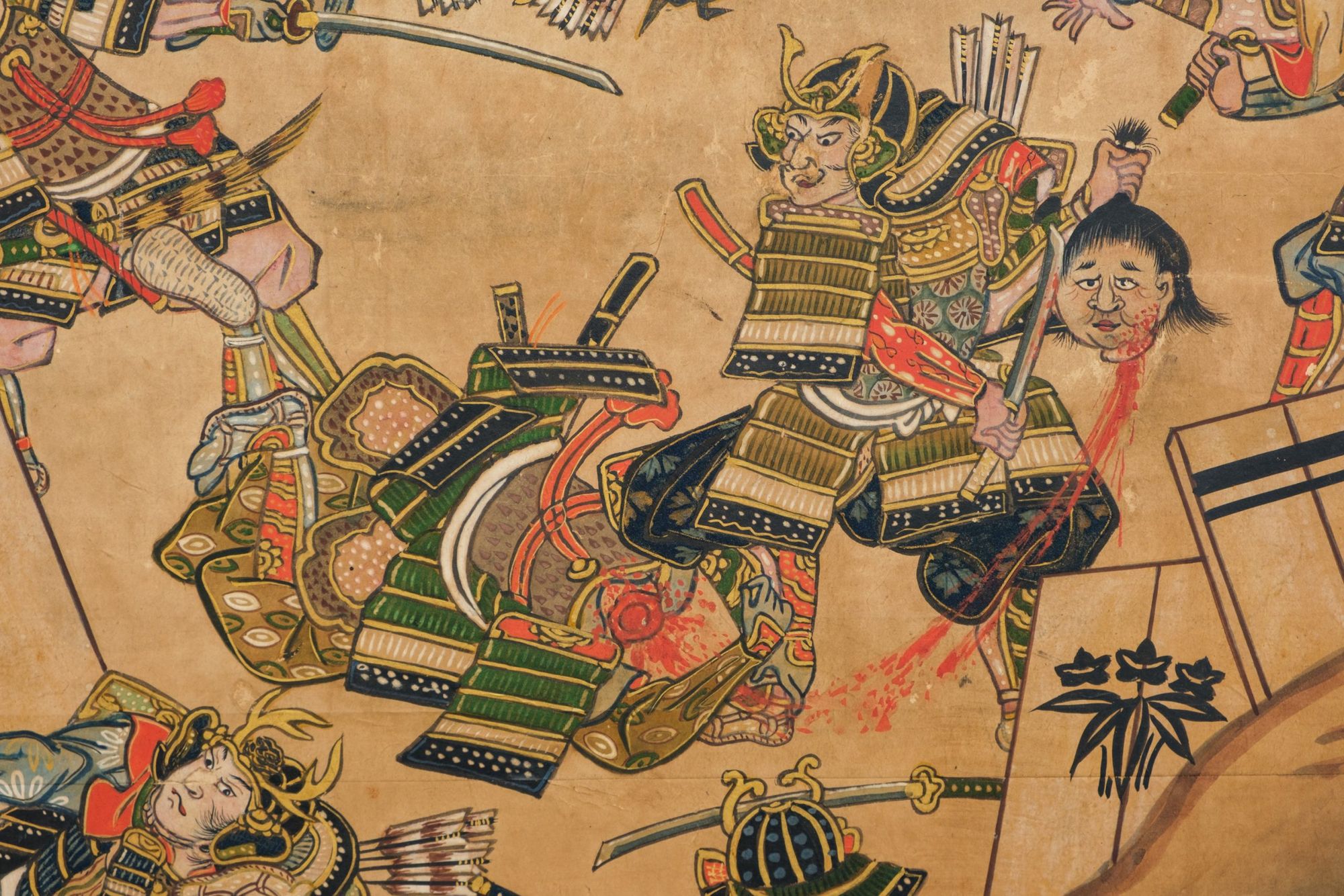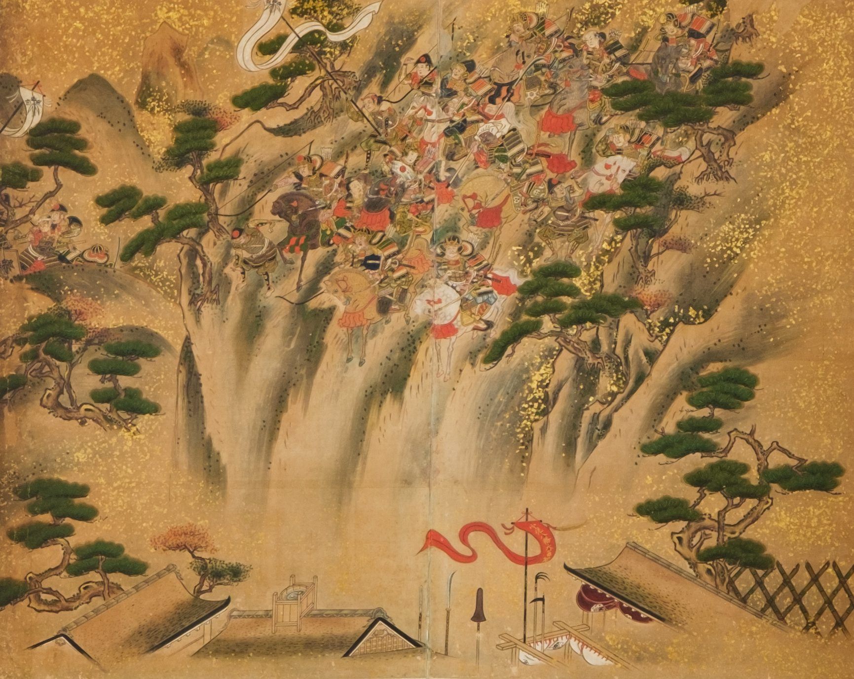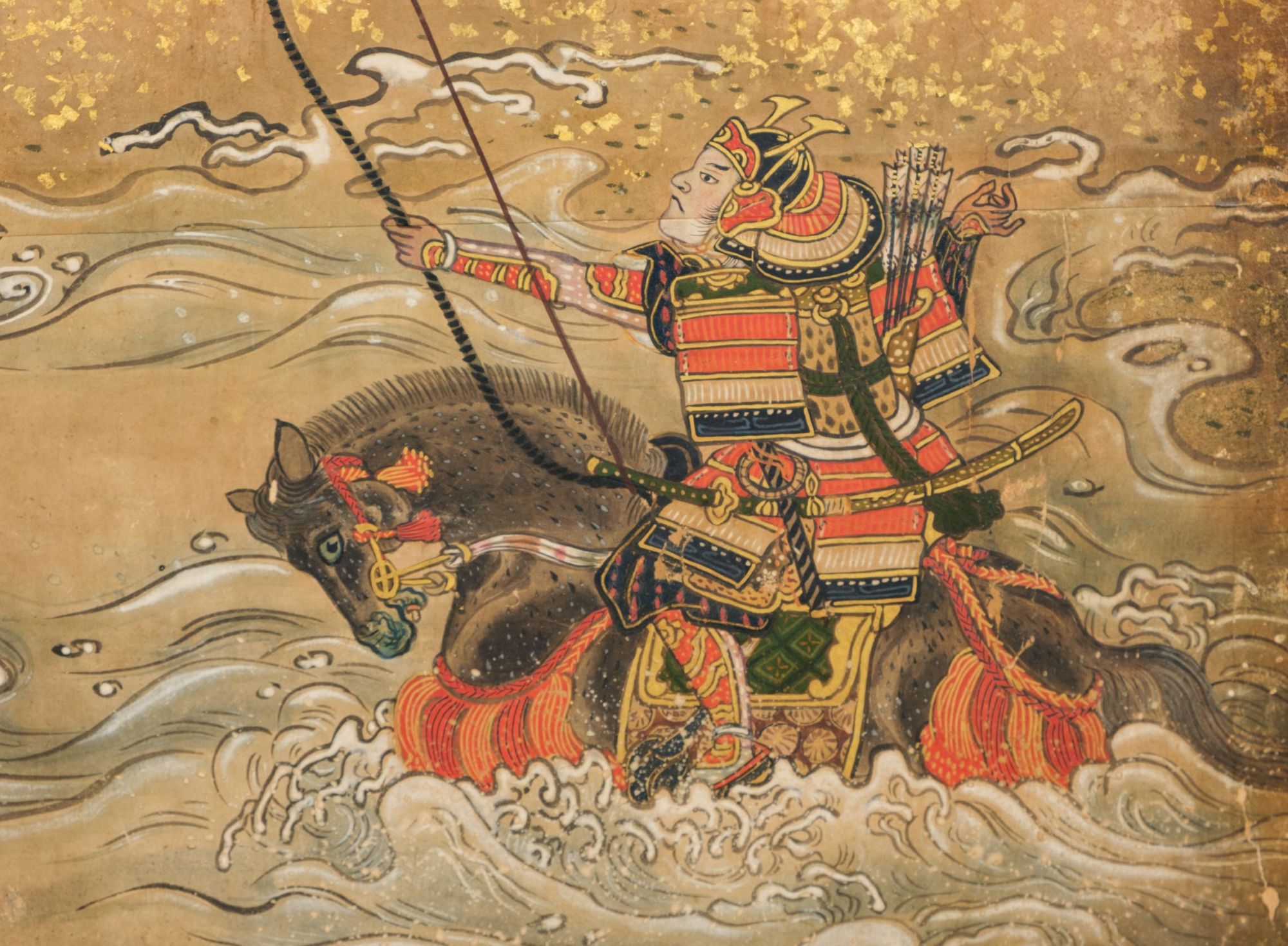 An exceptional medium-sized six-panel byôbu 屏風 (folding screen) featuring a refined painting depicting a dramatic battle during the epochal Genpei War (1180–85), as narrated in the Tales of the Heike, an epic semi-historical account of the rivalry between the Heike (Taira) and Genji (Minamoto) clans for control of Japan, written in the early 1200s.