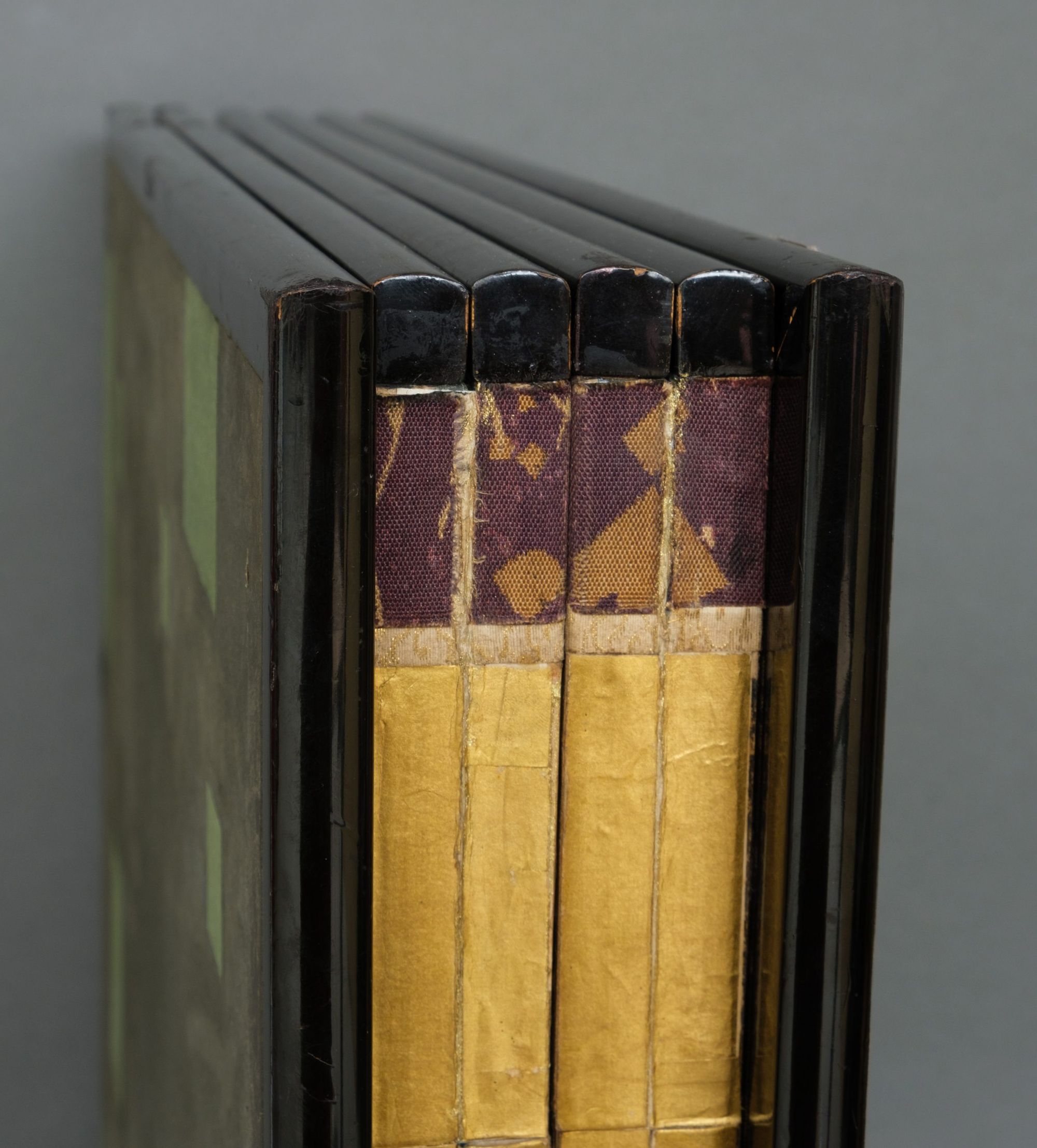 This multi-coloured painting is set on a paper background with speckled gold leaf highlights. Surrounded by two silk borders, a thin ecru one, and a wide purple one. Protected by a black lacquered frame.