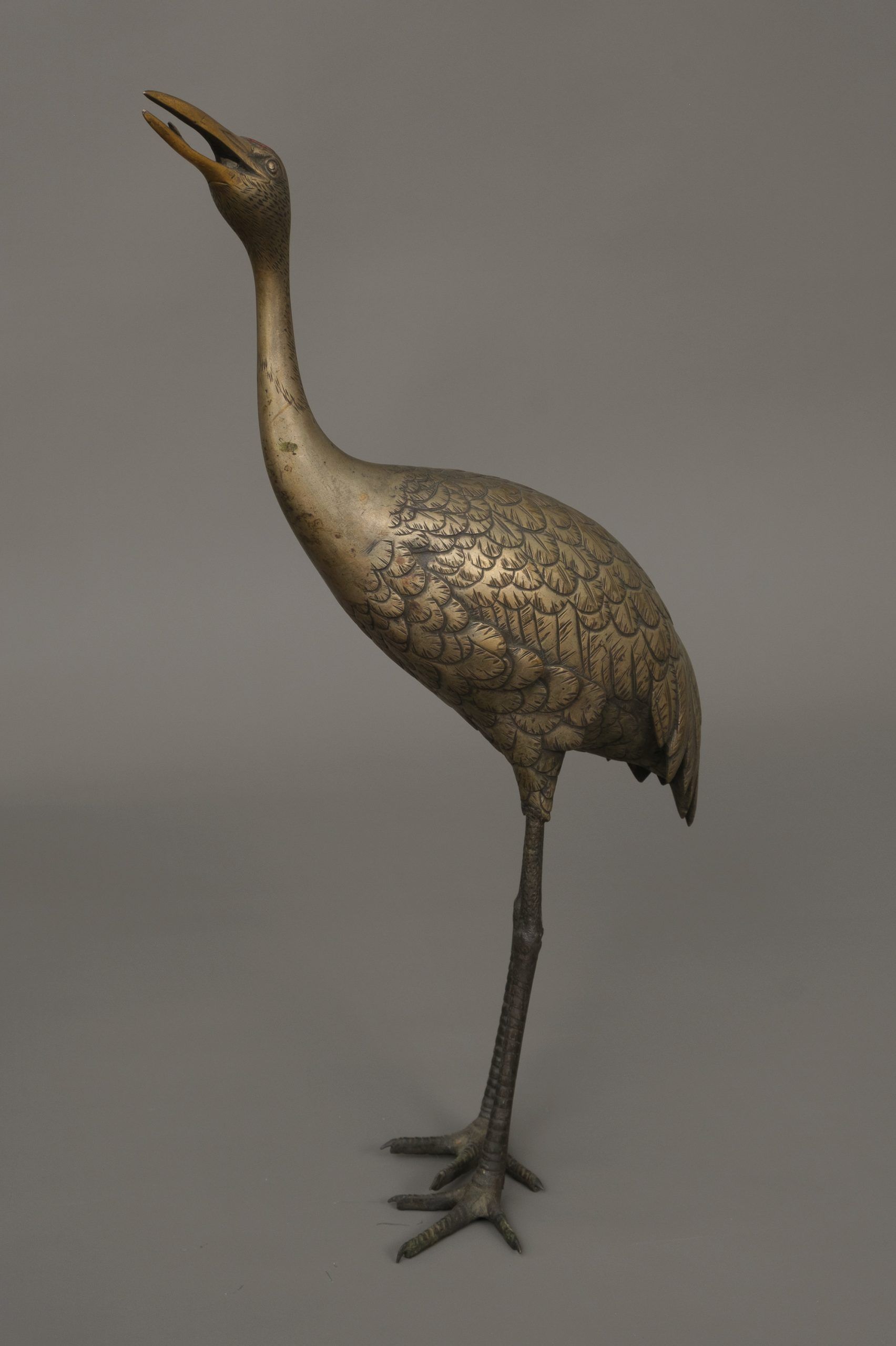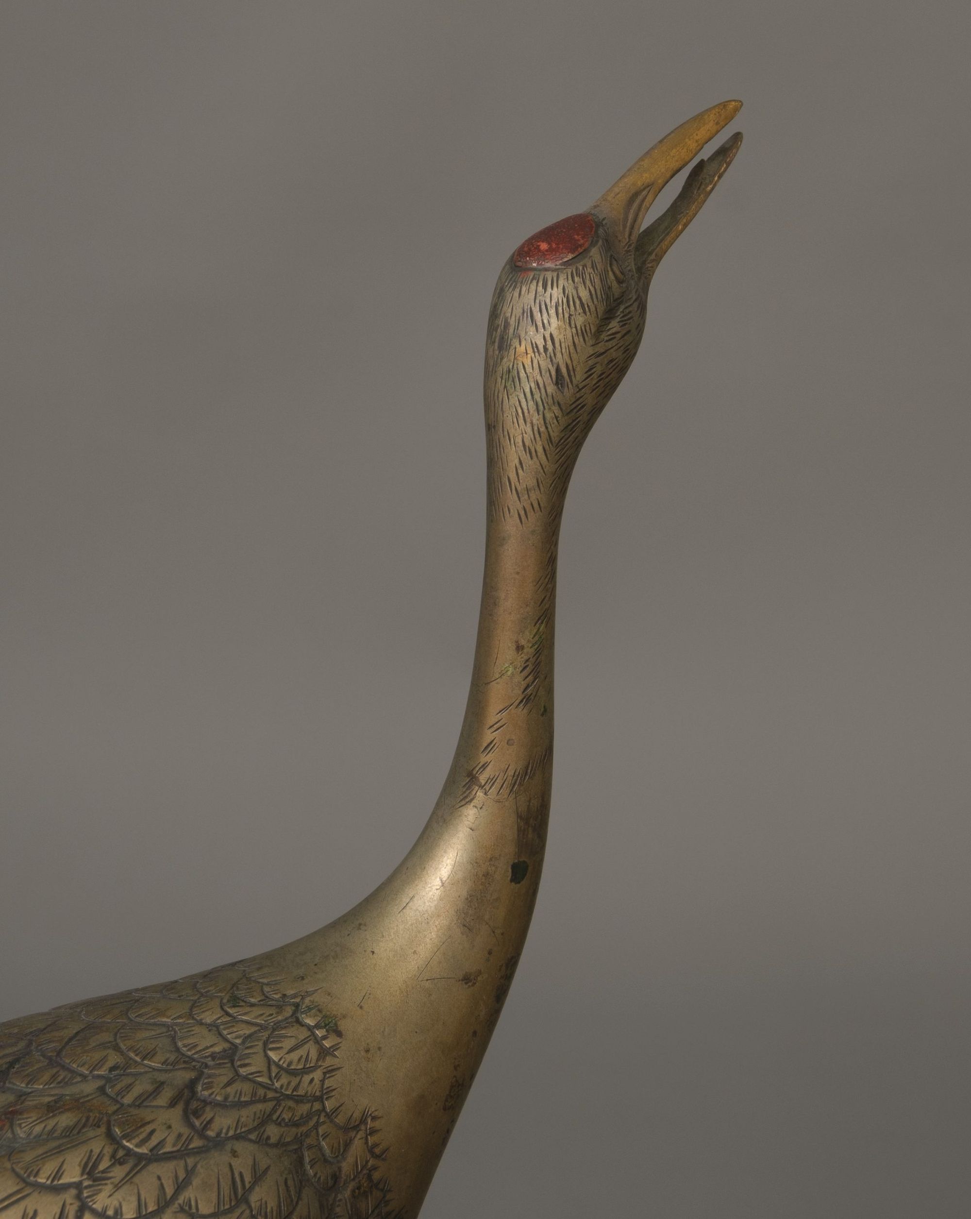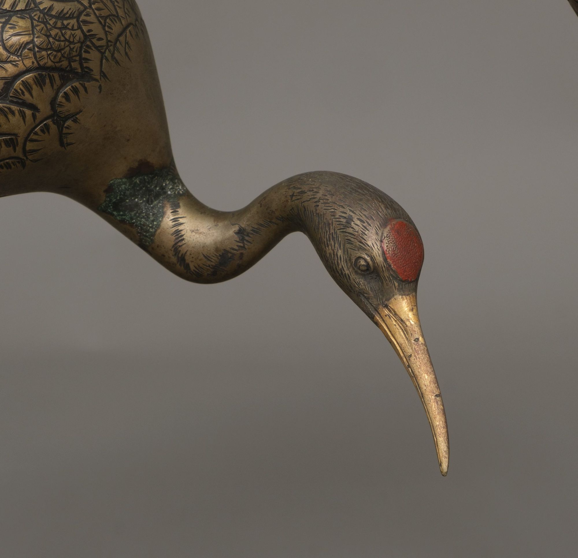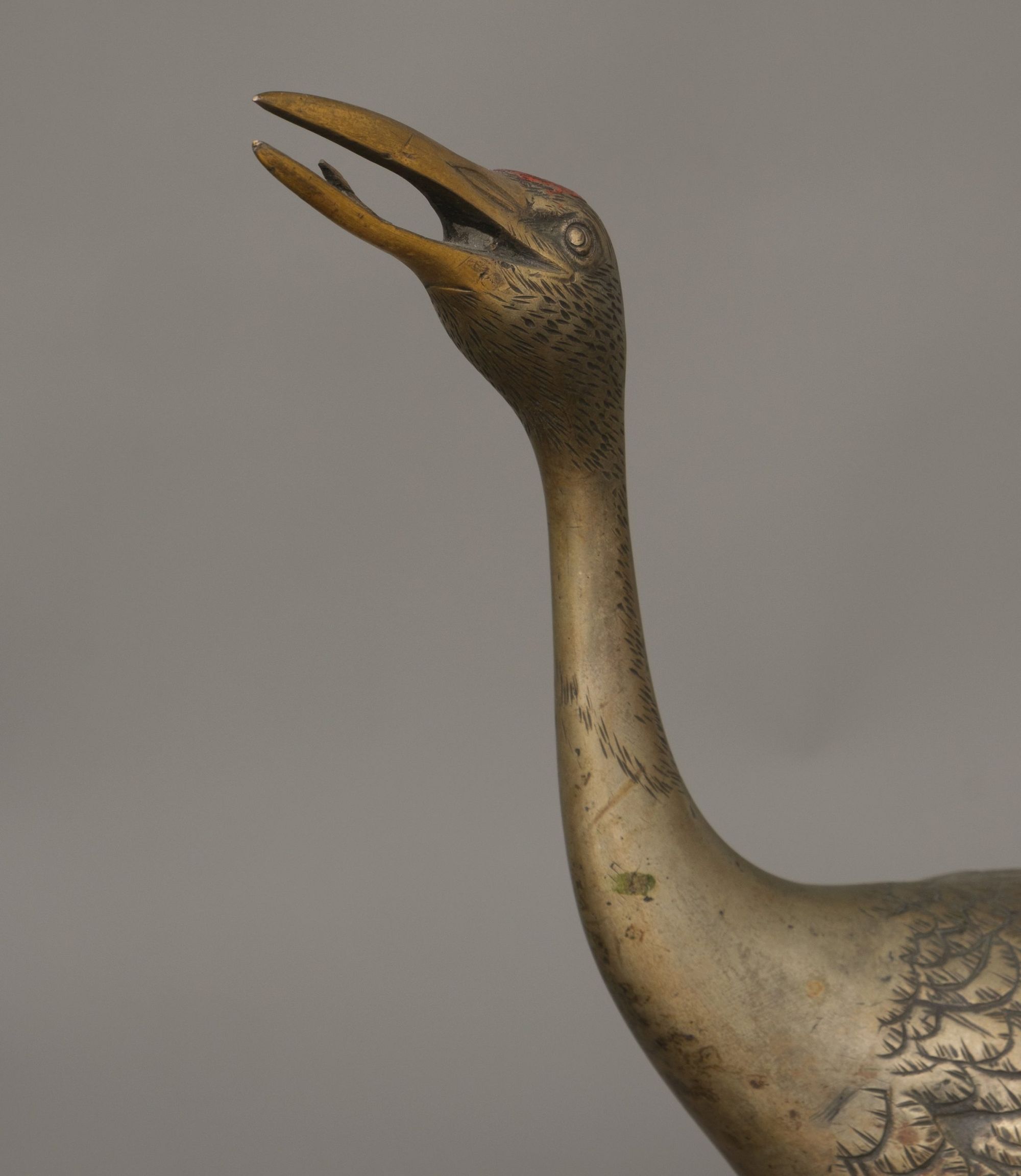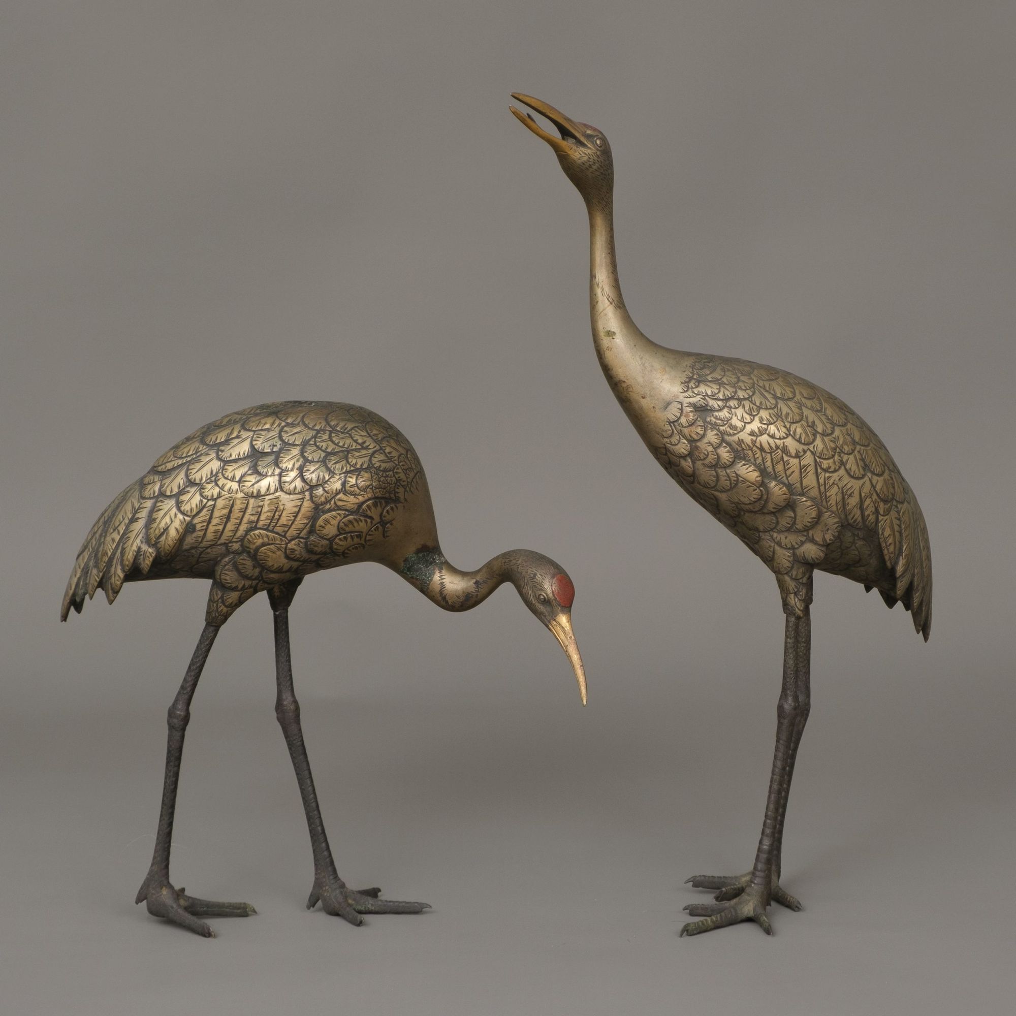 A nice pair of bronze okimono 置物 shaped like a pair of cranes 鶴 (tsuru). One of these ‘Red-crowned Cranes’ 丹頂鶴 (tanchô’duru) with its head held high, and beak partially open, while the other adopts a lower stance, curving its head downward. A goldish silver tone with red and gold accents.