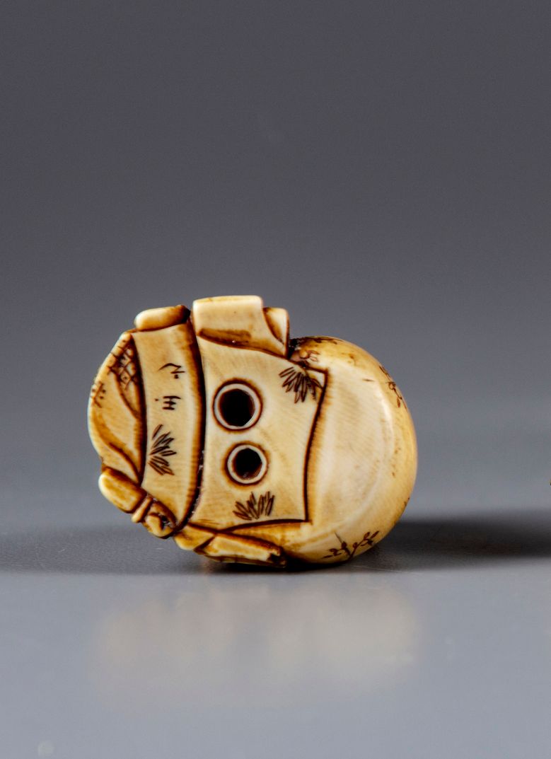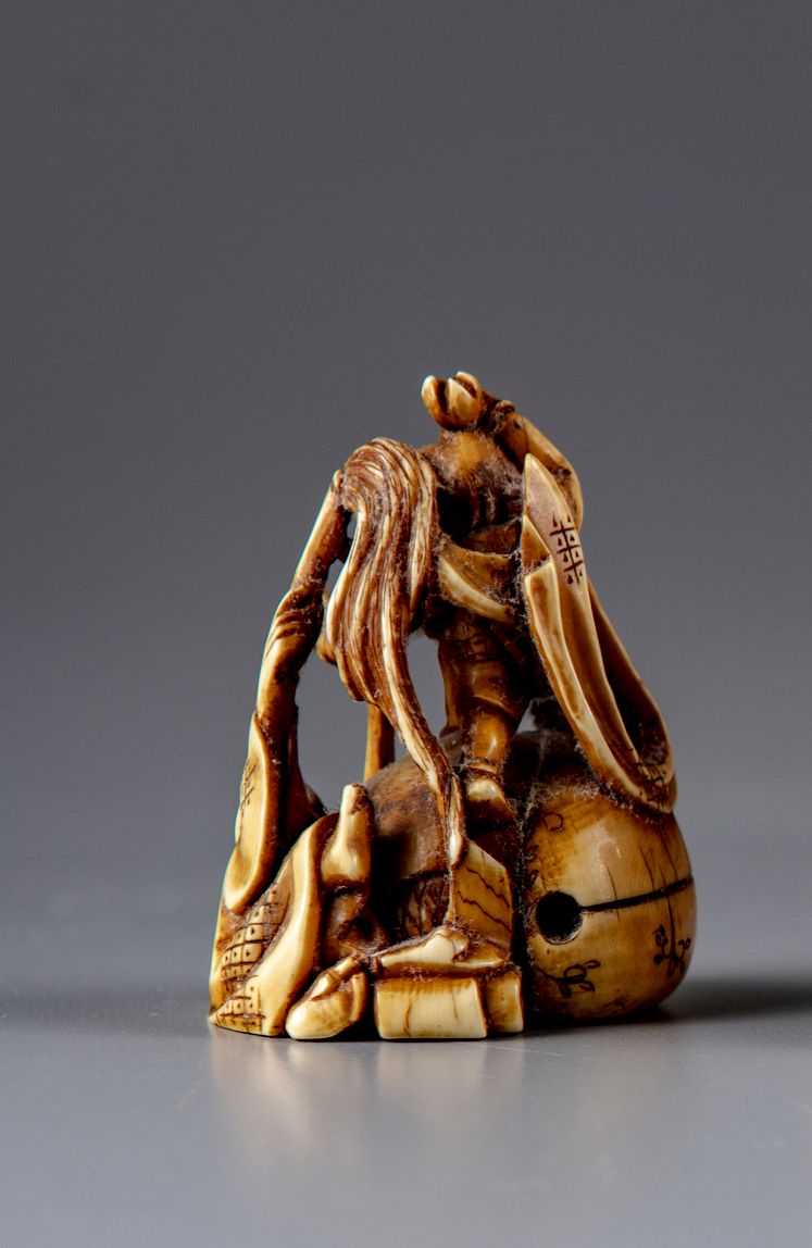 A demon standing on a large ball with a figure. H 5 cm.
