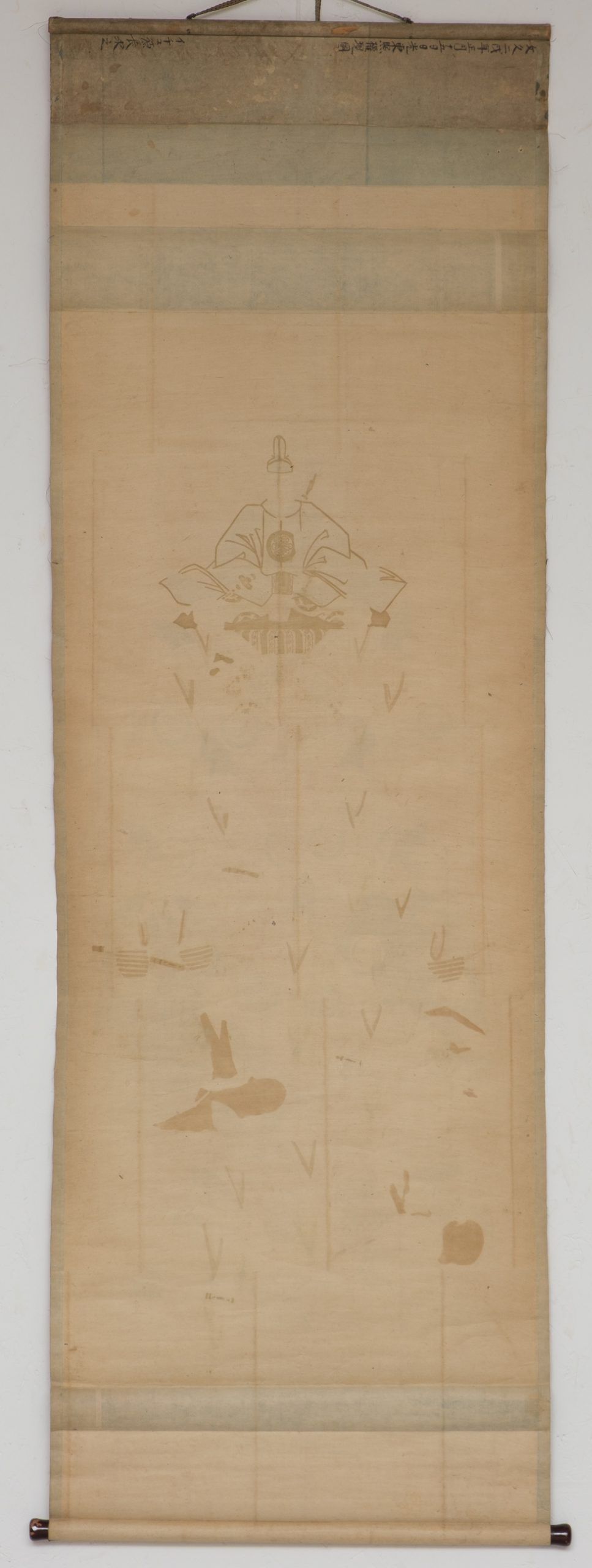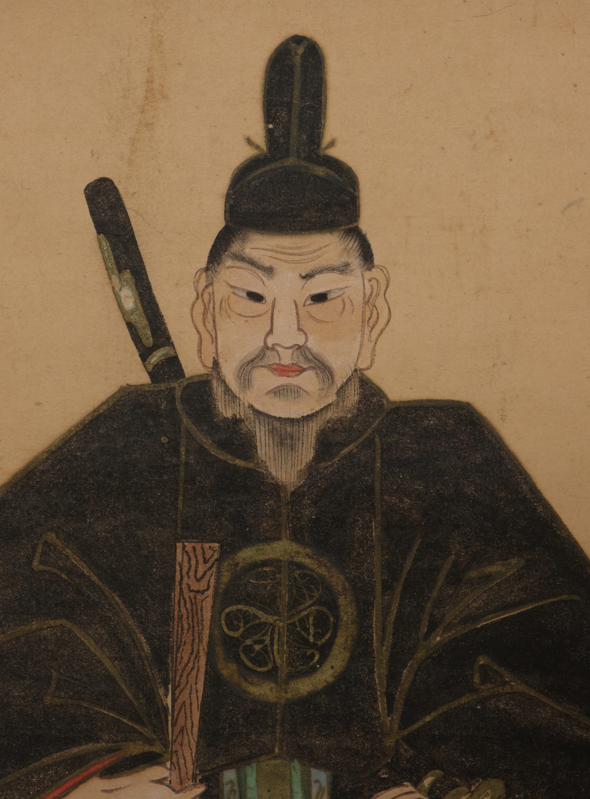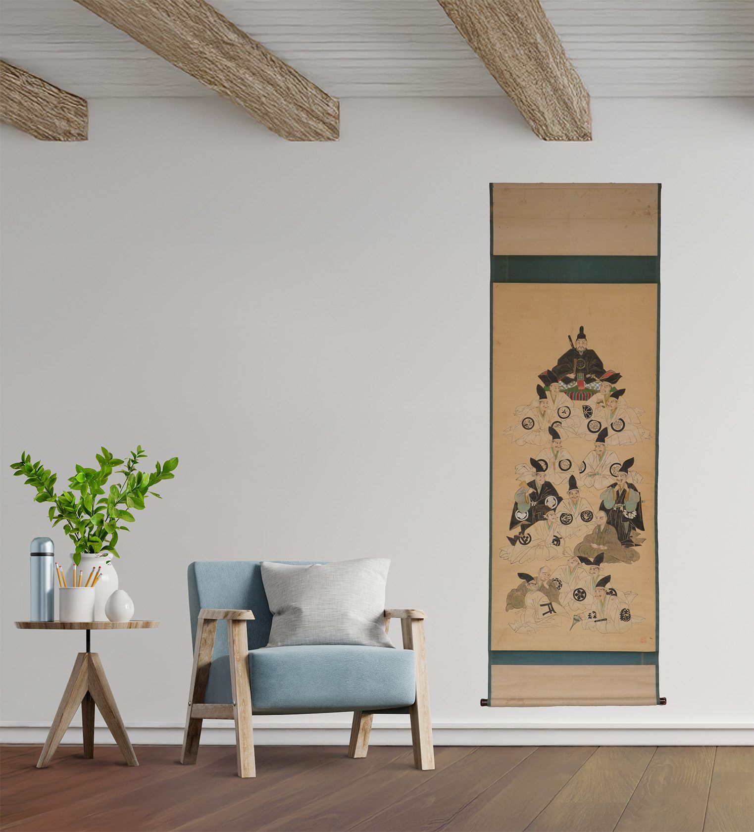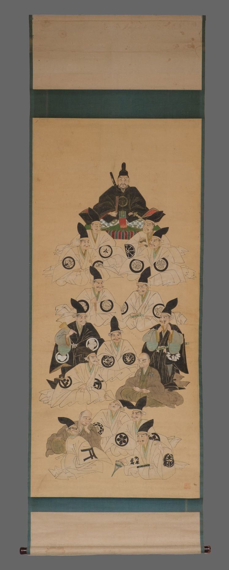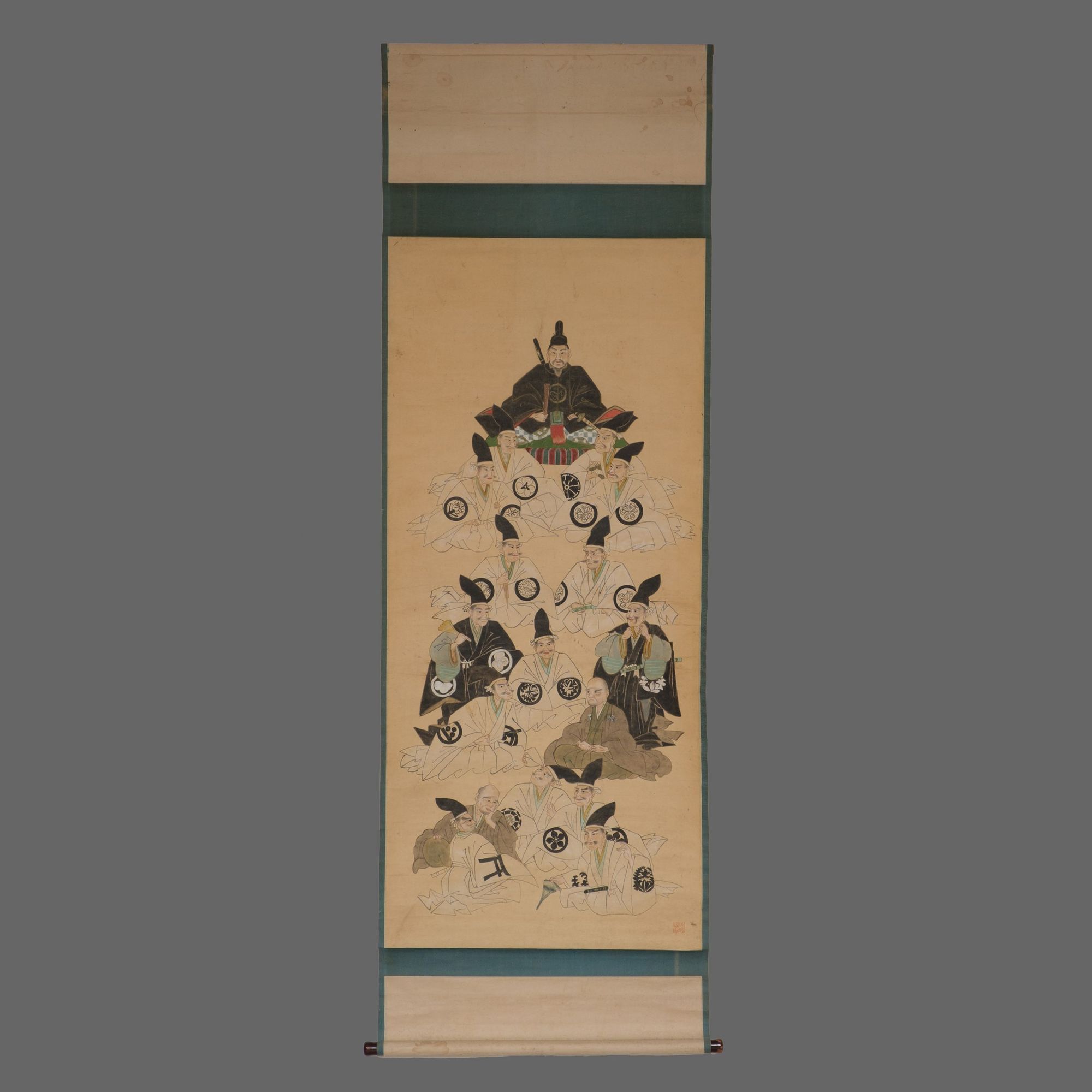 A kakejiku 掛け軸 (hanging scroll), featuring a historical painting of Tokugawa Ieyasu 徳川家康 (1543–1616) seated above his Sixteen Divine Generals 十六神将 (jûroku shinshô)—the loyal military commanders who supported him in life and, according to later Edo-period belief, continued to serve him after his deification as Tôshô Gongen 東照權現.