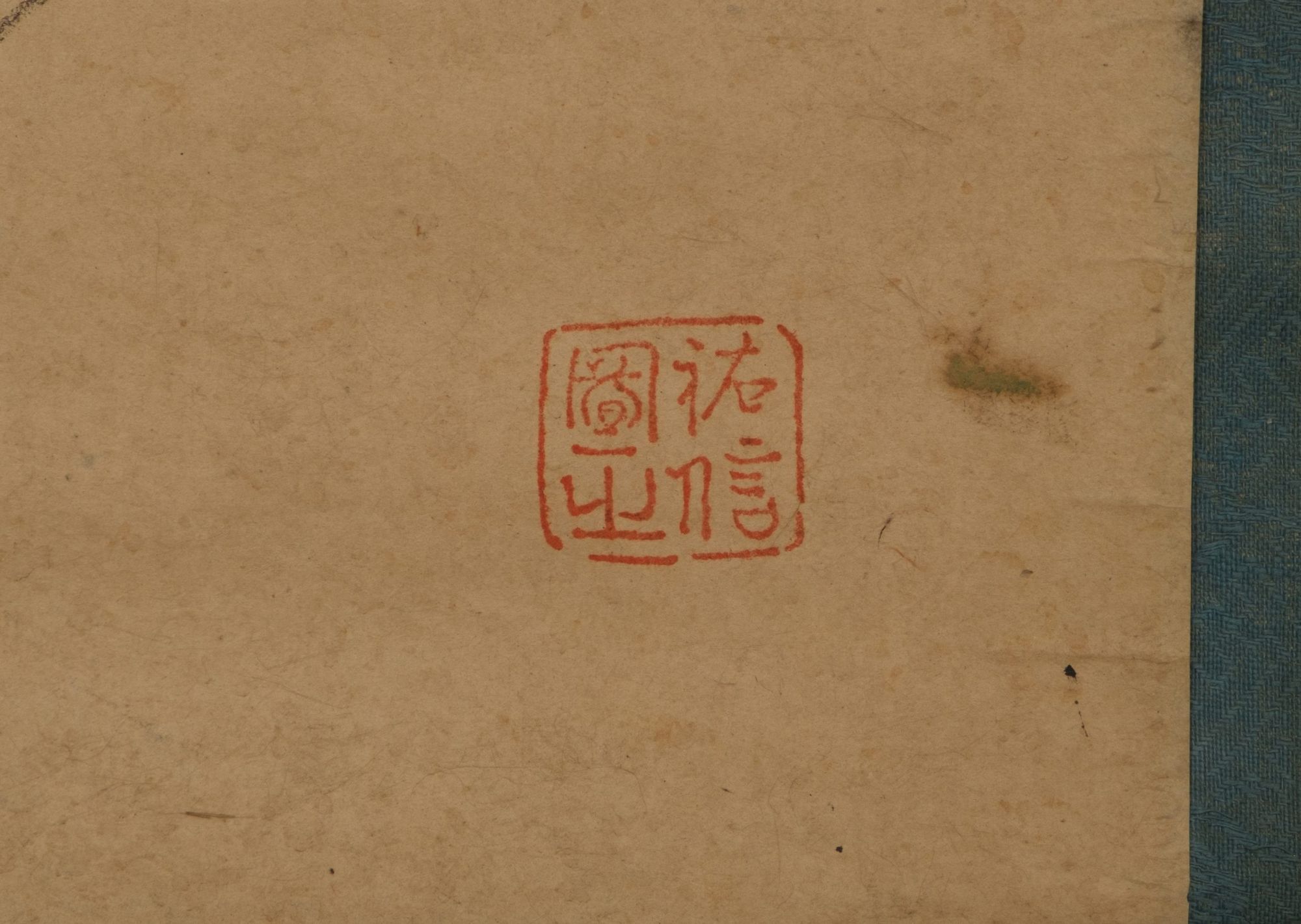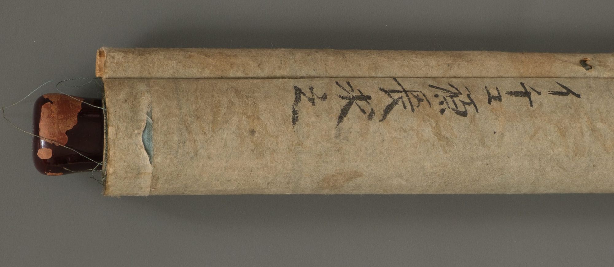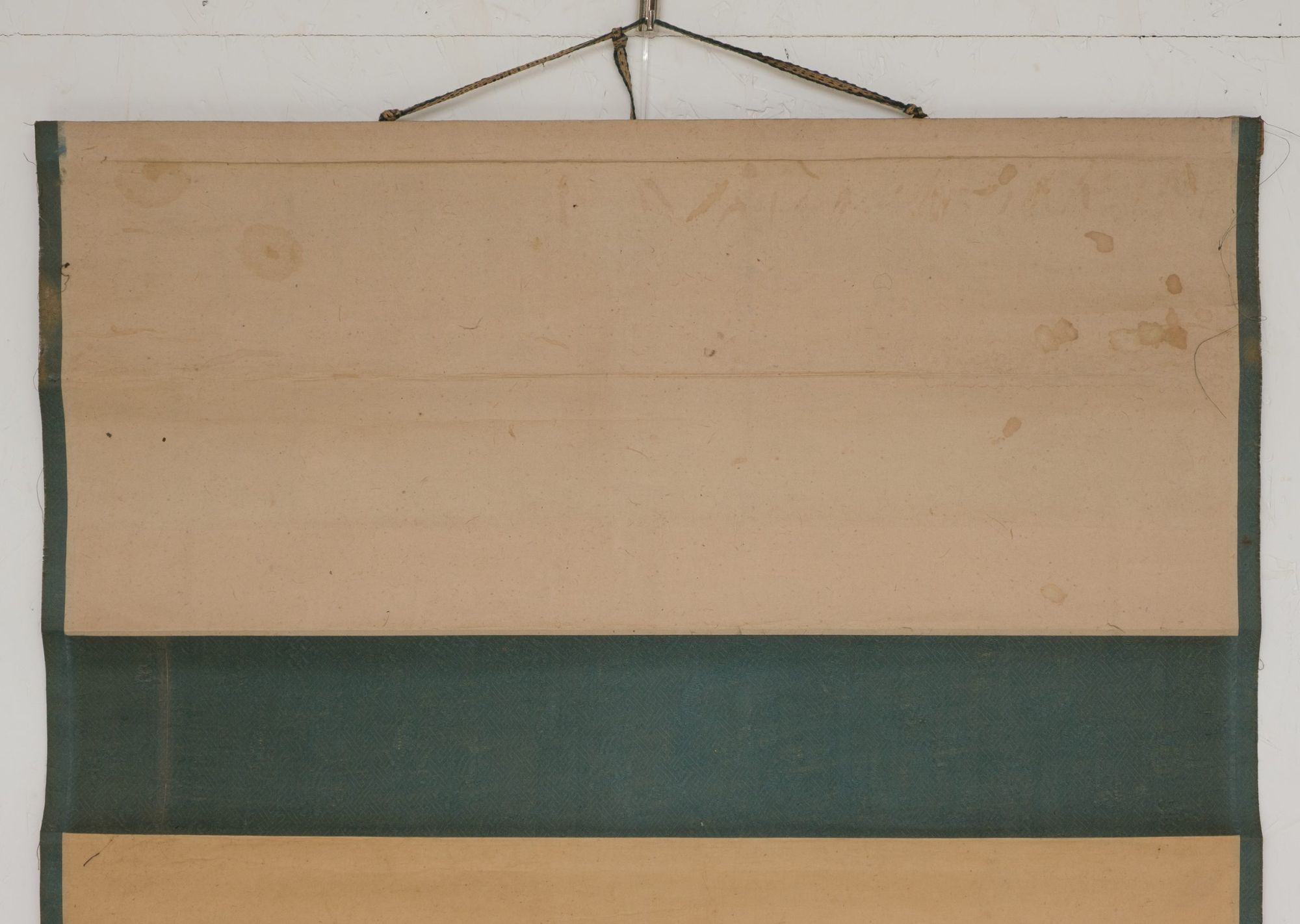 Mounting: Blue silk and paper borders, with jikusaki 軸先 (roller ends) made of red lacquered wood