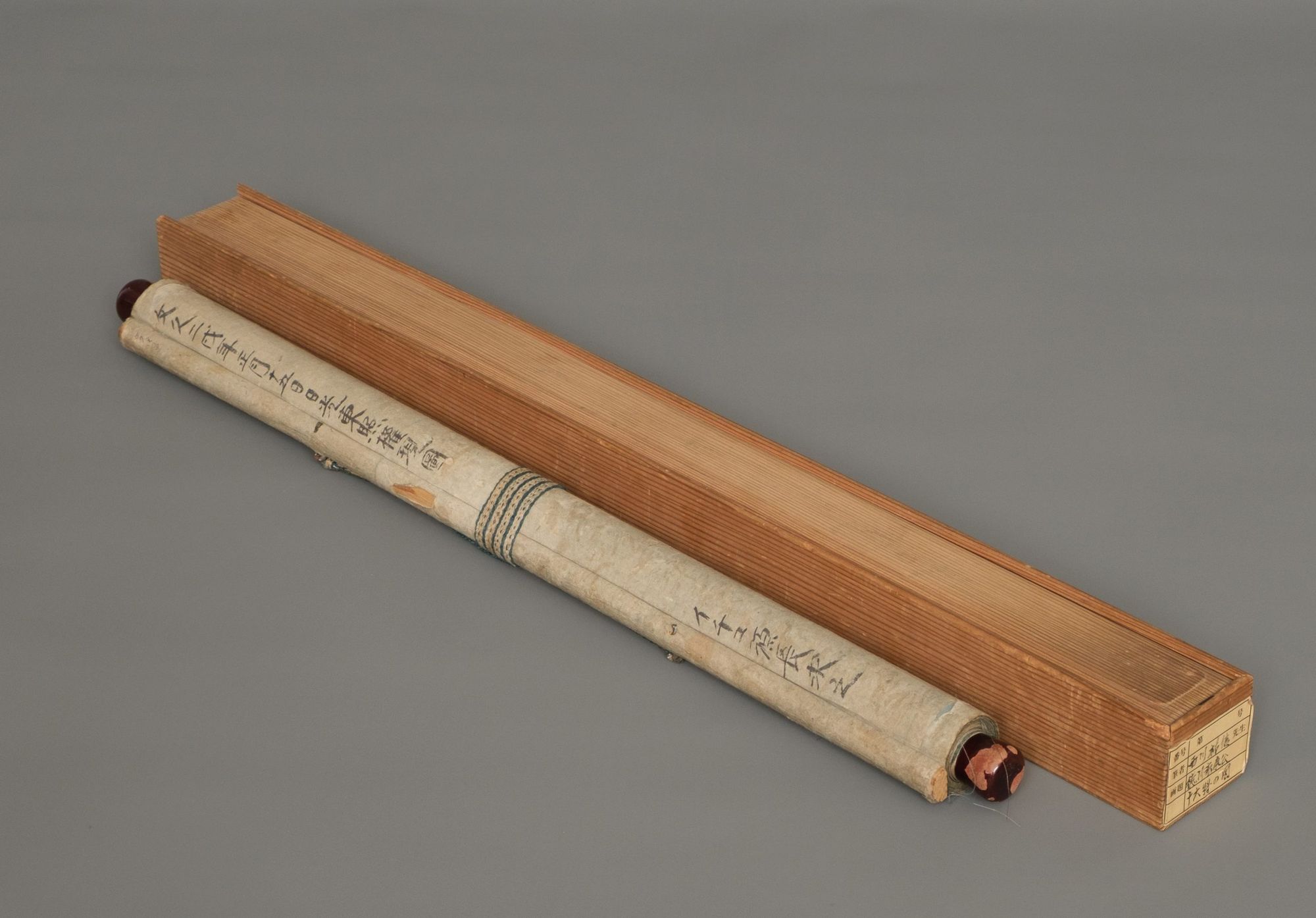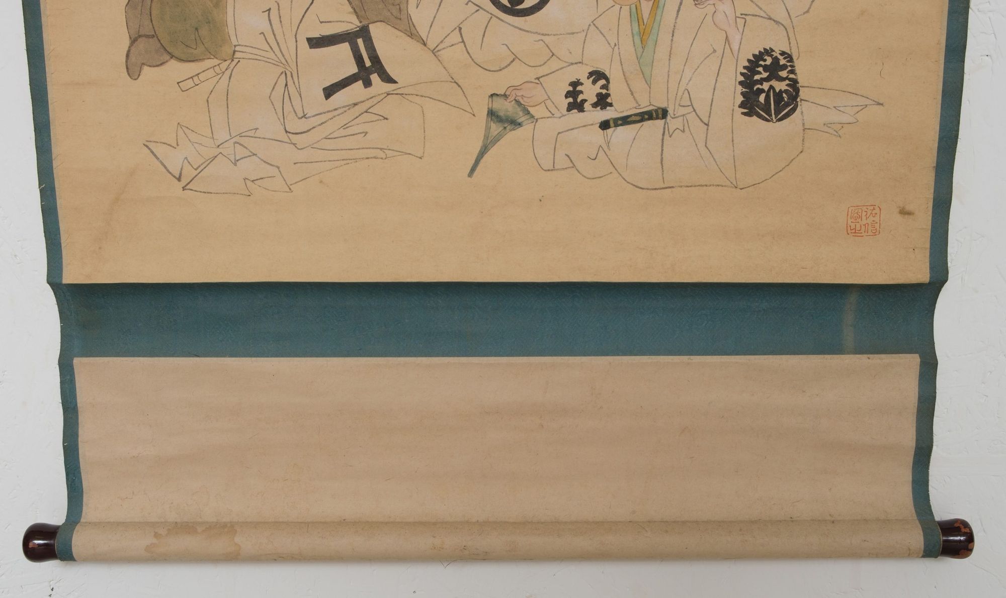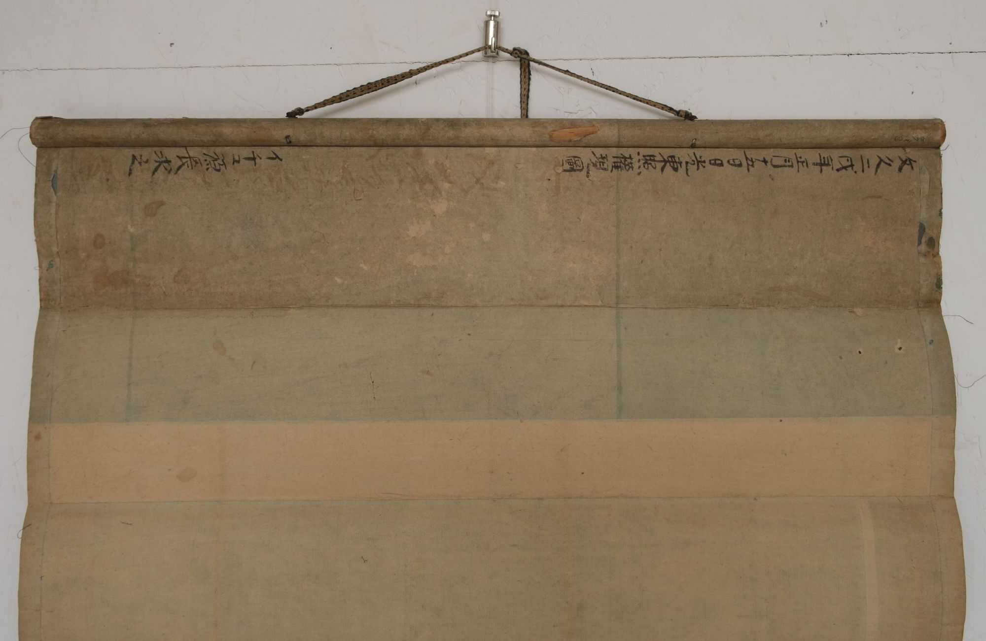 Mounting: Blue silk and paper borders, with jikusaki 軸先 (roller ends) made of red lacquered wood