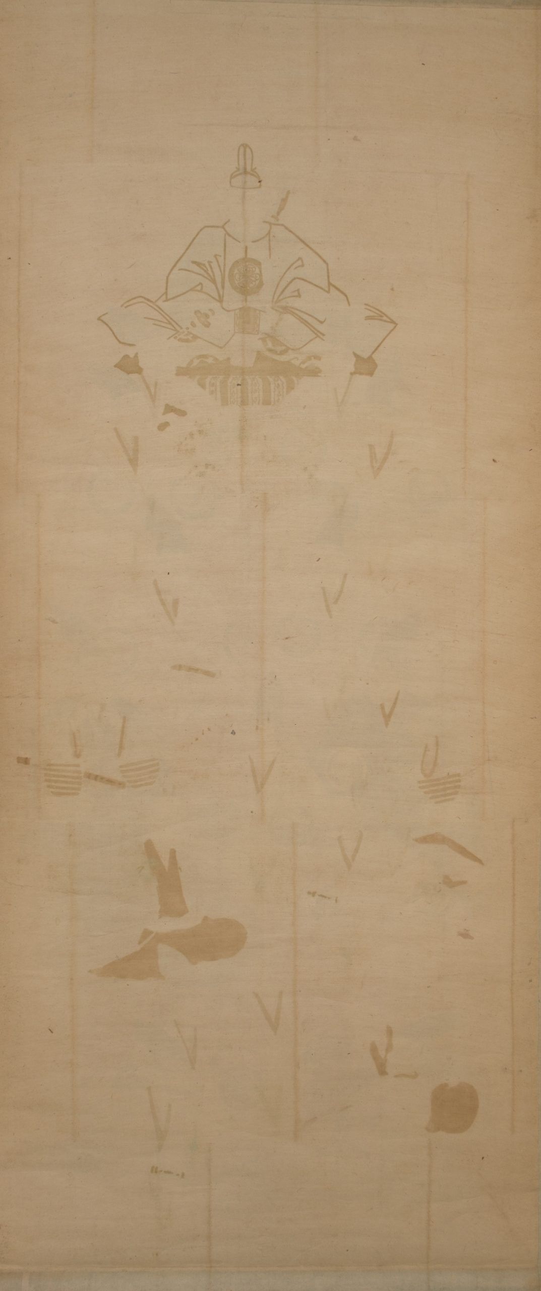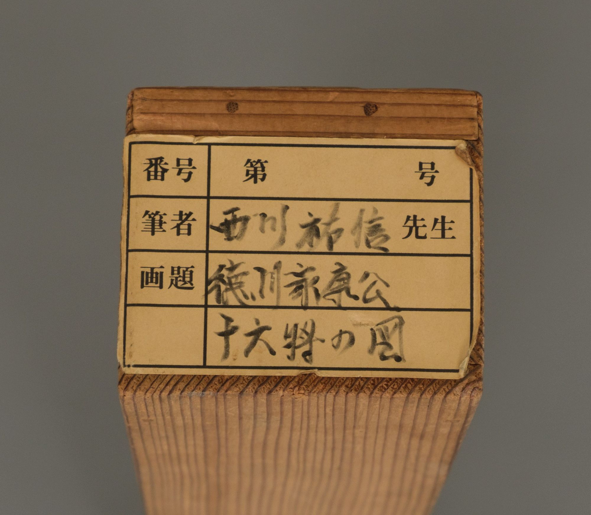 Each general is portrayed wearing formal samurai attire: hitatare 直垂 (ceremonial robes) and eboshi 烏帽子 (formal headgear). Although their names are not inscribed, their identities can be traced through the family crests mon 紋 depicted on their sleeves. The composition reflects the syncretic fusion of military, historical, and spiritual imagery, aligning Tokugawa Ieyasu with Buddhist cosmology by paralleling his retainers with the Twelve Heavenly Generals and the Four Heavenly Kings.