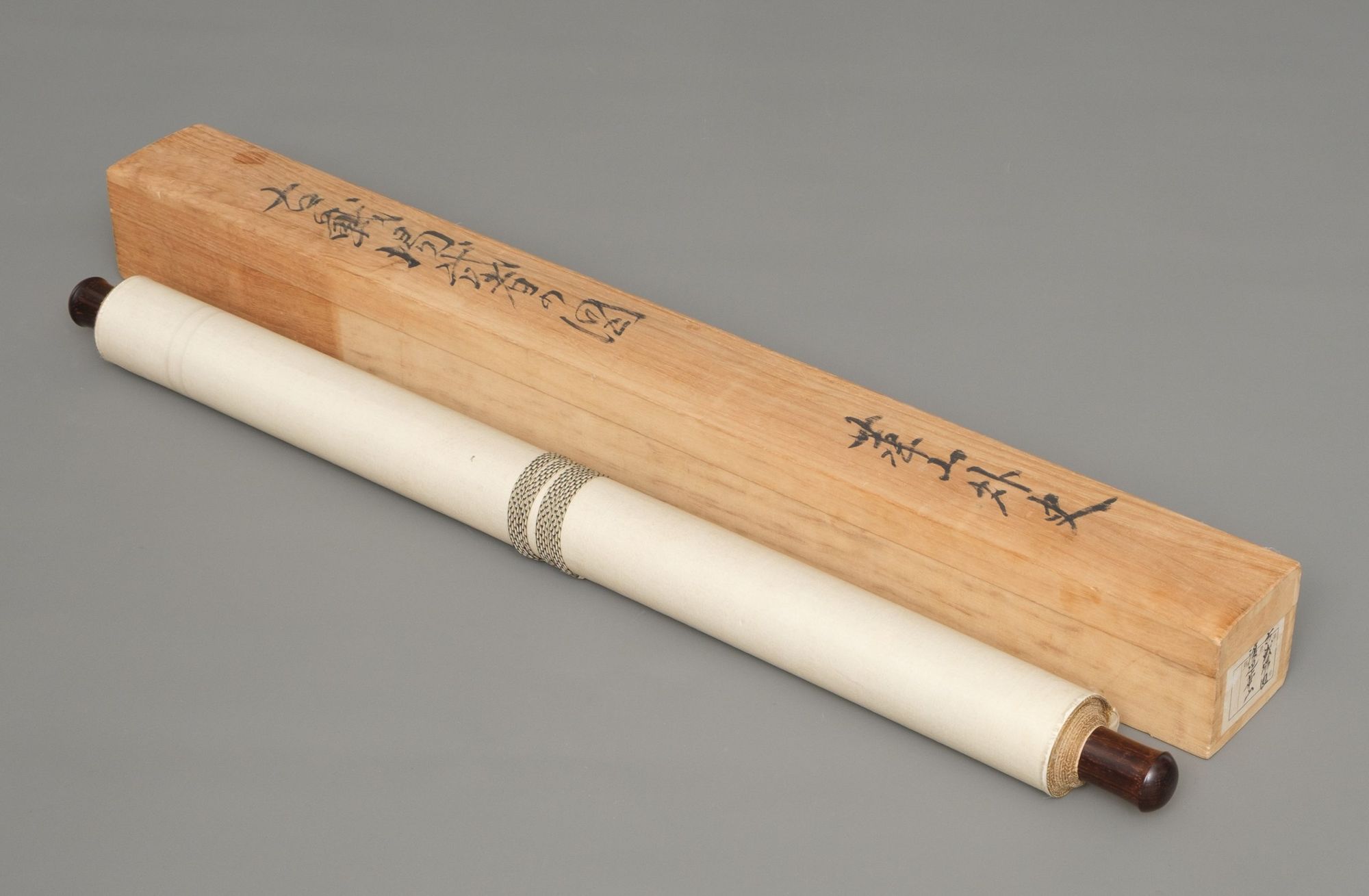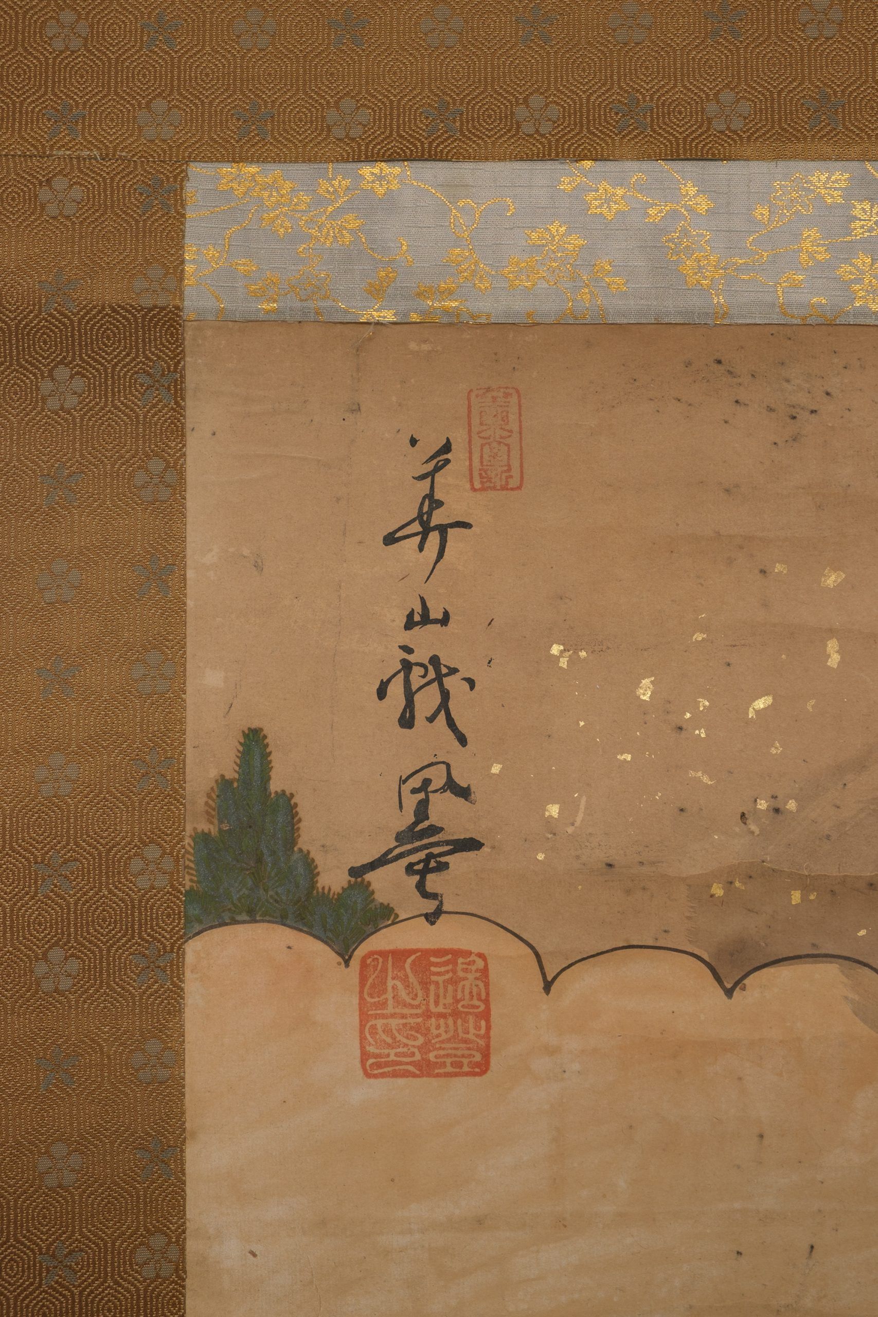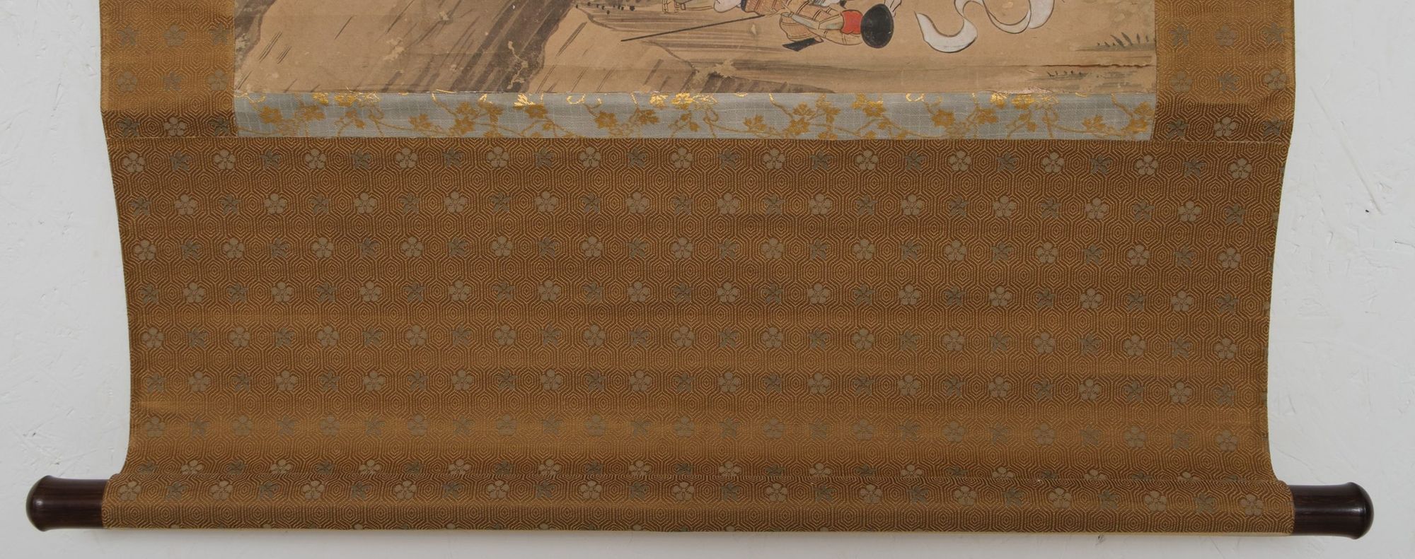 Mounting: Golden and brown brocade silk, with jikusaki 軸先 (roller ends) made of brown wood