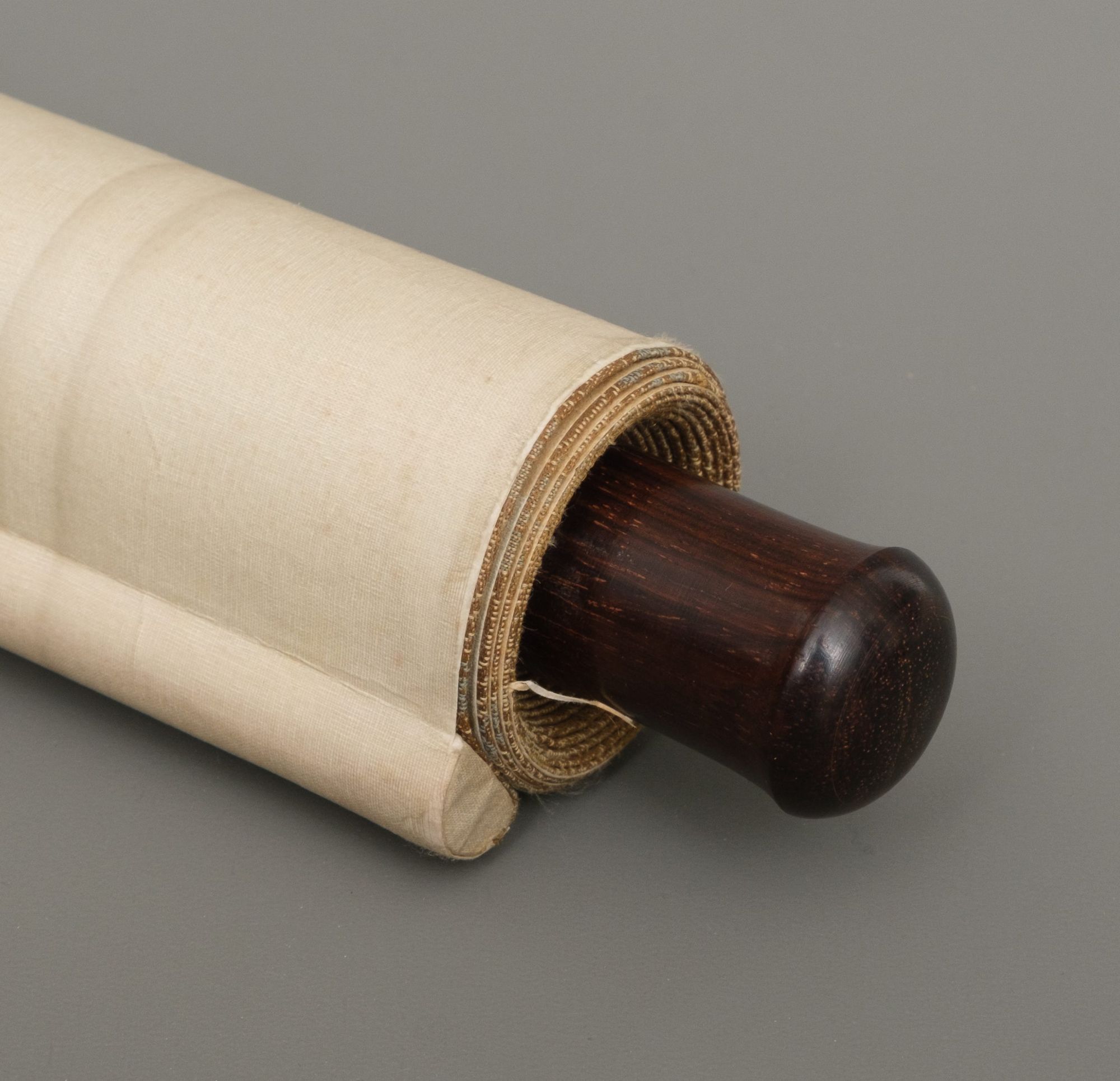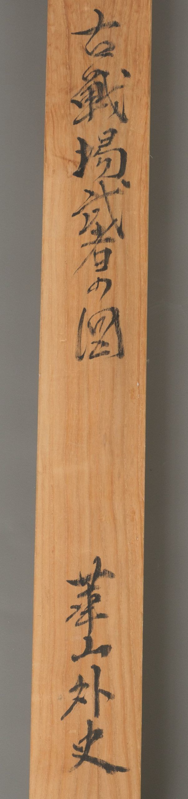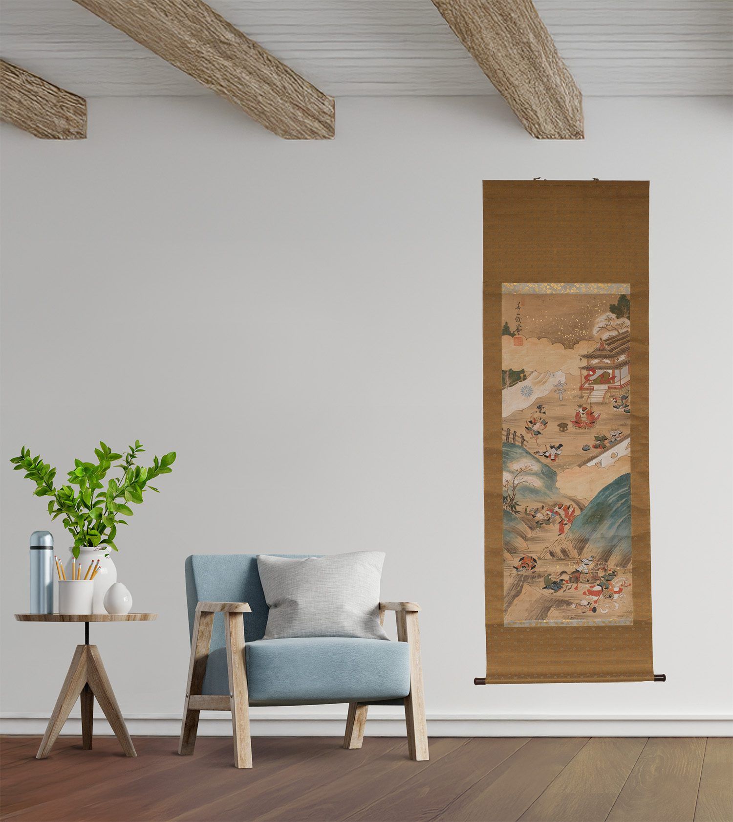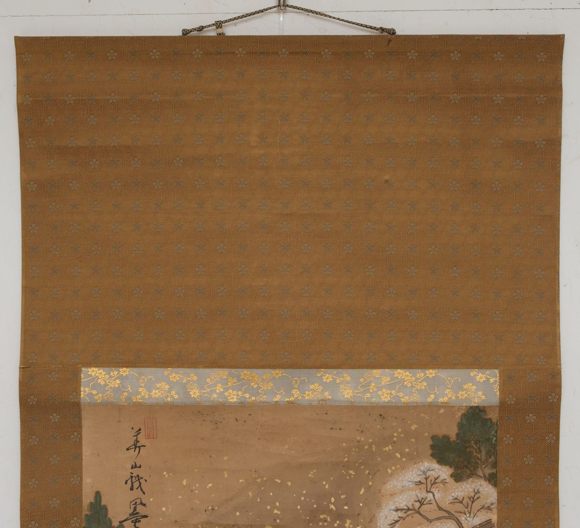 Mounting: Golden and brown brocade silk, with jikusaki 軸先 (roller ends) made of brown wood
