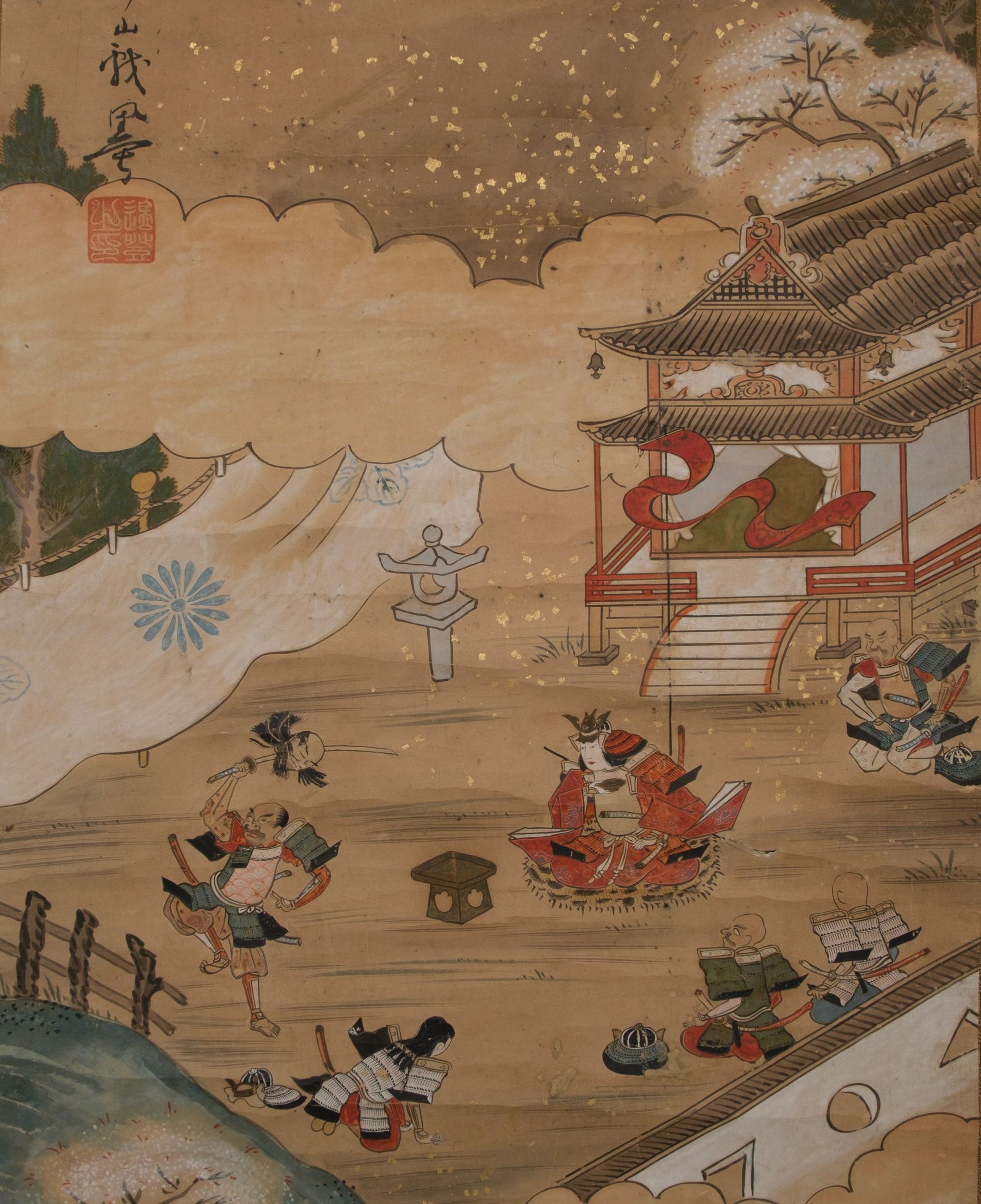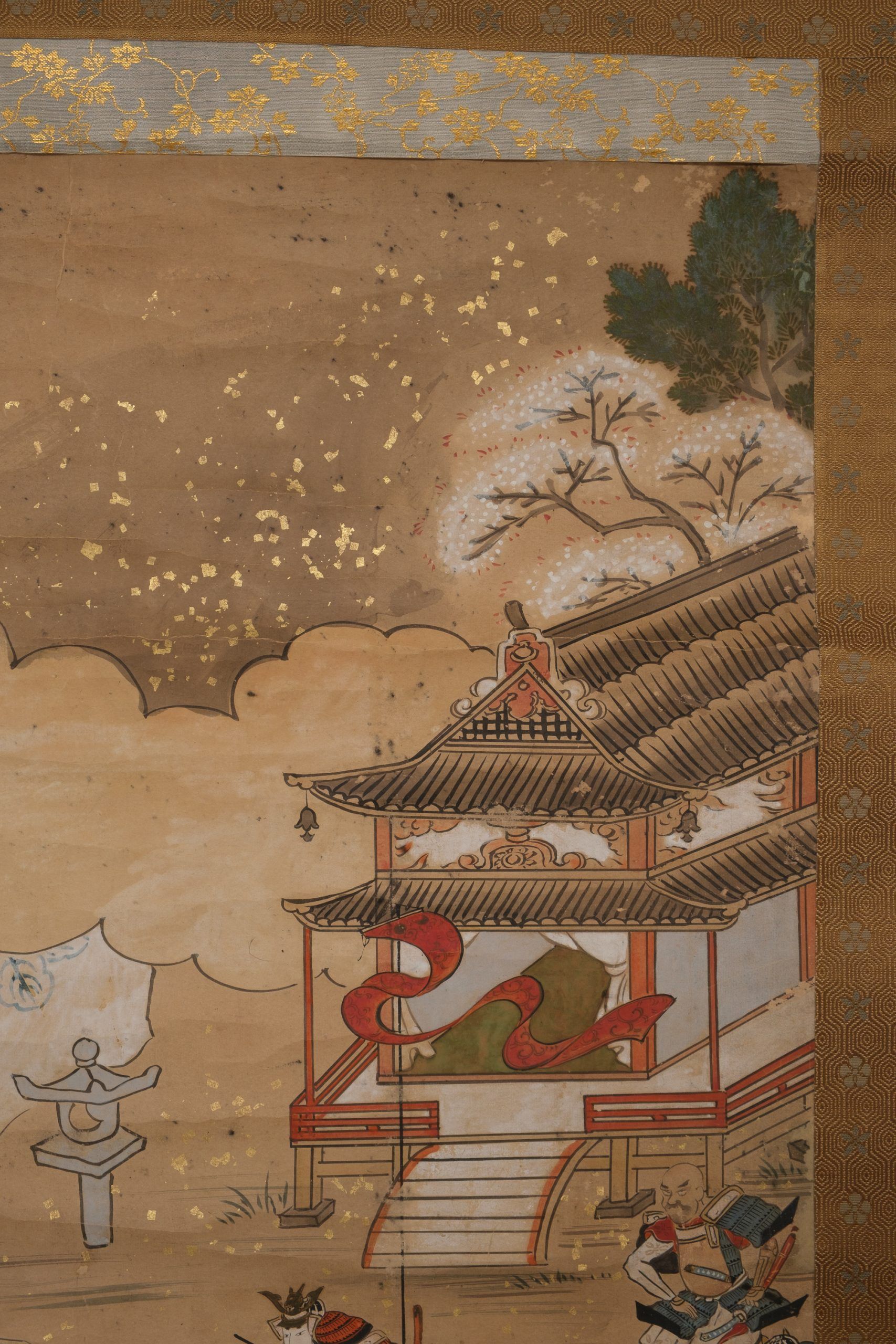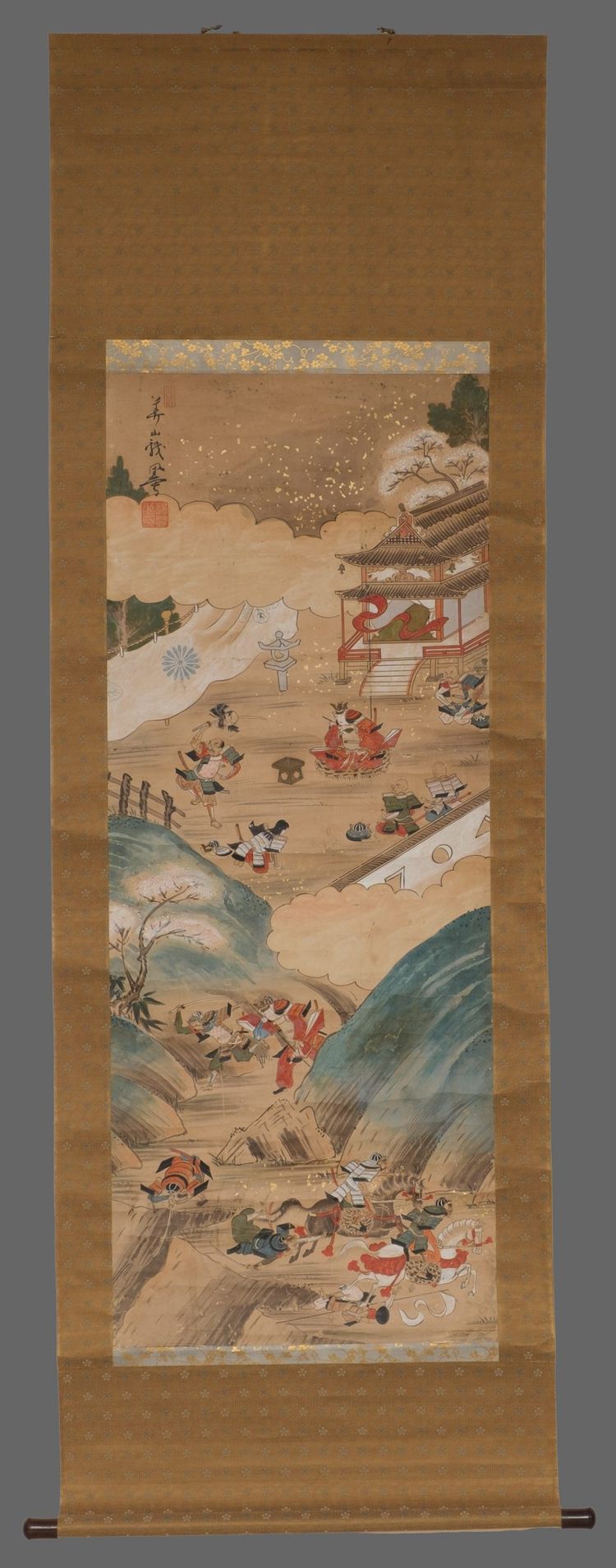 A kakejiku 掛け軸 (hanging scroll) by Watanabe Kazan 渡辺崋山 (1793–1841), featuring two vivid narrative scenes depicting a high-ranking samurai—possibly a commander or even a daimyō 大名.